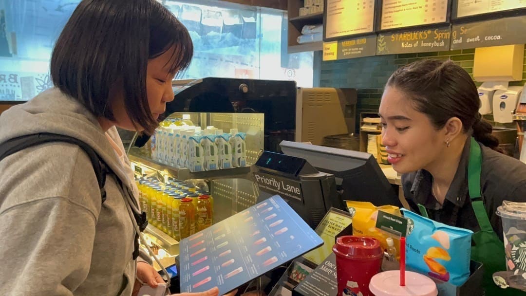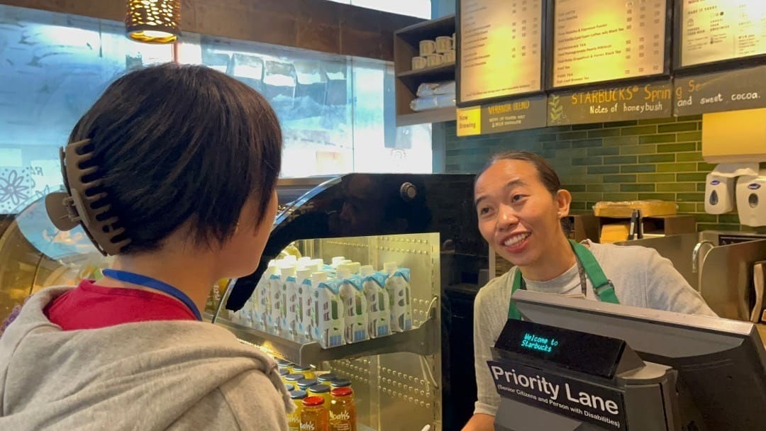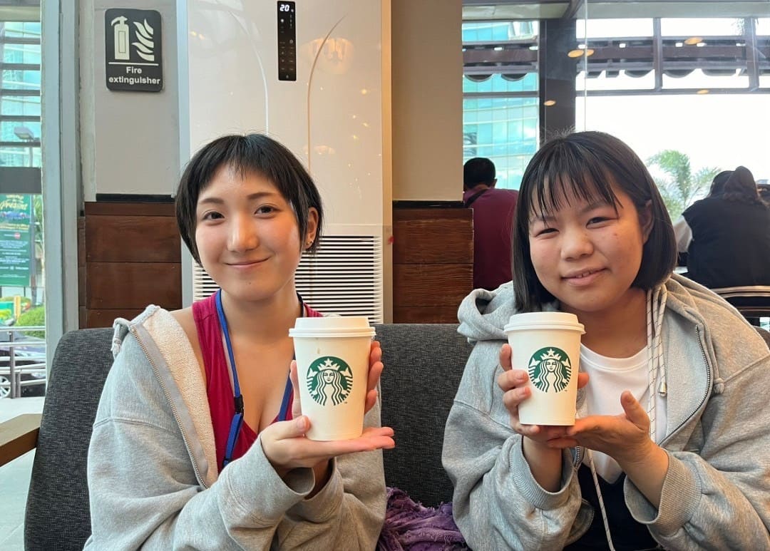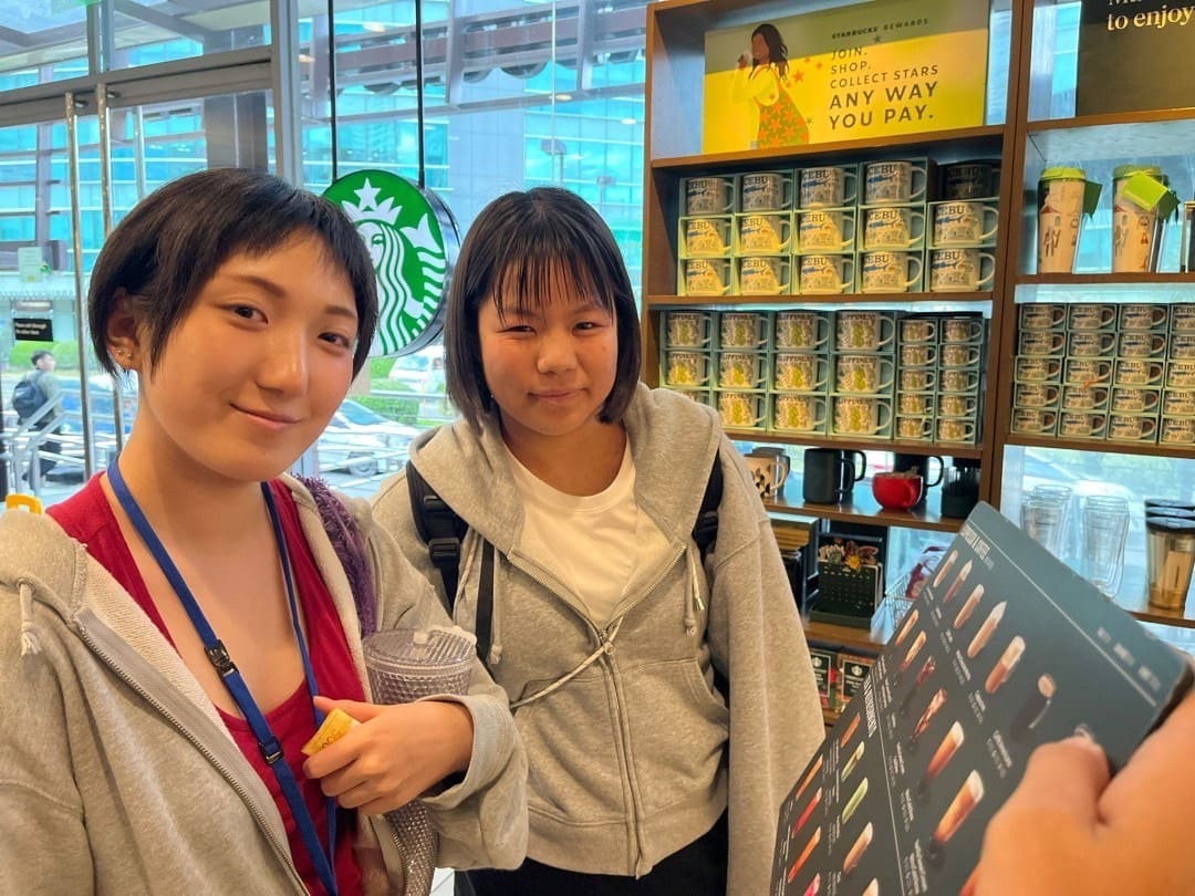 その後、日本でもおなじみ「スターバックスコーヒー」へ♪ここでも英語のオーダーにチャレンジ!映画の感想を英語で語りあう授業です。