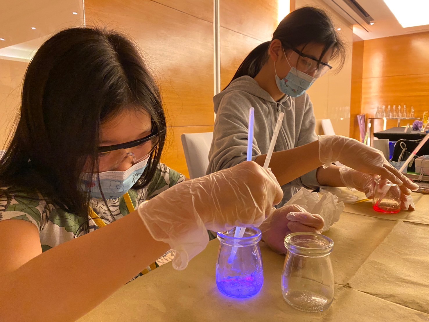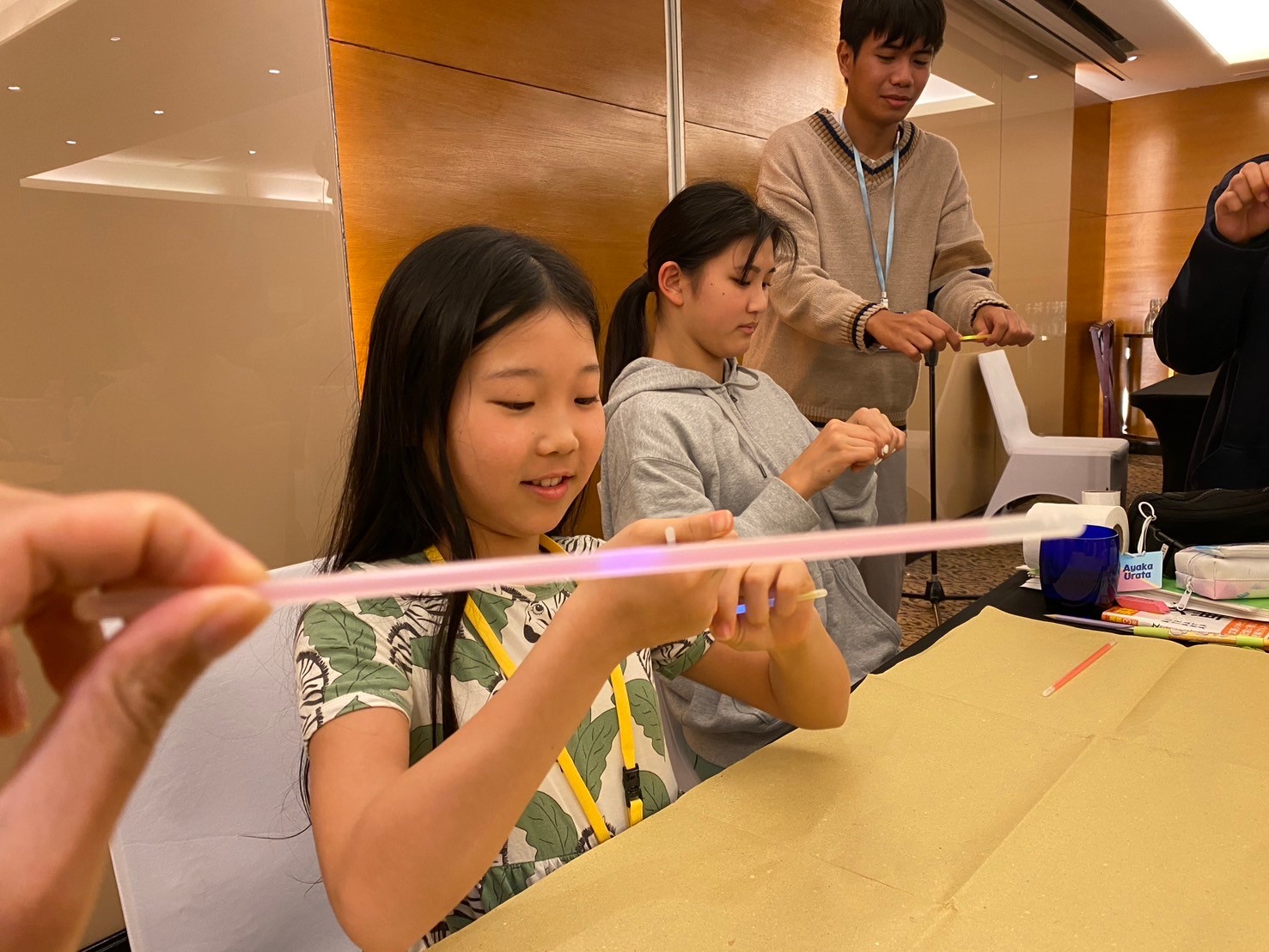 この実験では、光るブレスレットは電気で光るのではなく、化学反応で光っているということが分かりました☆