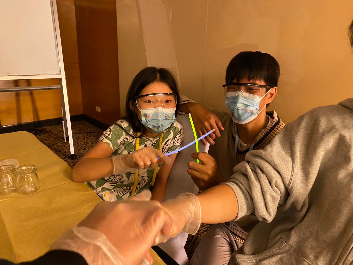 そのブレスレットを切って、中身を取り出し、なぜ光るのかを確かめるというテーマです。ゴーグルを着けて、準備万端‼