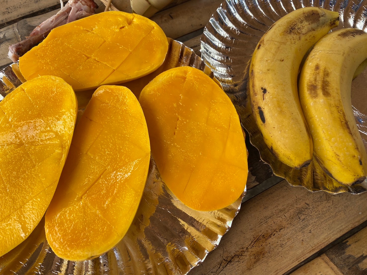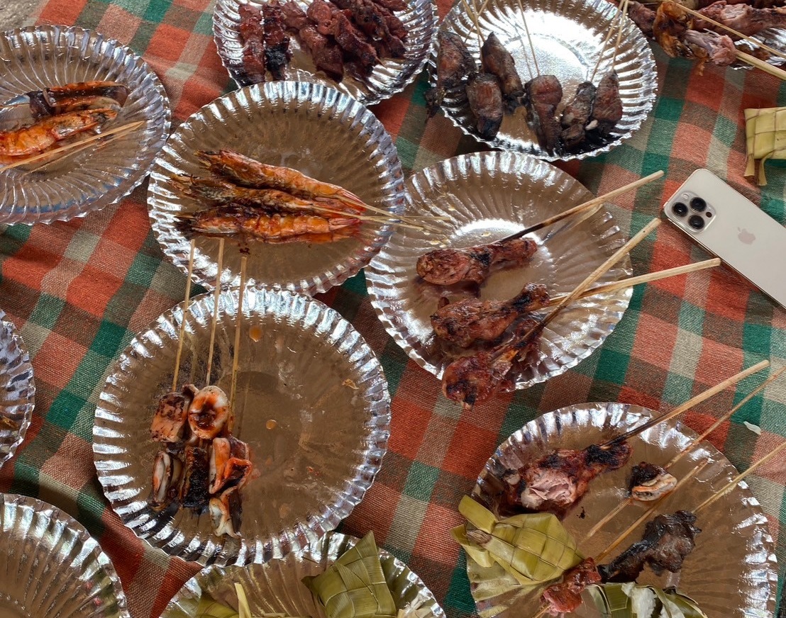 海老・イカ・チキンの串焼きのほか、バナナの葉で包んだライス、マンゴー・バナナ・パイナップルと地場フルーツのフレッシュな甘さに感動!