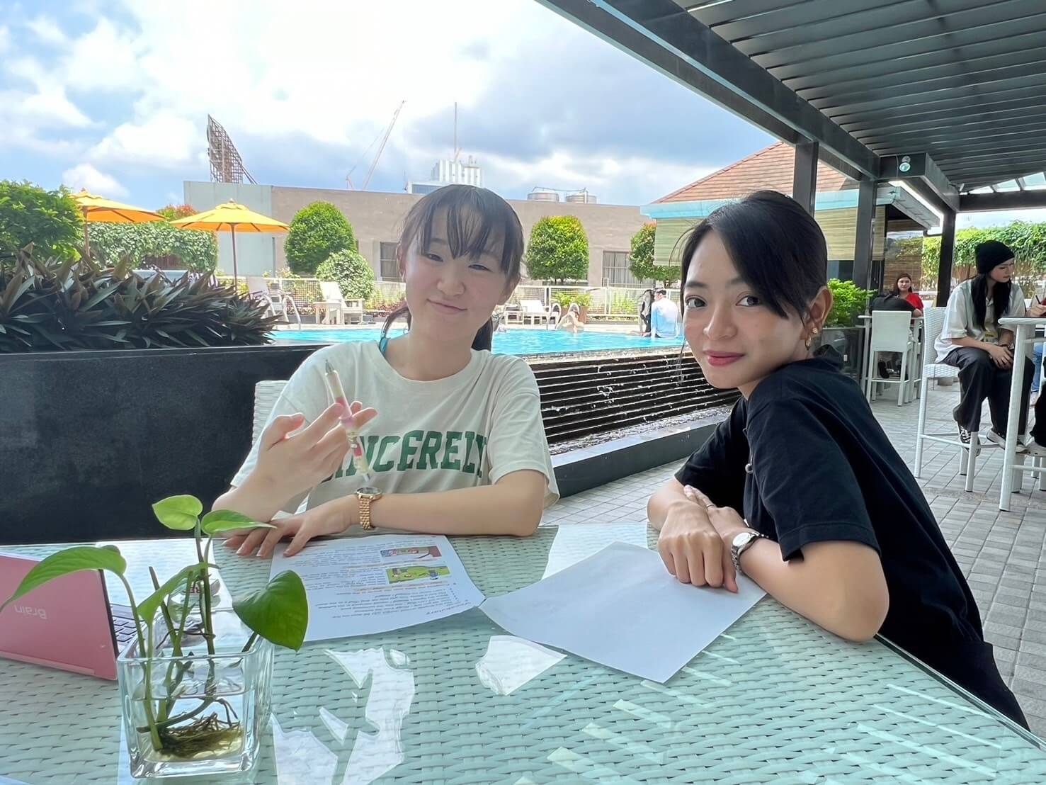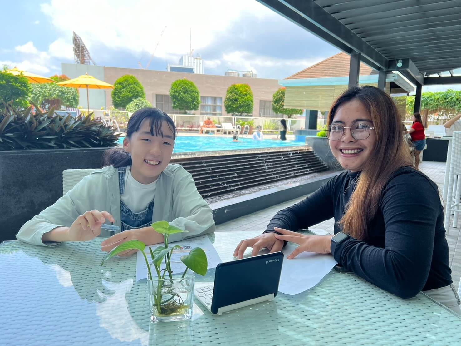 クラスルームの中だけでなく、風が心地いい日はプールサイドテラスでレッスン。気分転換にもなります。また、空調が寒いと感じたら、さわやかなテラスに出て、心地よく授業が受けられるのもTAKE CEBU上質ホテル校ならでは!この、クラスルーム目の前のプールサイドでは、1on1レッスンだけでなく、グループクラスを行うこともあります。そしてクラス後は、子供たちがプールへザブーン!!まさにリゾート留学満喫(*^^)v