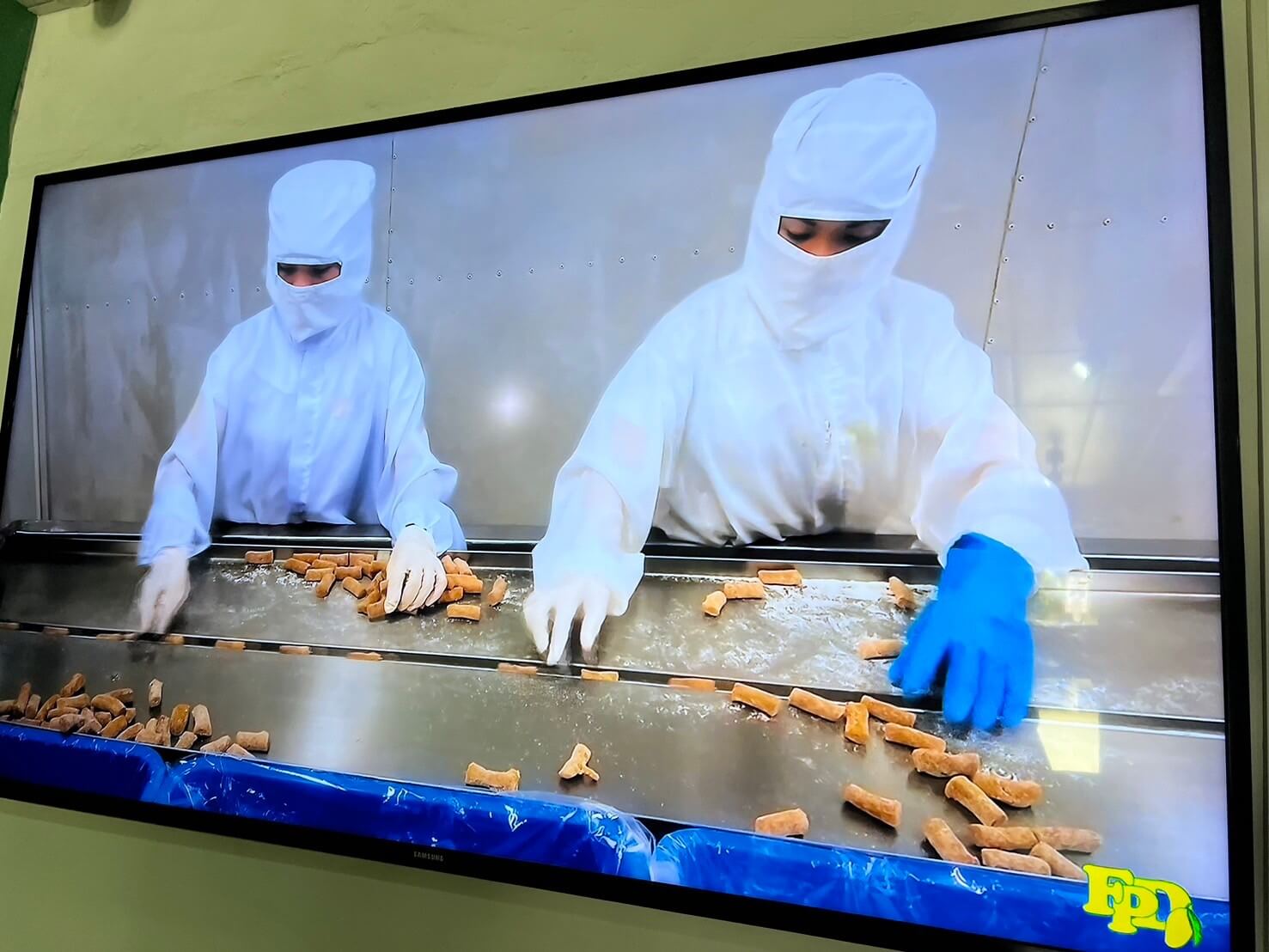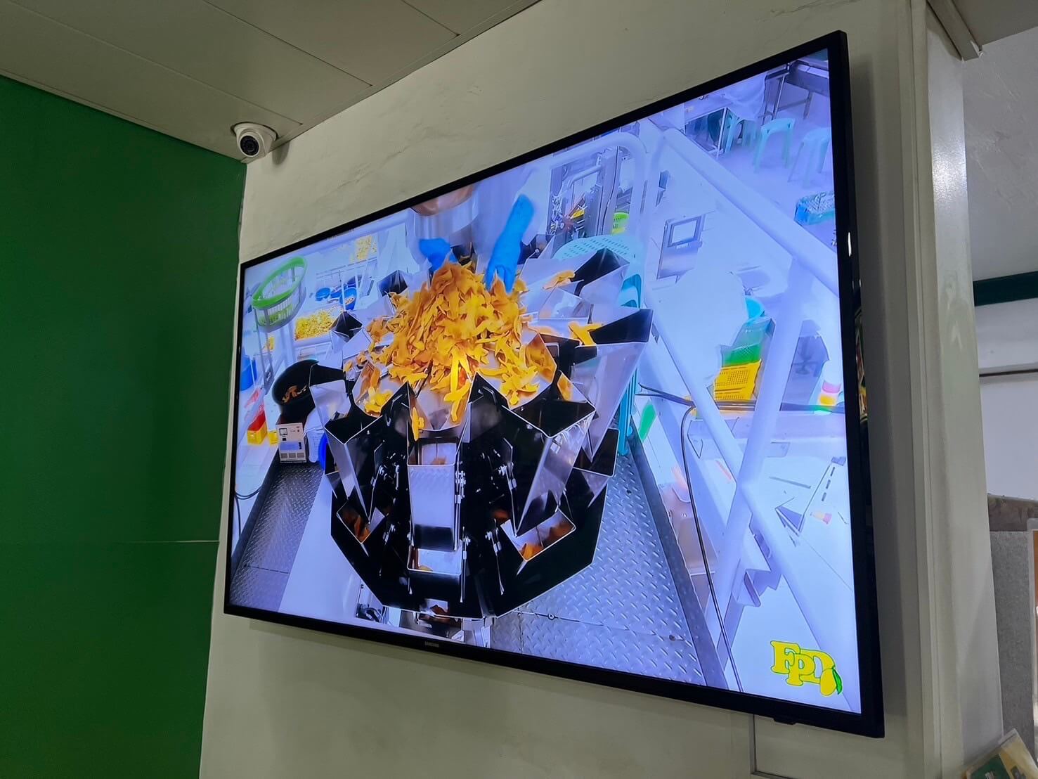 工場見学はできませんが、7Dドライマンゴーの製造工程や工場内の様子がビデオモニターで映し出されています。人の手によって丁寧に作られる作業工程はとても感動的で、私たちスタッフ一行は思わずモニターにクギ付けとなってしまいました。