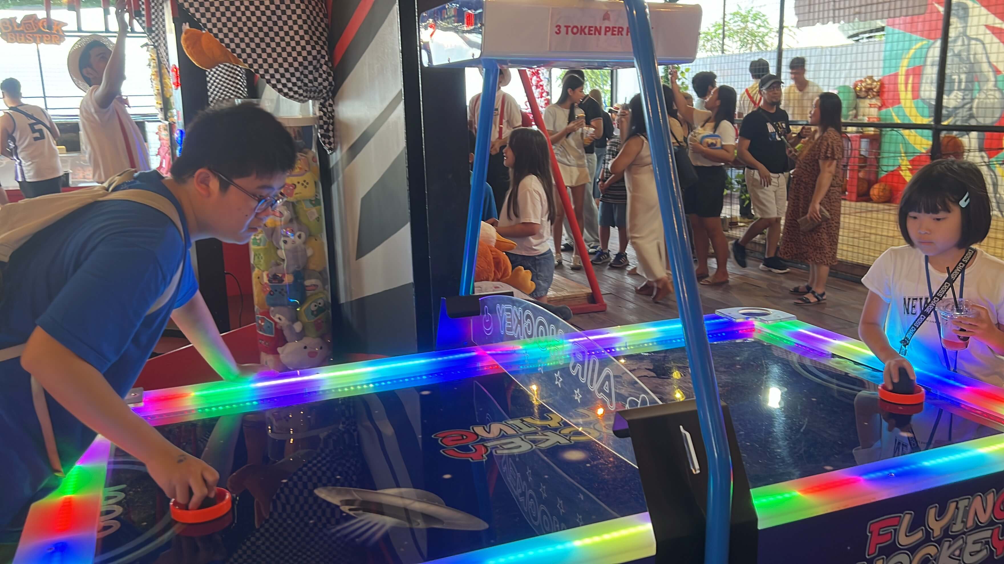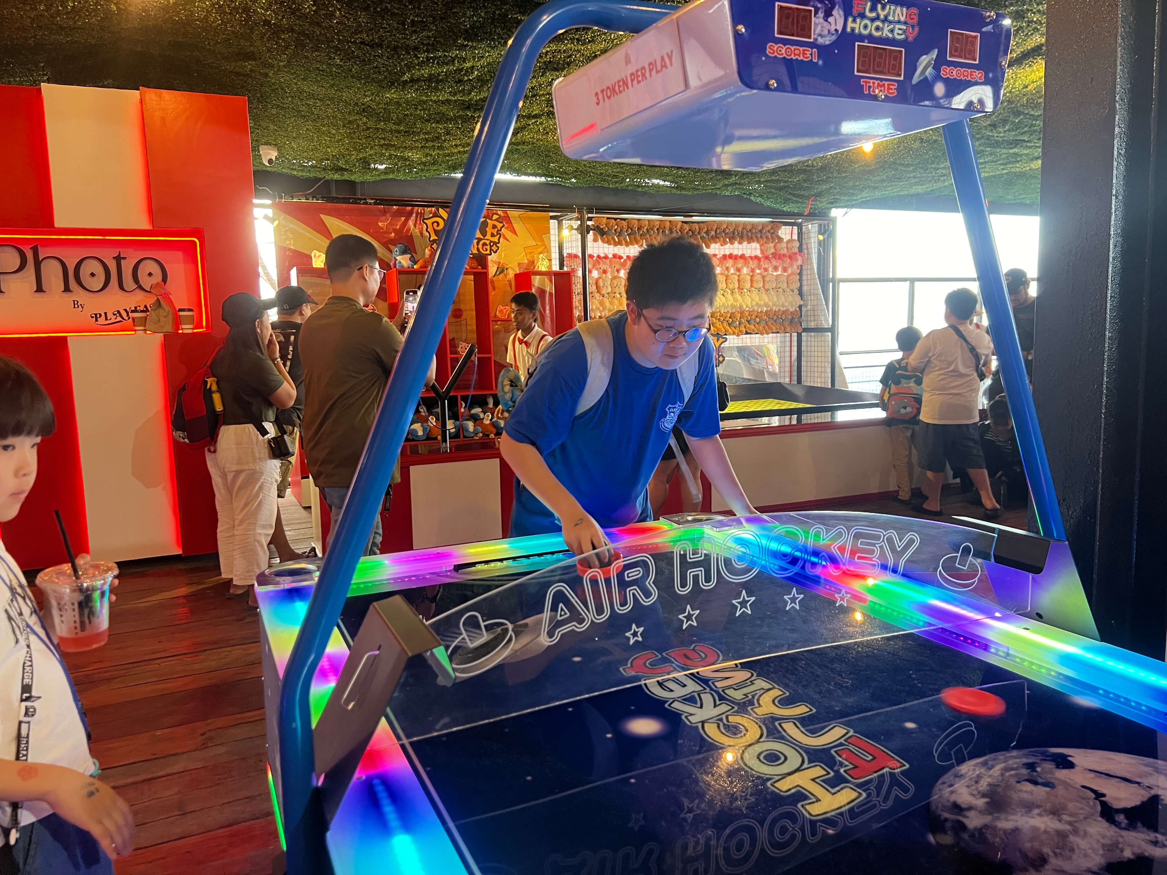 クレーンゲームはセブでもメジャー。エアホッケーでは白熱の対戦を繰り広げました。