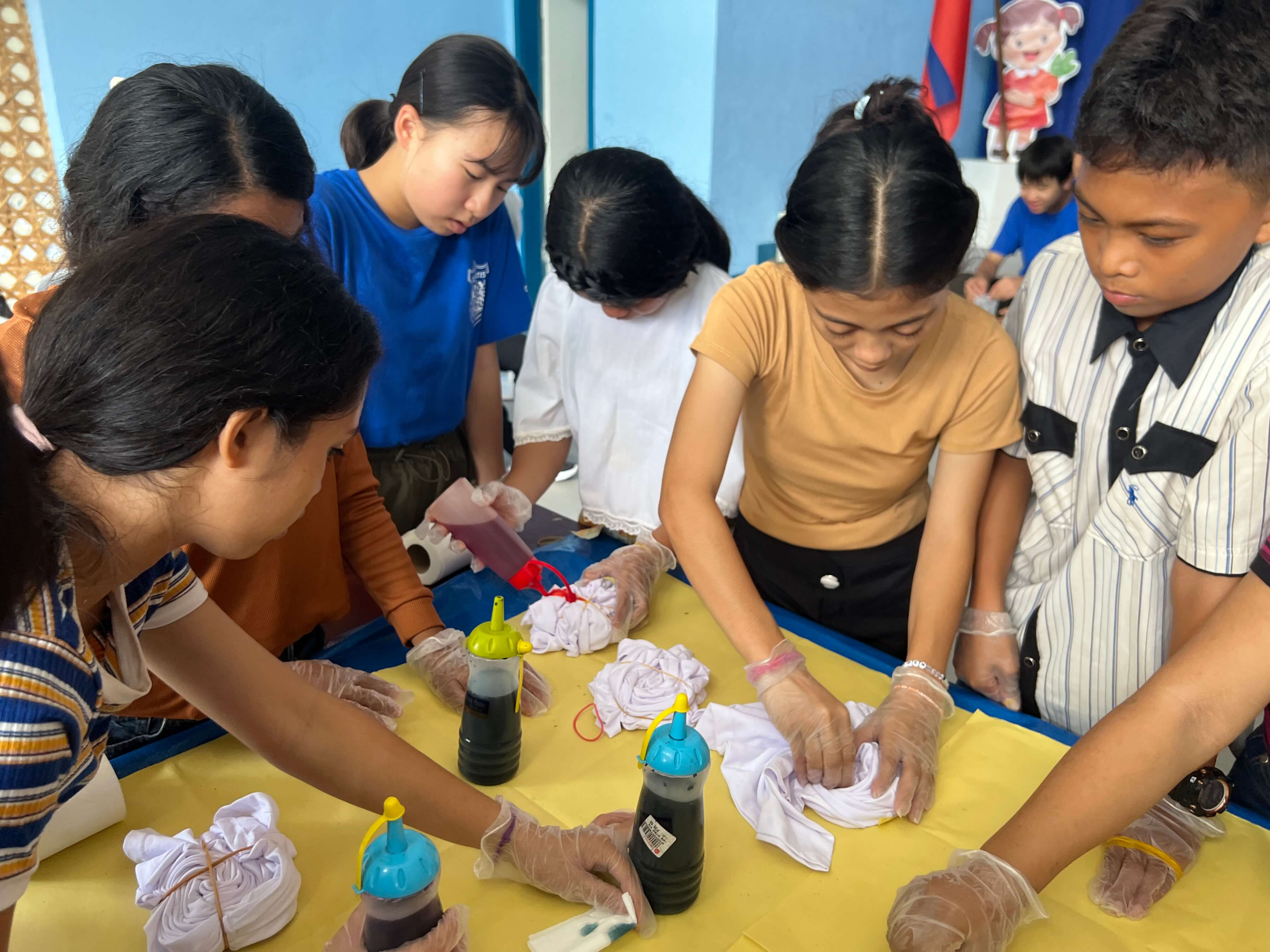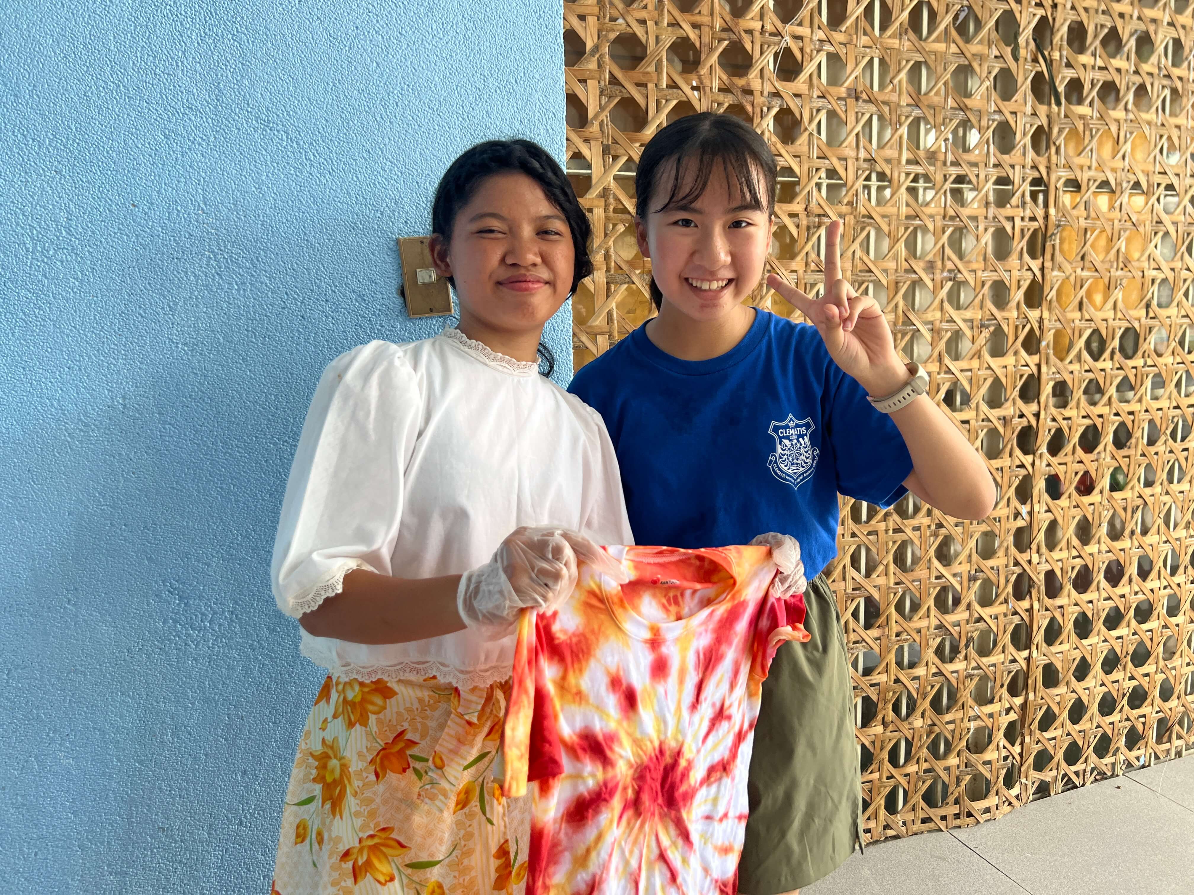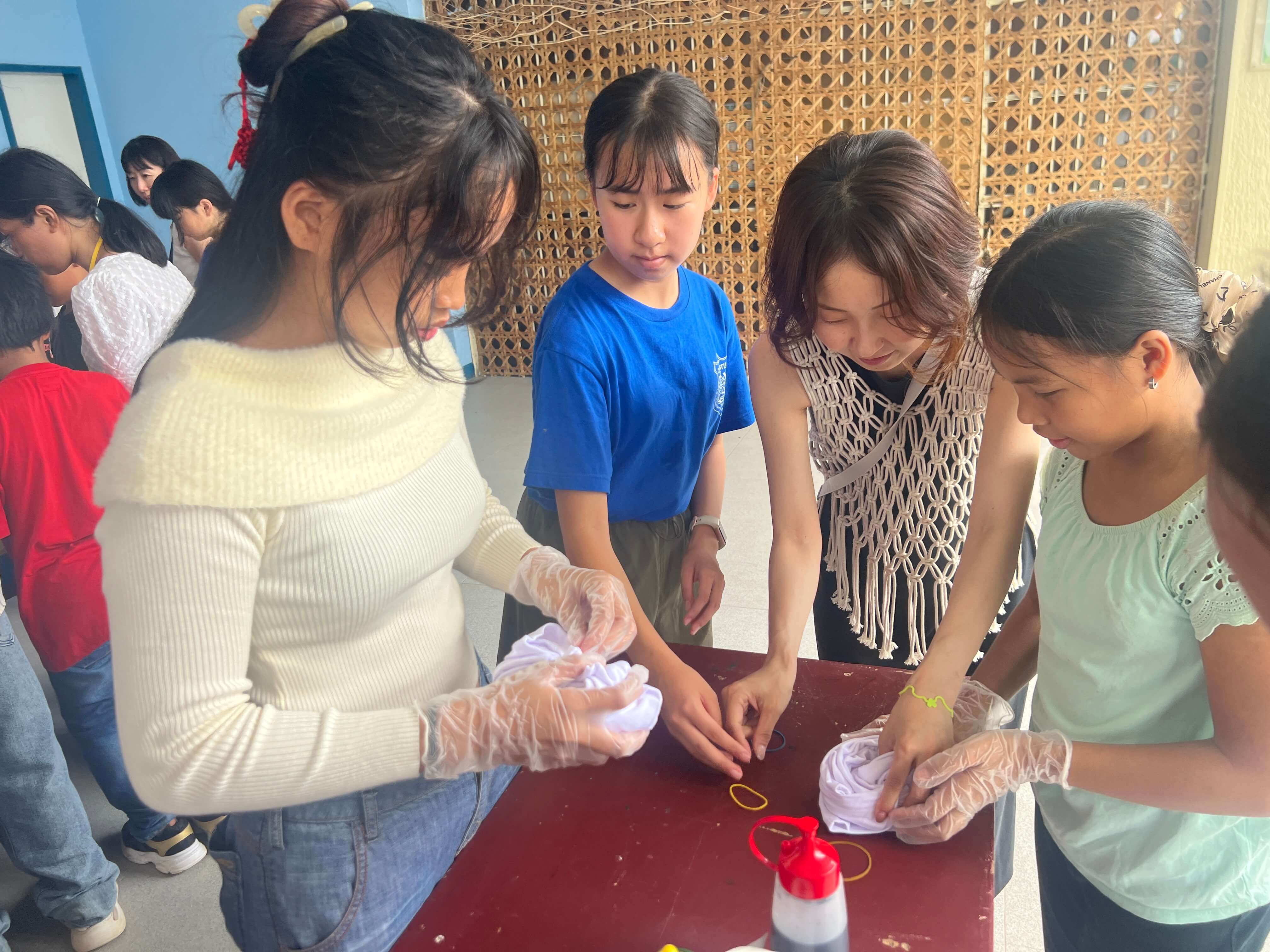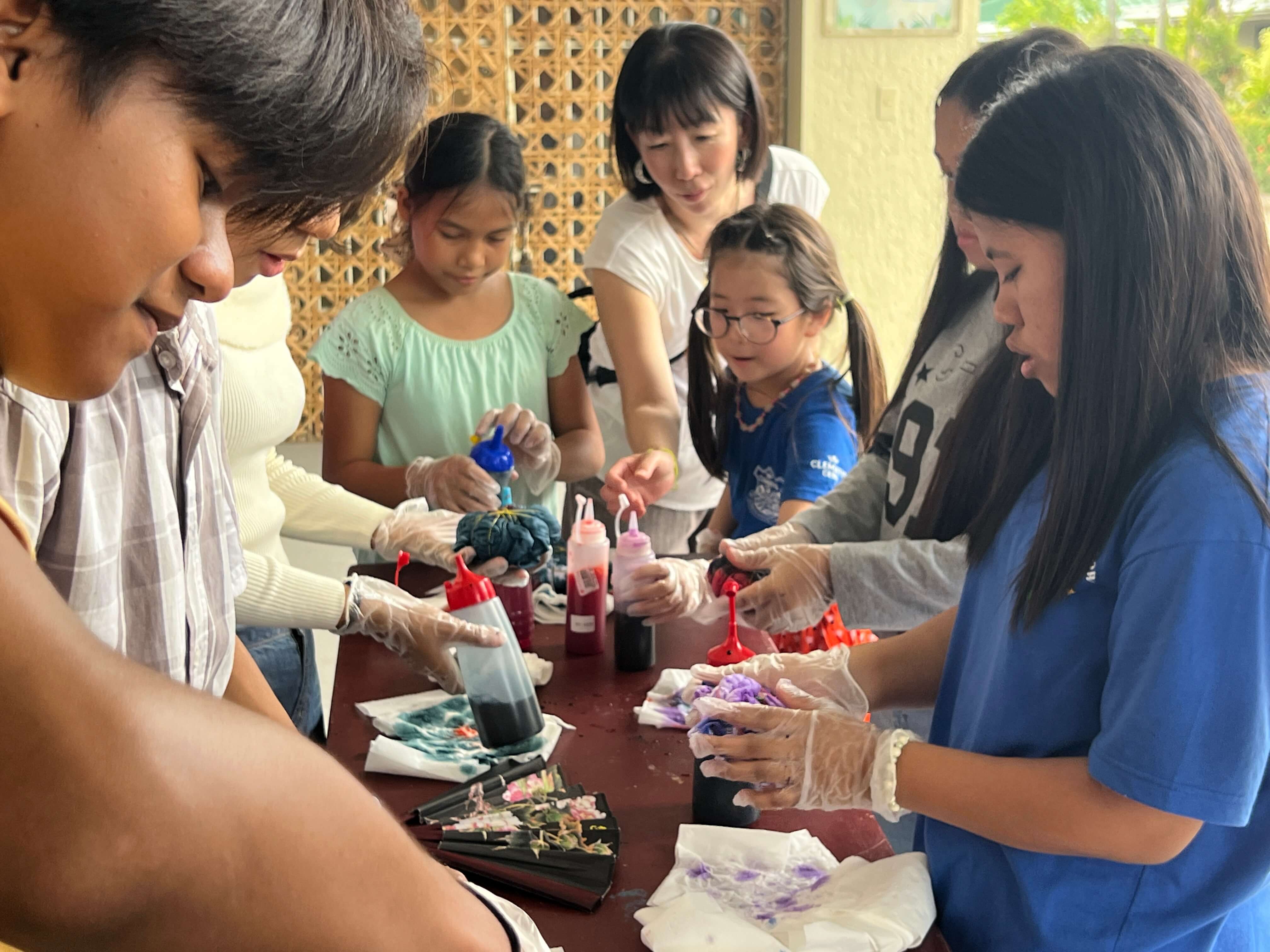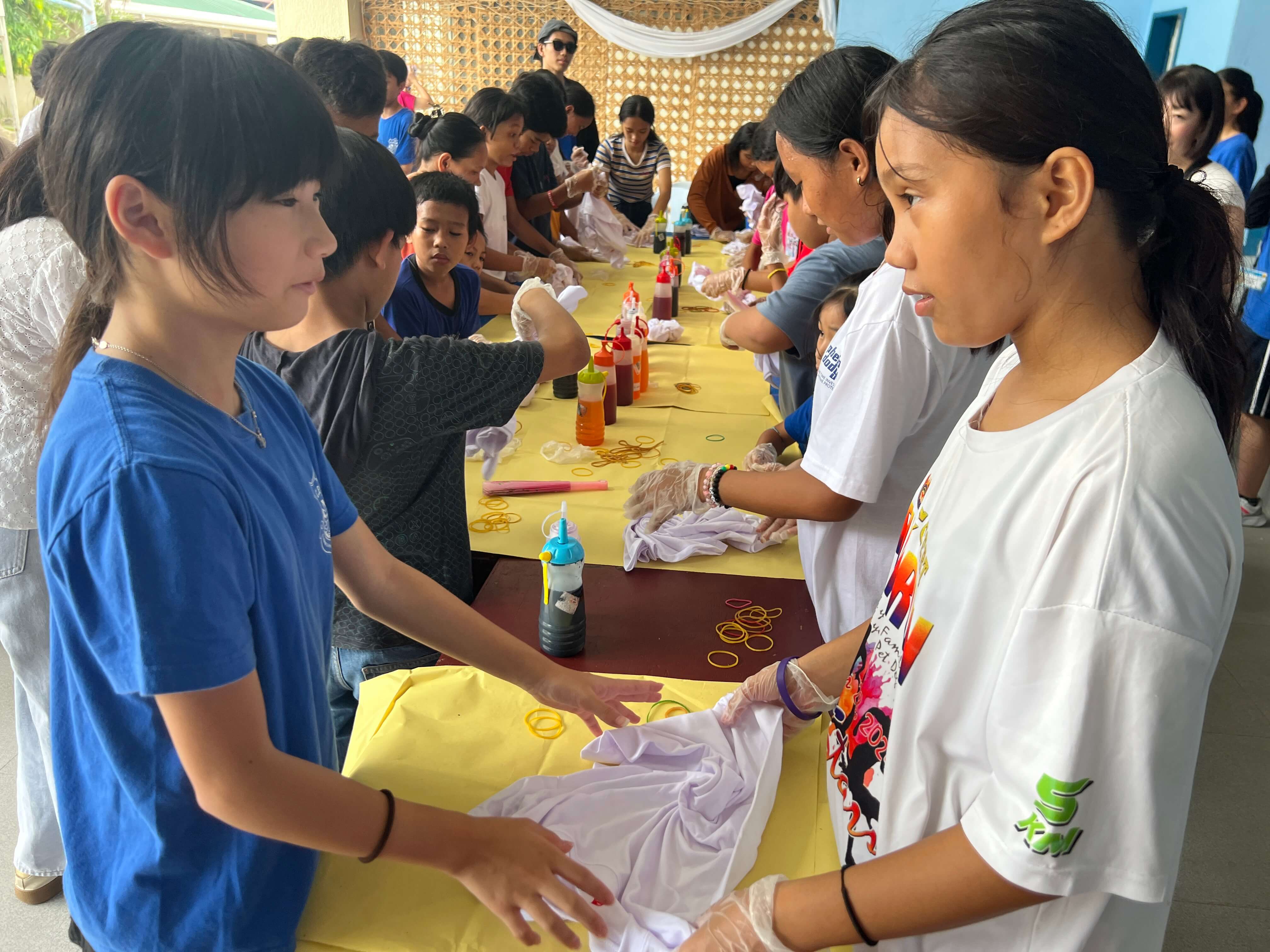 孤児院の皆さんに、Tシャツをタコ糸や輪ゴムで縛る方法や、染料をかけて染め上げていく行程を丁寧にレクチャーしました。