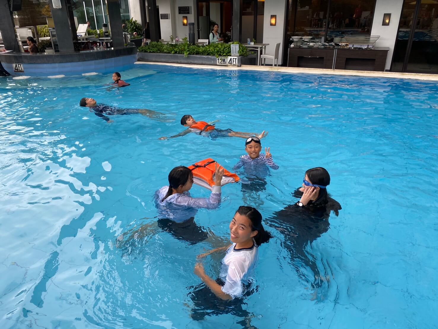 この日は朝からカラッと晴れて、気温もちょうどよくて最高!みんな大はしゃぎで水着に着替え、ジュニアキャンプ恒例のプールアクティビティがスタート!