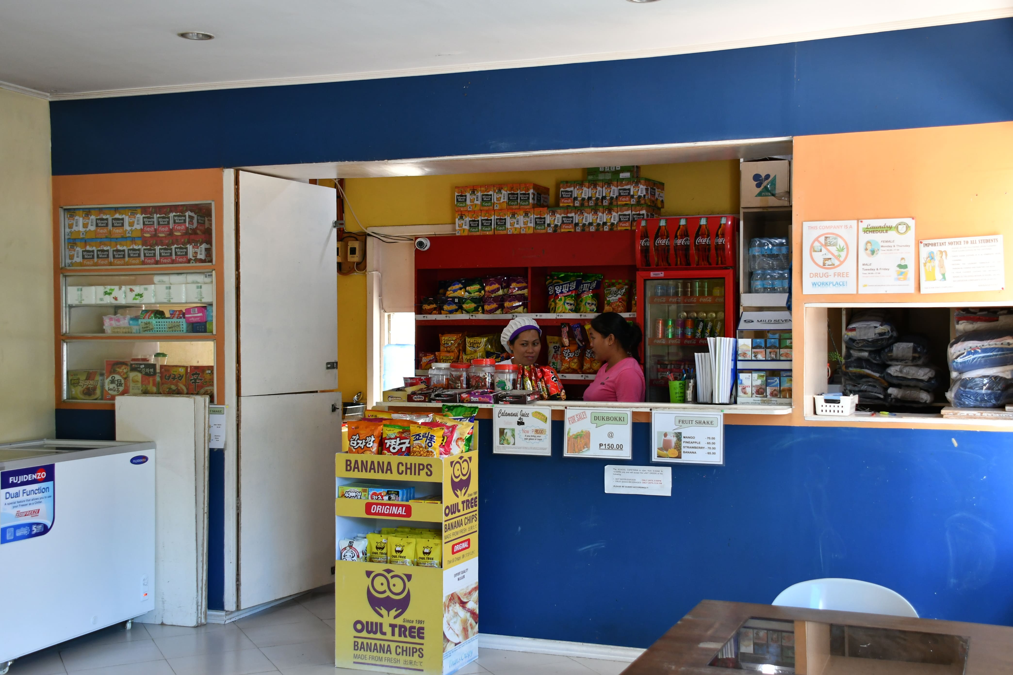 平日8:00-22:00、土曜日 8:00-20:00(13:00-15:00は休憩時間の為Close)で営業。日曜日と祝日はCloseです。お菓子、カップラーメン、ドリンク、アイスクリーム、ティッシュペーパー、歯磨き粉、生理用品、ノート、ペン等が売られています。