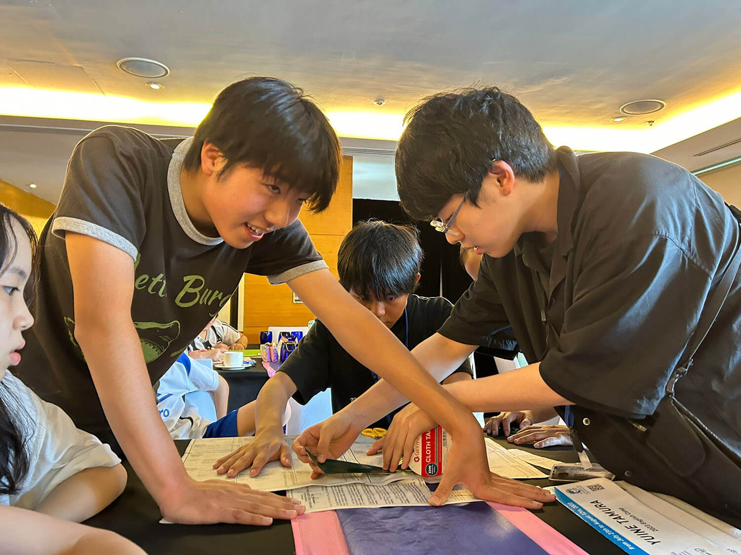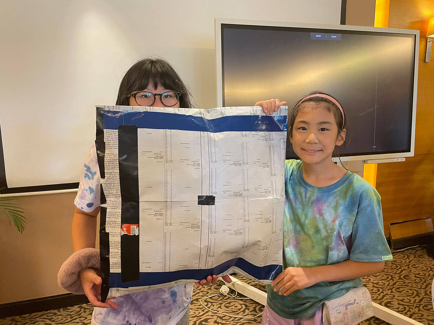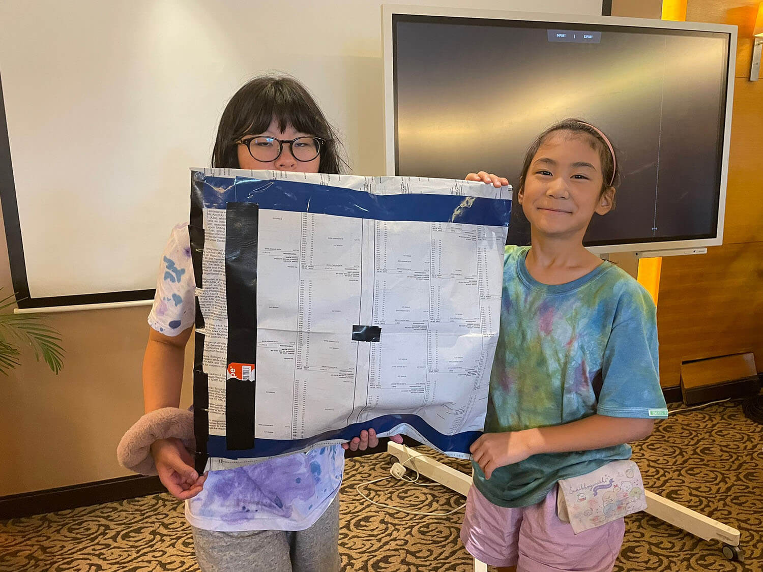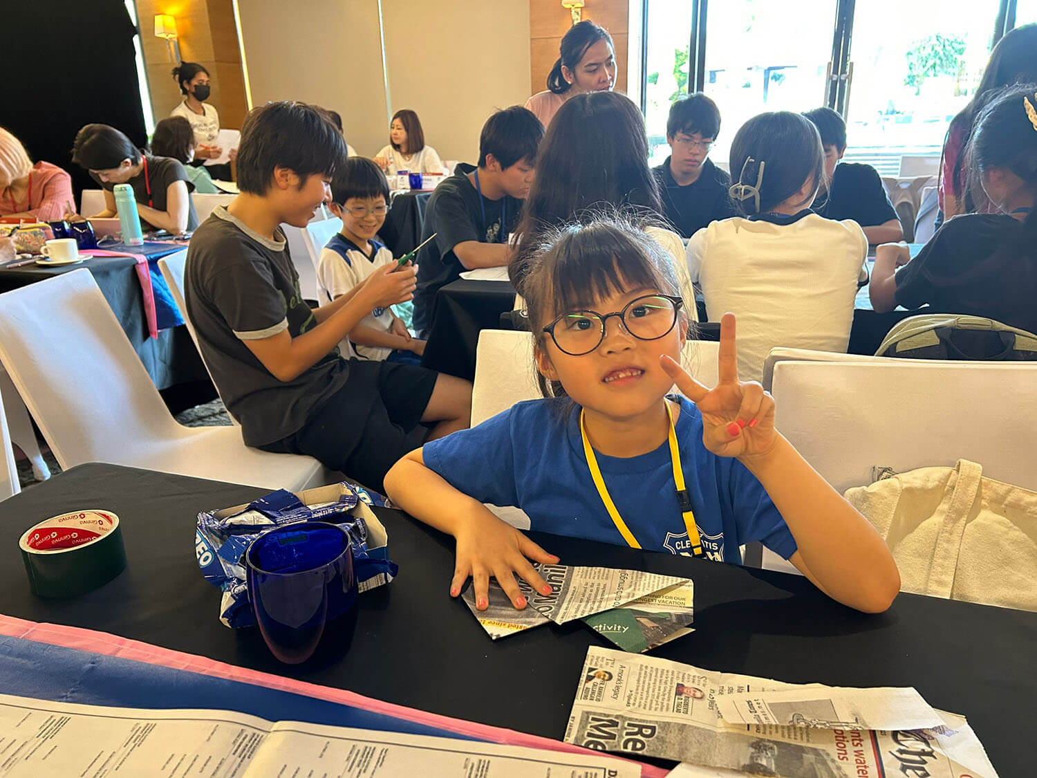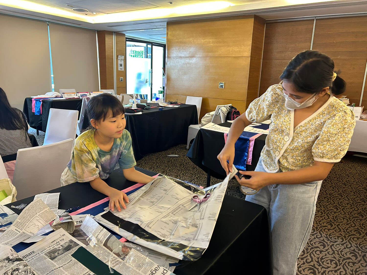 新聞紙をカラーテープで繋ぎ合わせます。