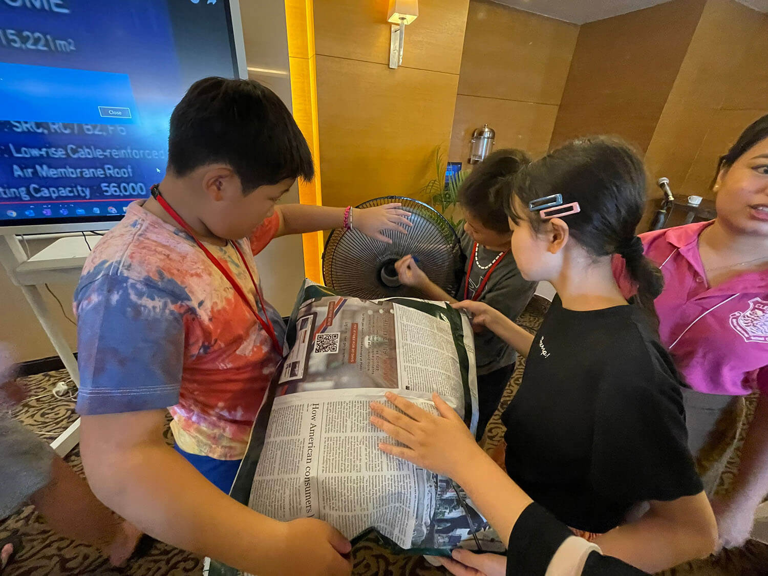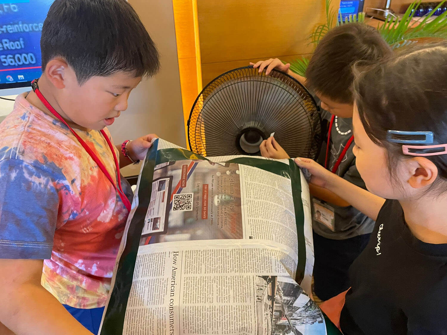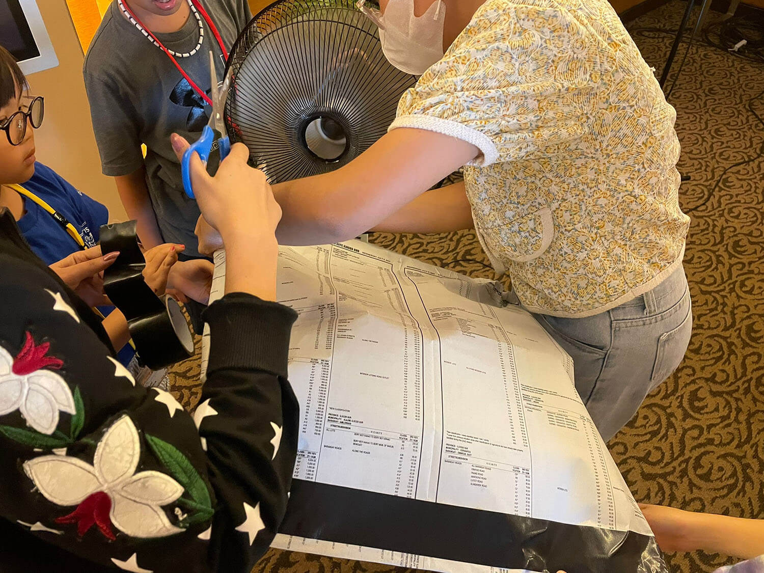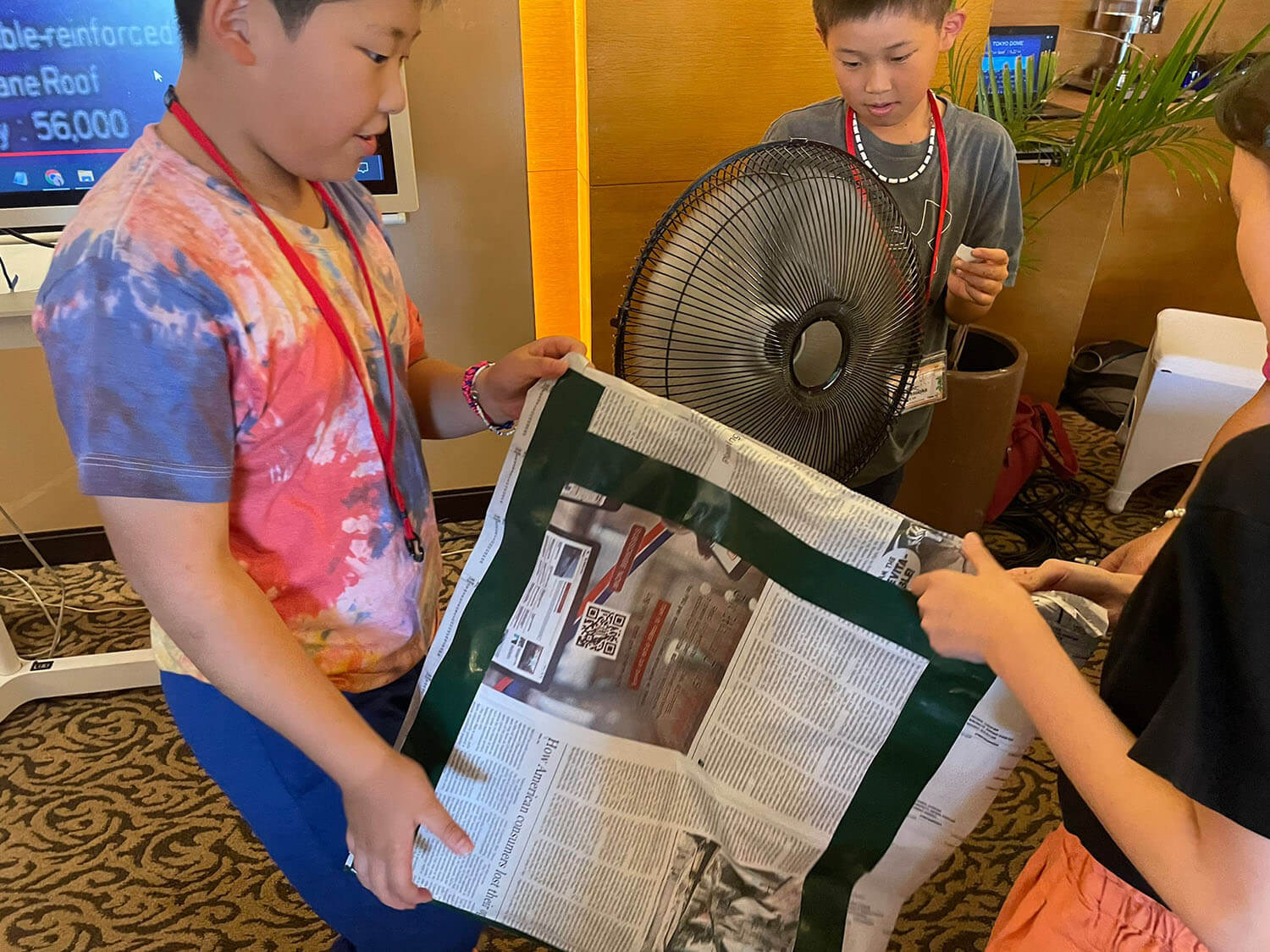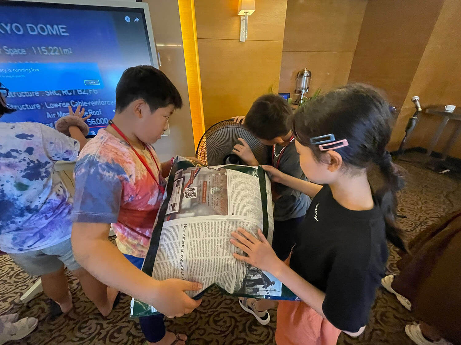 扇風機で空気を送り込むと、たちまち新聞紙が膨らみ、エアードームが完成!
