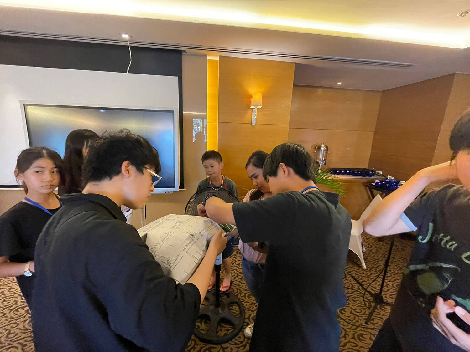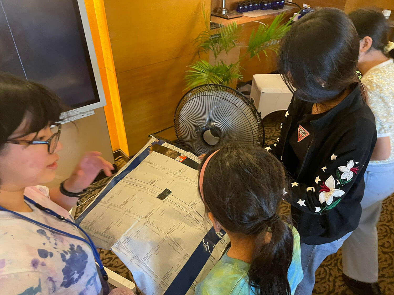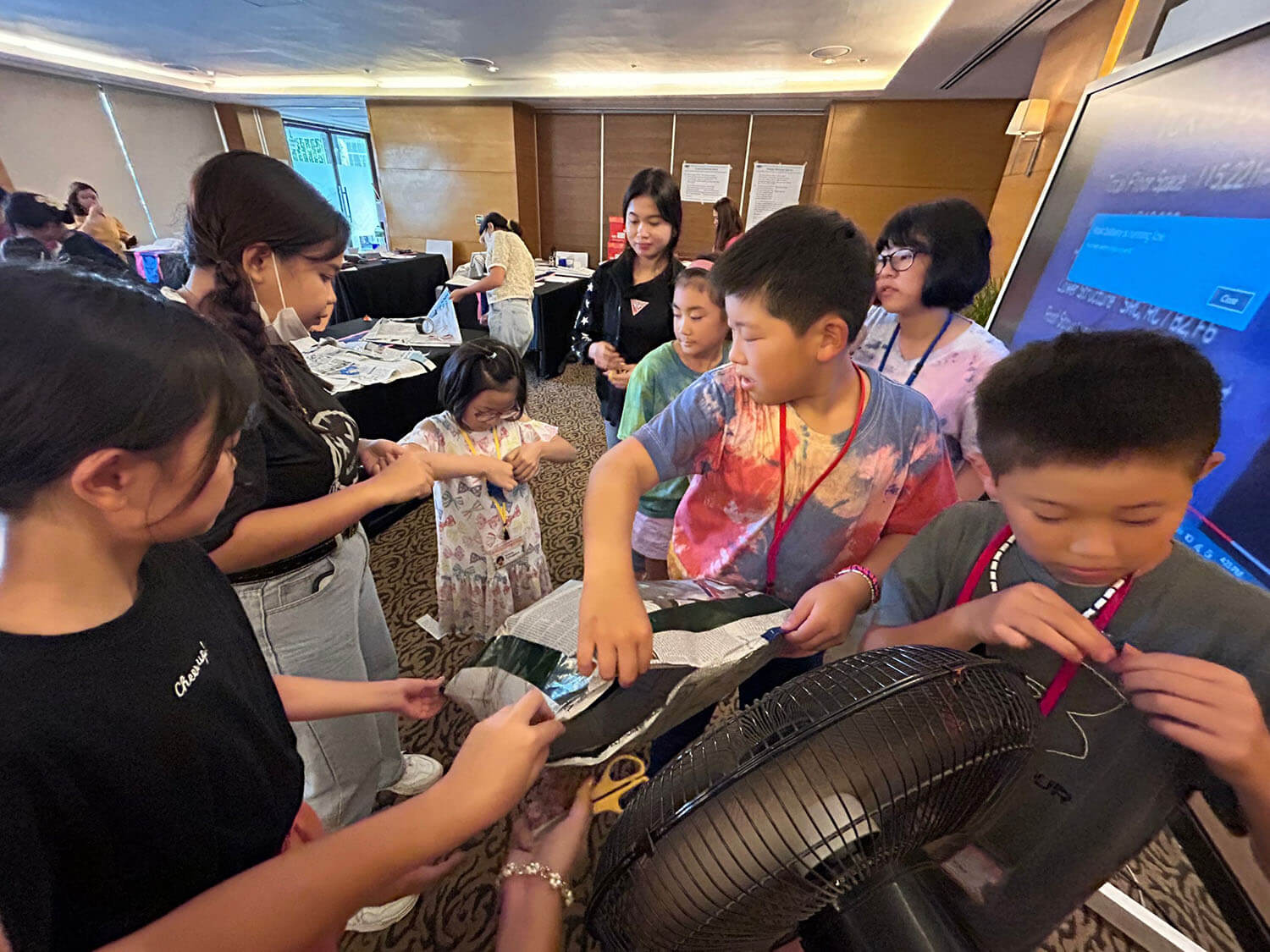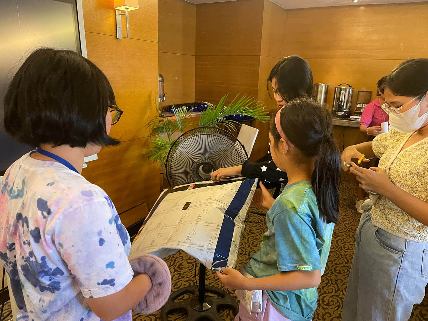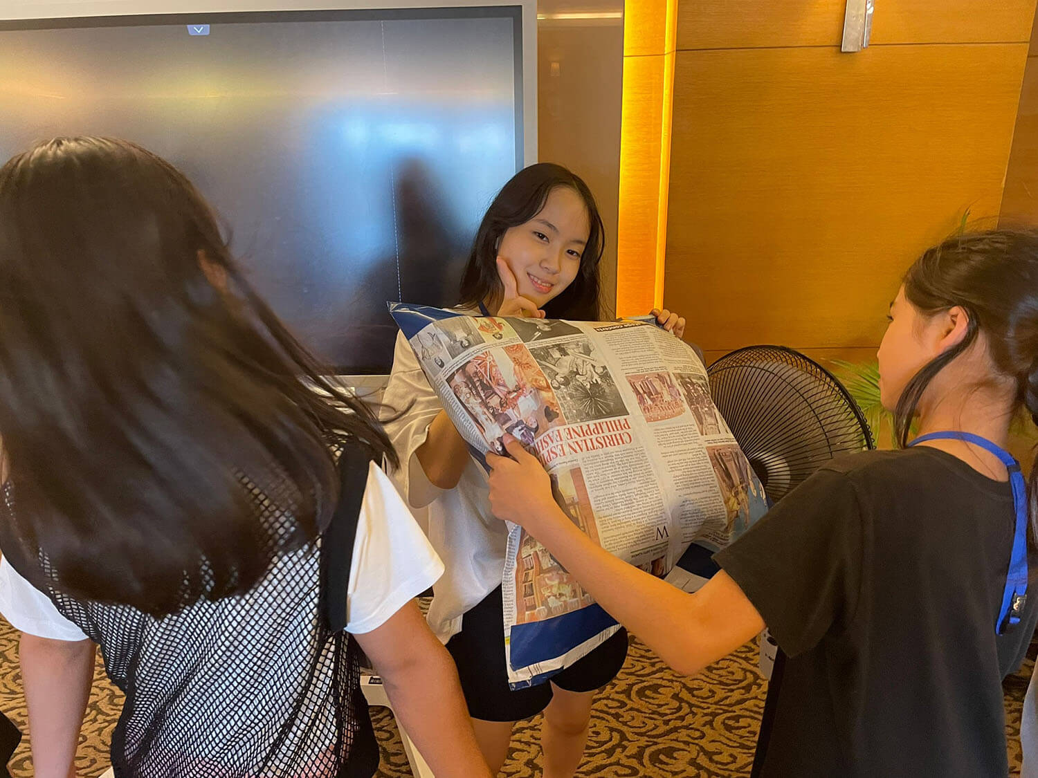 扇風機で空気を送り込むと、たちまち新聞紙が膨らみ、エアードームが完成!