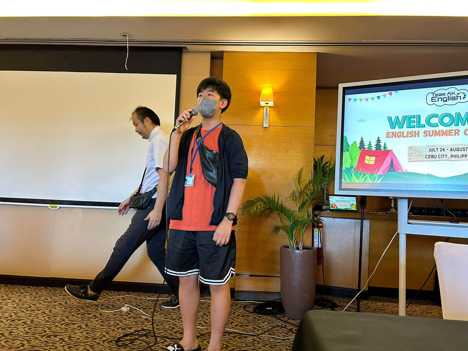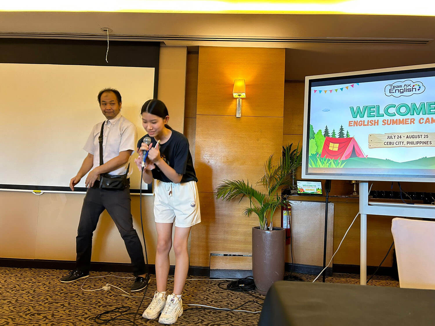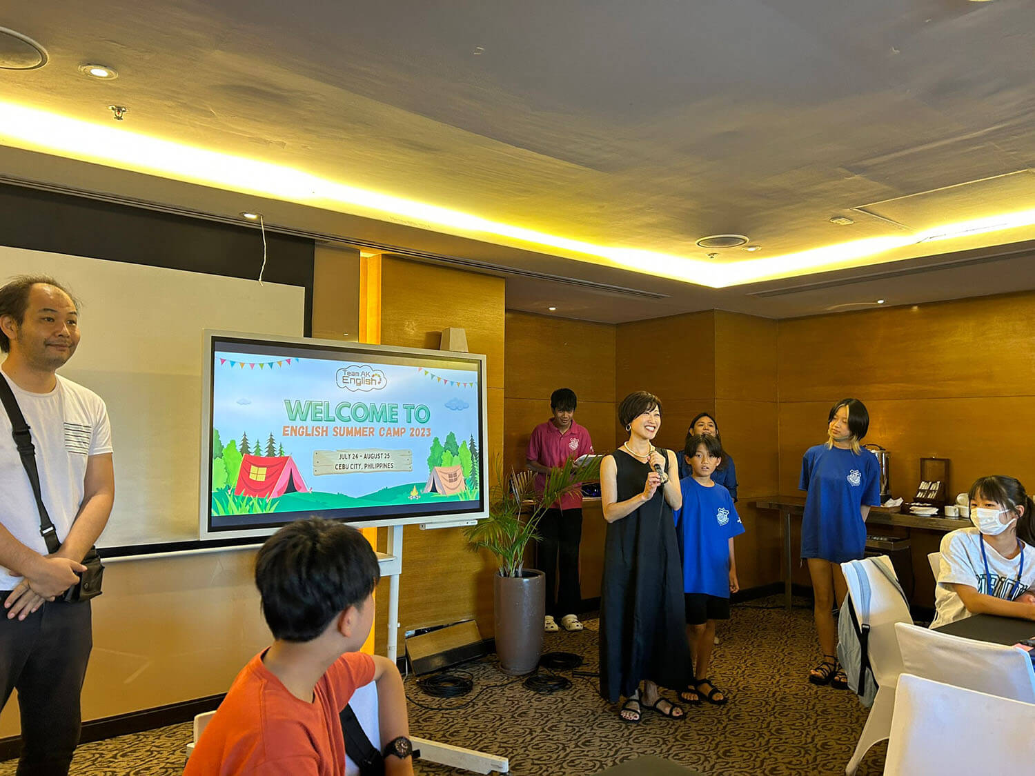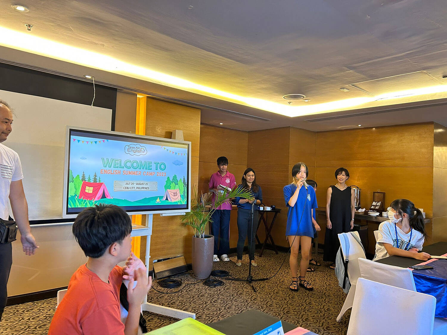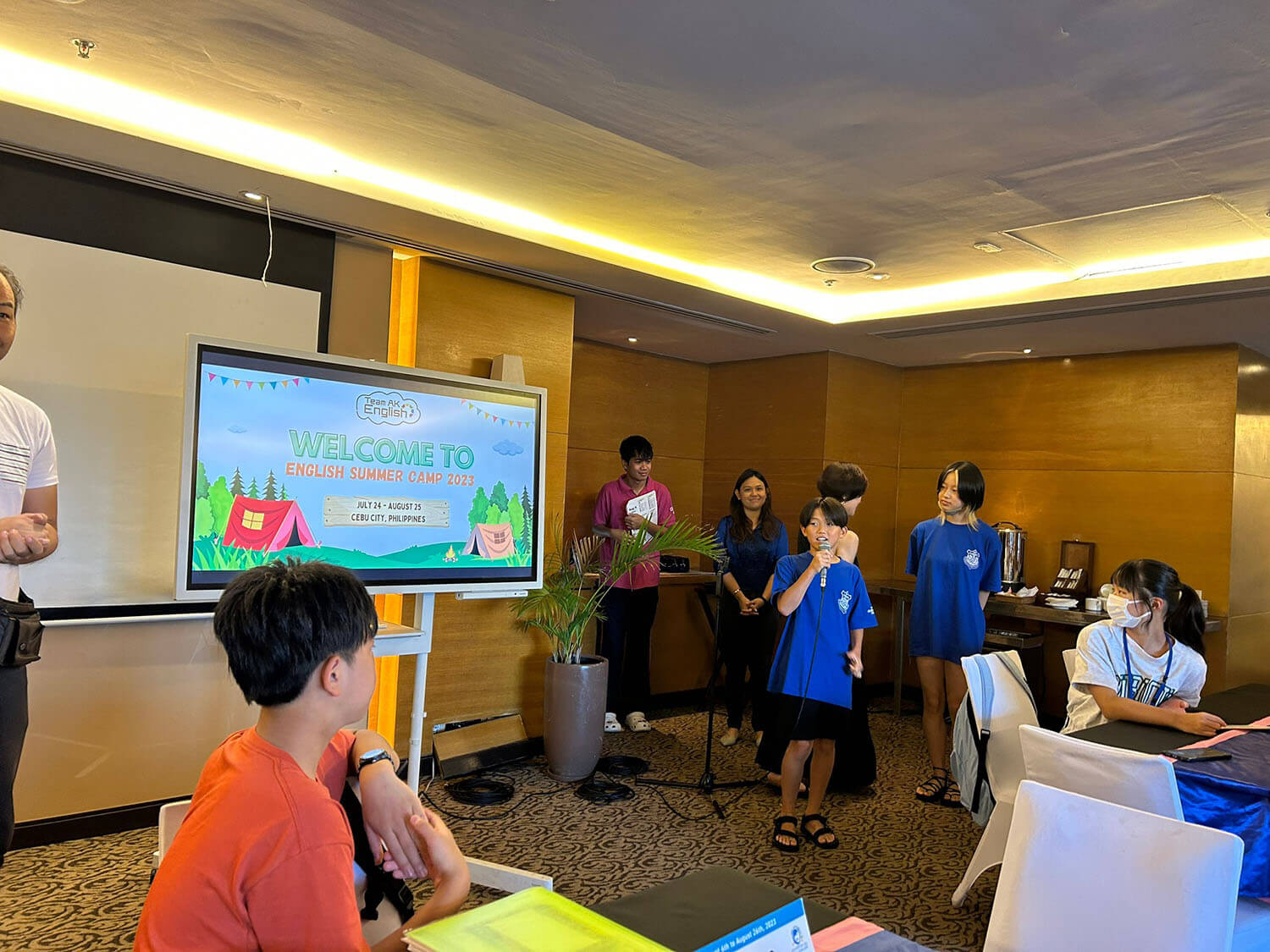 大盛況で進行中の夏休み英語漬けセブ島リゾート親子留学・ジュニアキャンプ併催のセブシティクエストホテル会場!クラスルームとなるカンファレンスは、プールが目の前のリゾート感あふれるファンクションルーム!