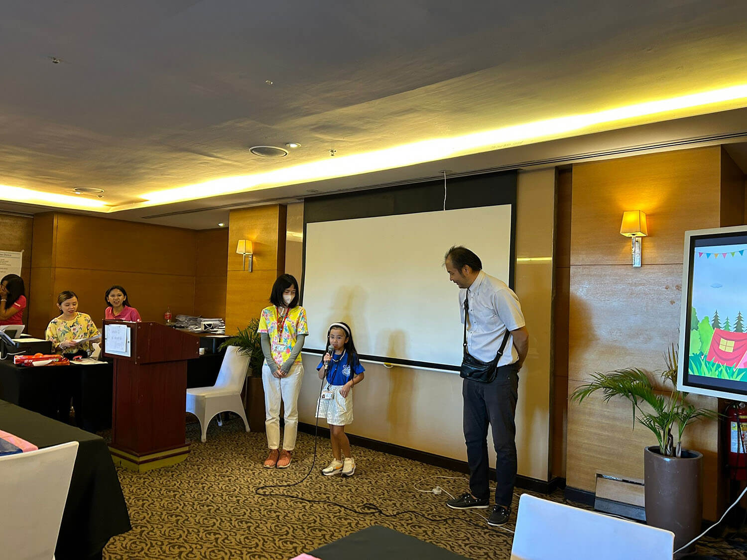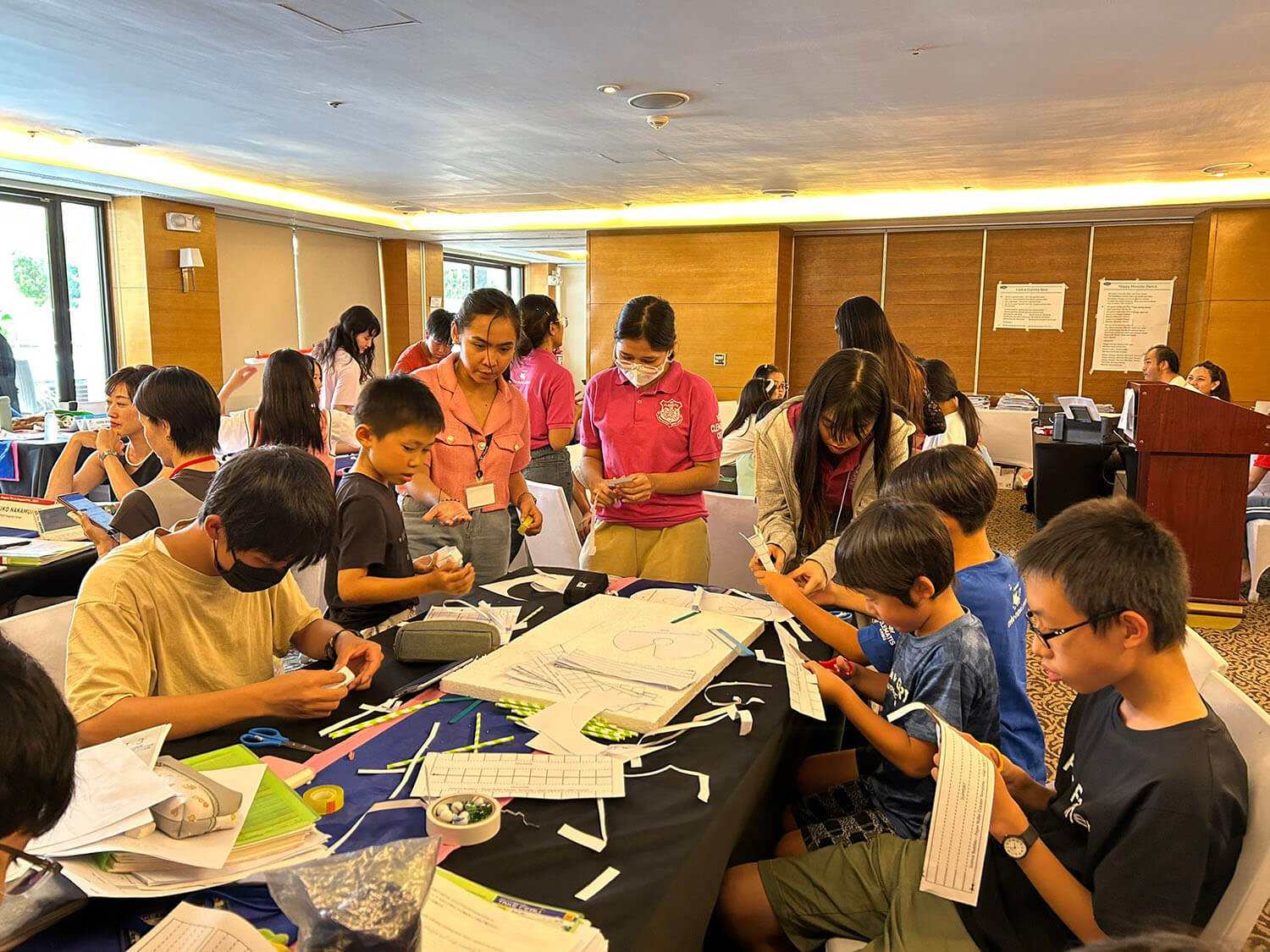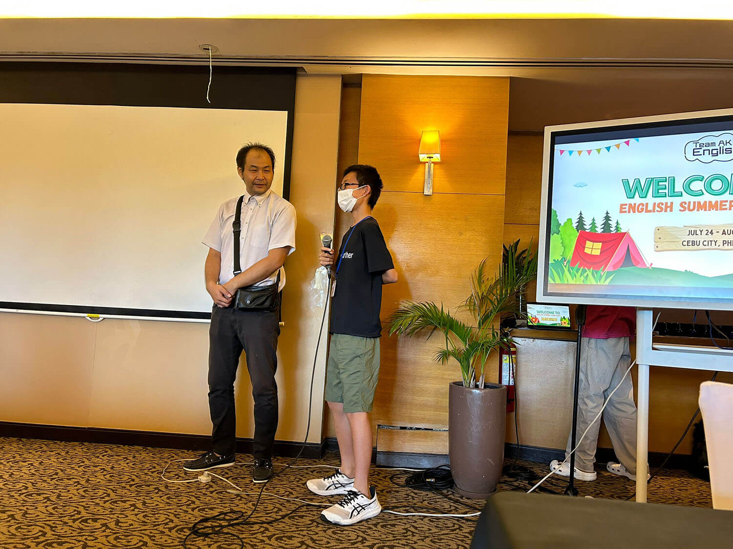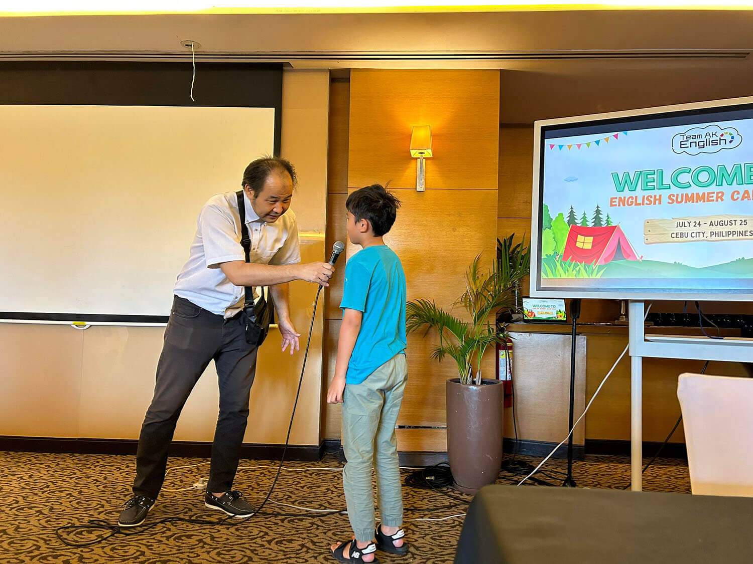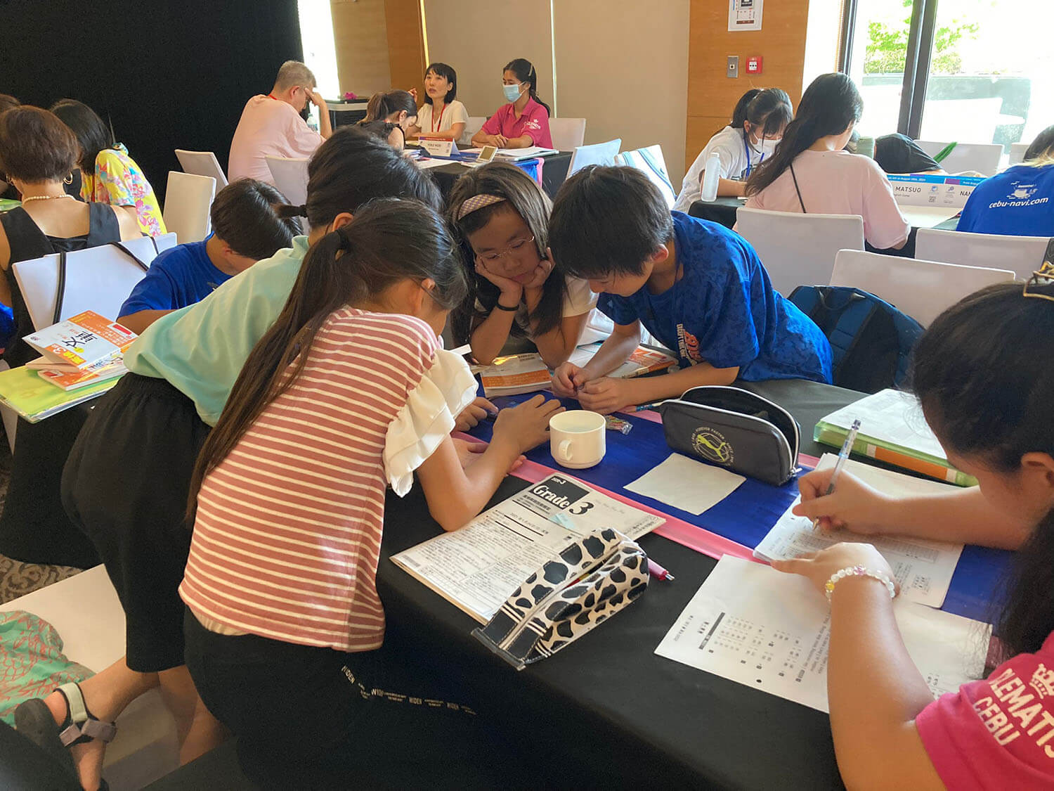 大盛況で進行中の夏休み英語漬けセブ島リゾート親子留学・ジュニアキャンプ併催のセブシティクエストホテル会場!クラスルームとなるカンファレンスは、プールが目の前のリゾート感あふれるファンクションルーム!