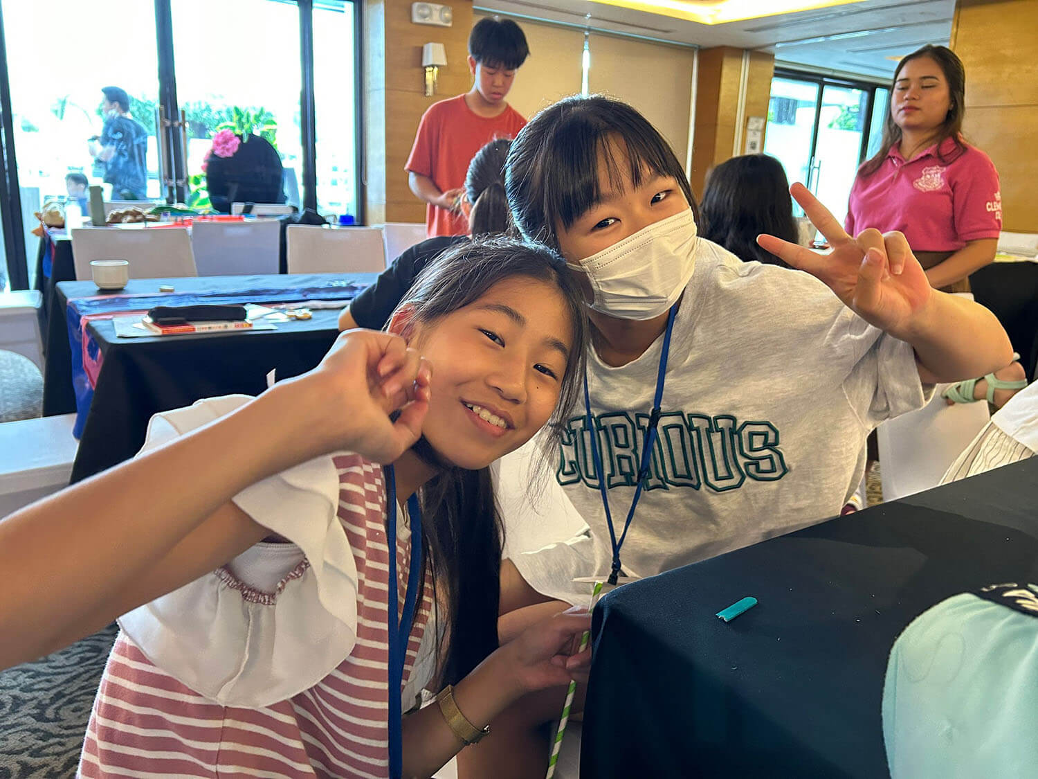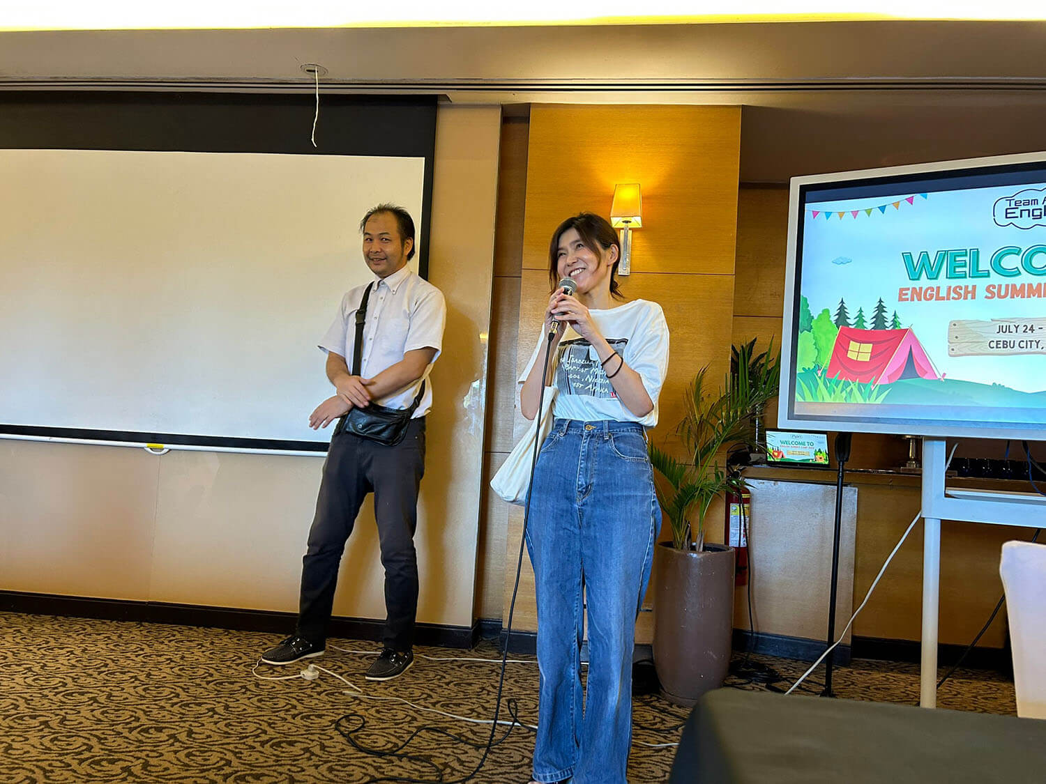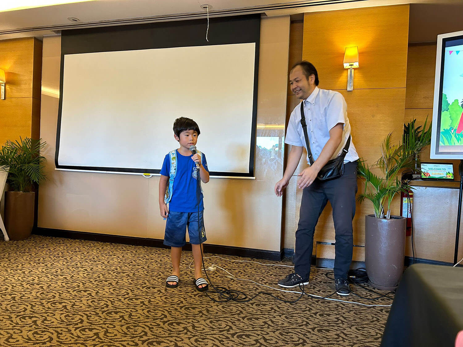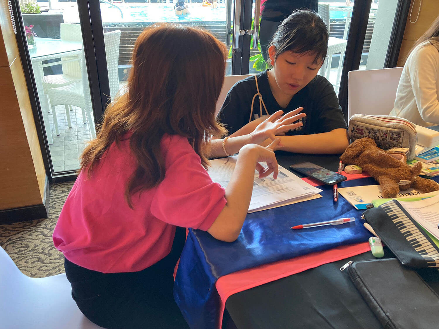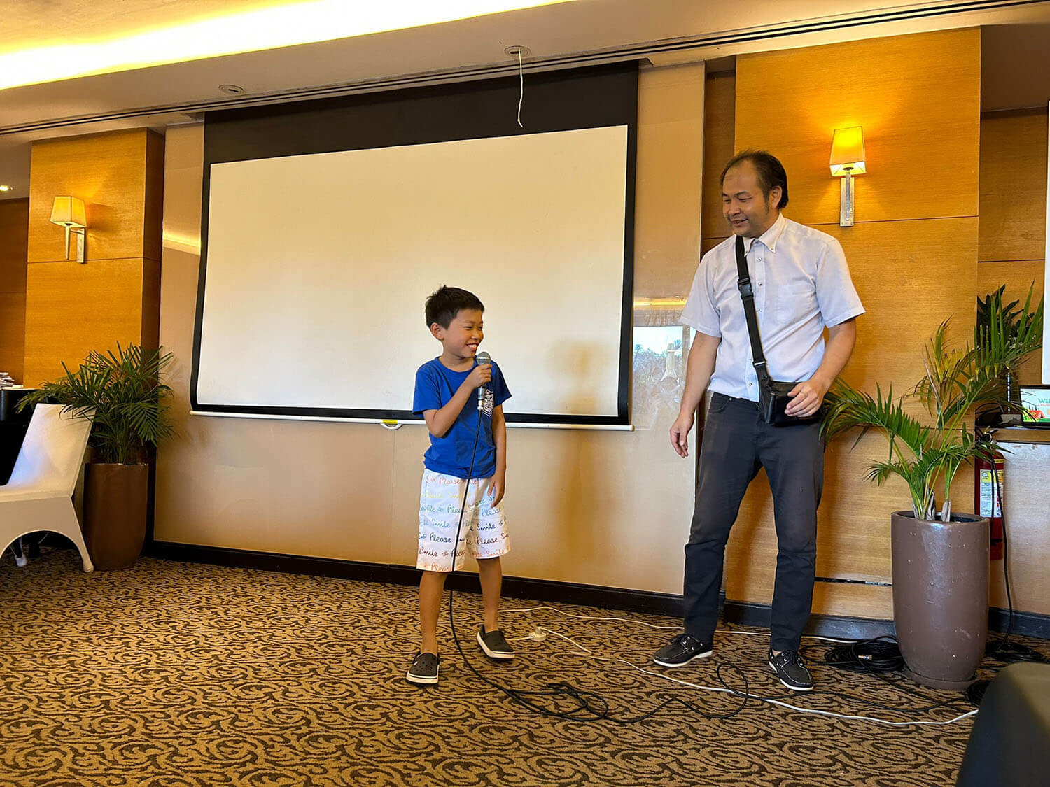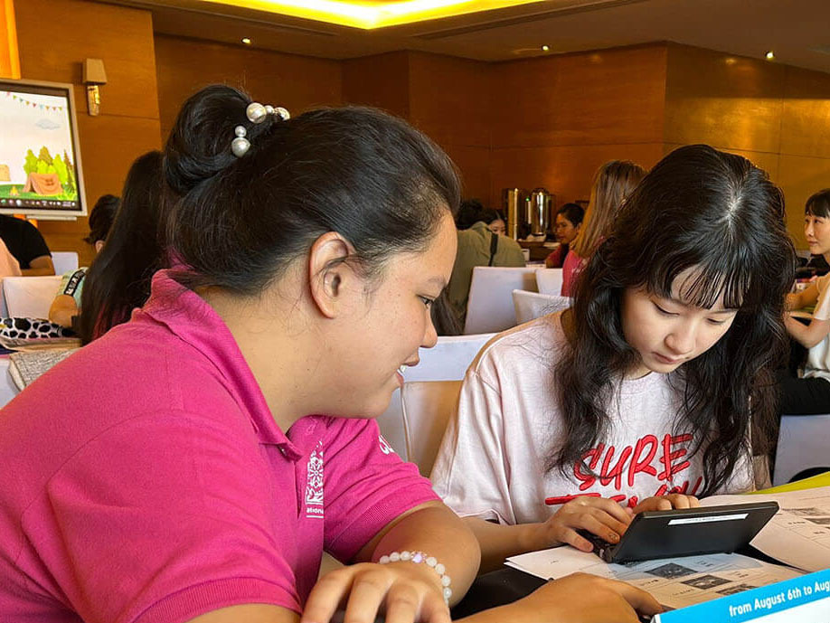 大盛況で進行中の夏休み英語漬けセブ島リゾート親子留学・ジュニアキャンプ併催のセブシティクエストホテル会場!クラスルームとなるカンファレンスは、プールが目の前のリゾート感あふれるファンクションルーム!