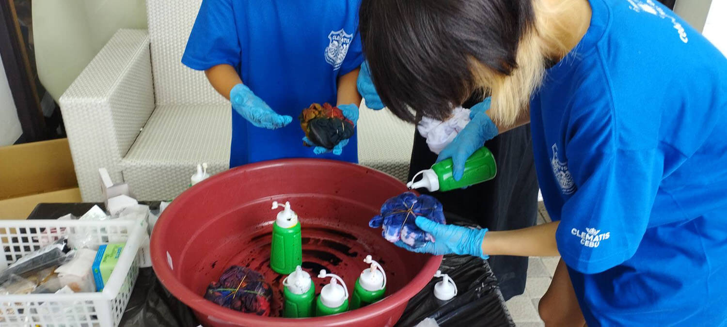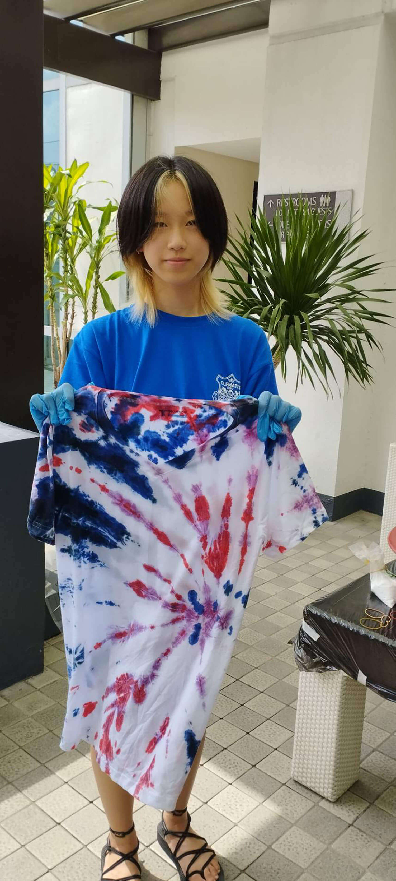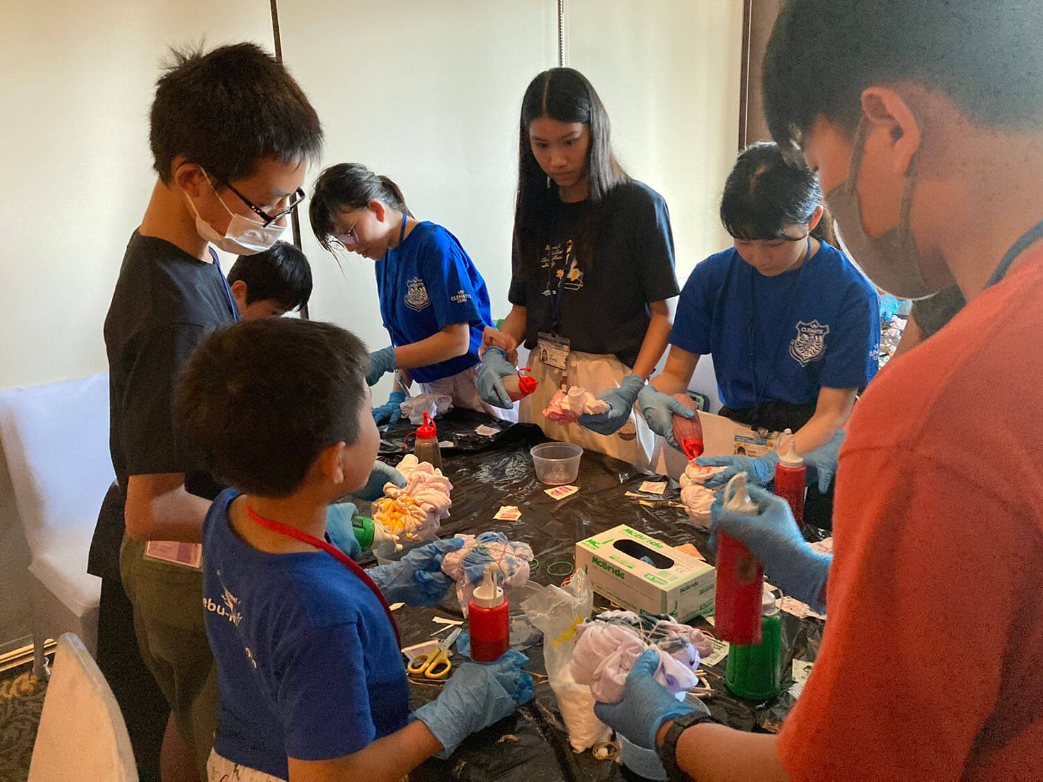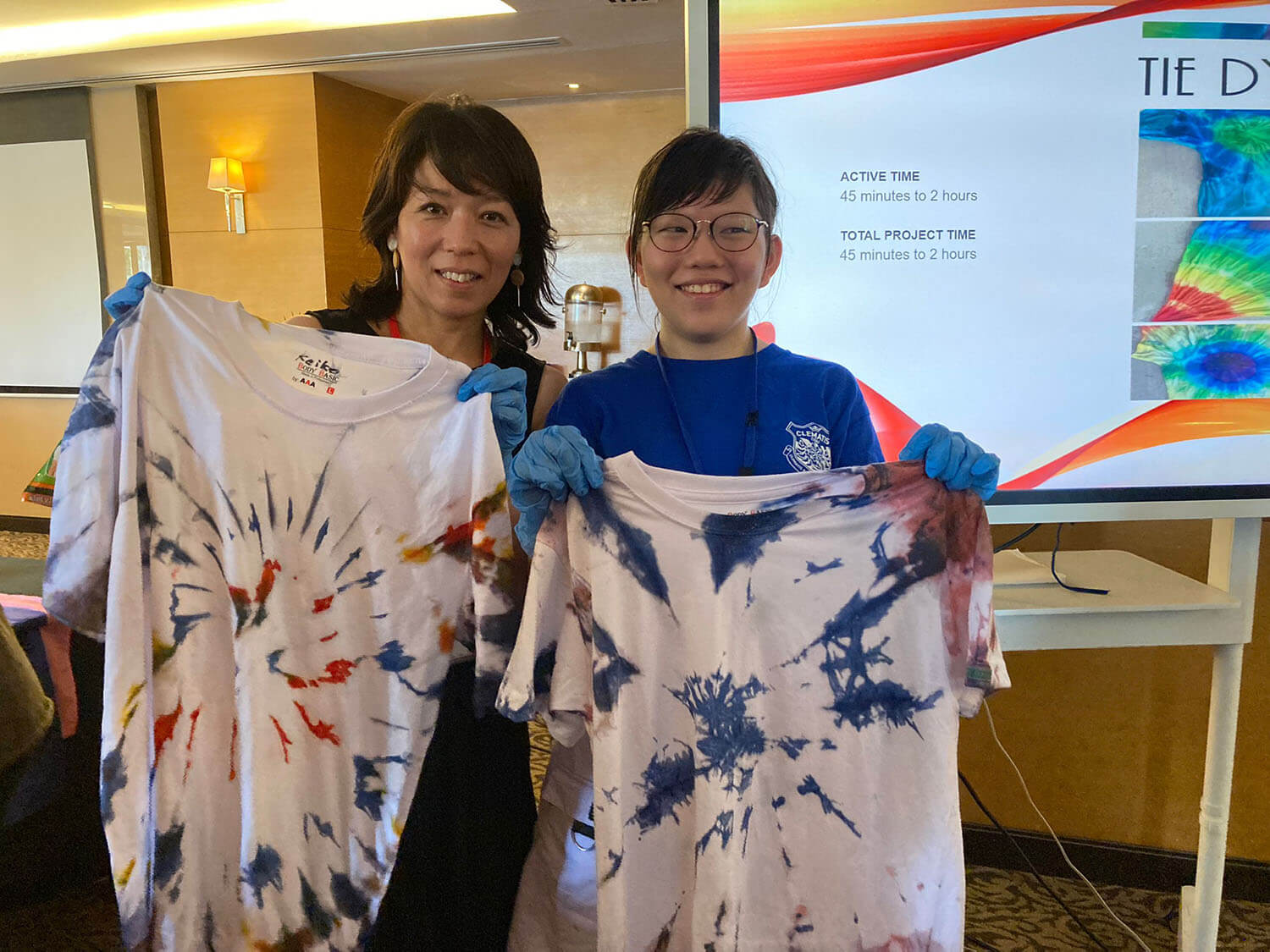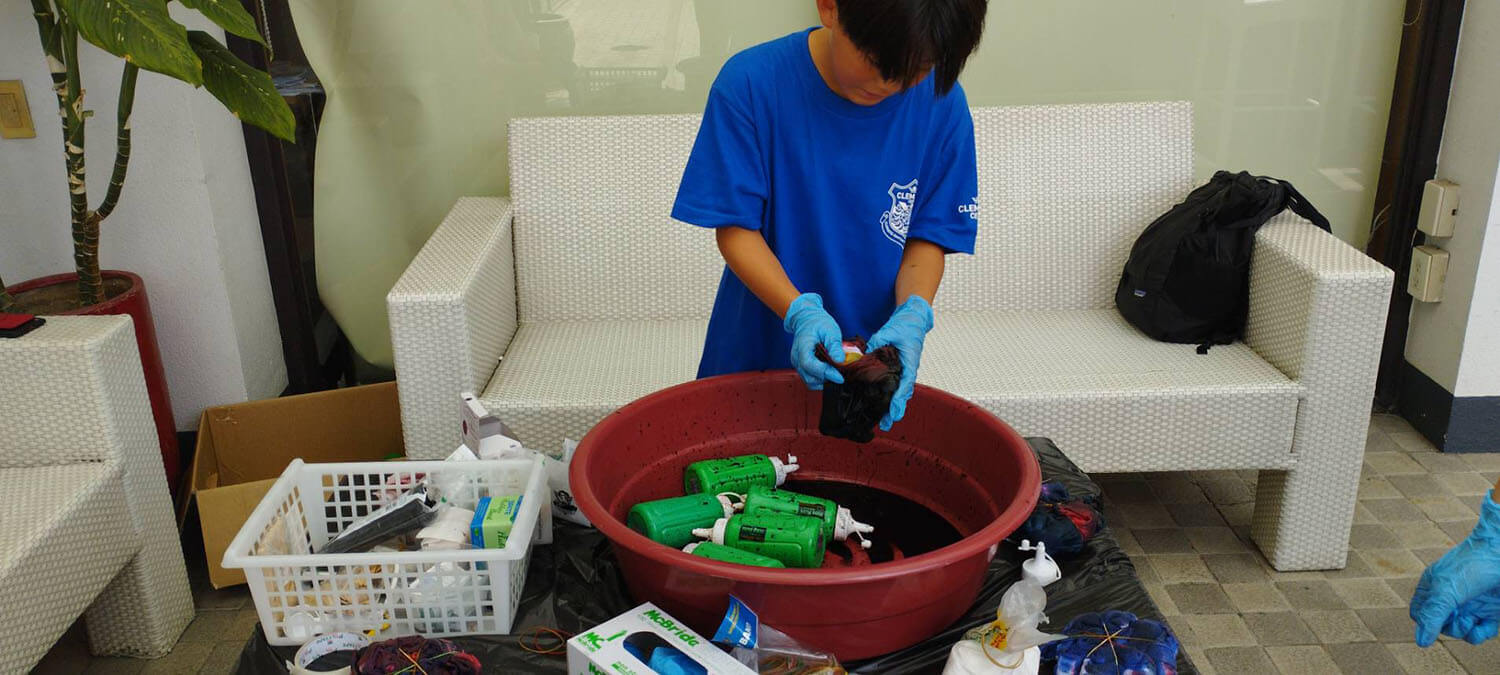 新入生の定番、Tシャツ染めサイエンスは、お昼に行われます。それぞれ個性的なTシャツが出来上がっていますね!