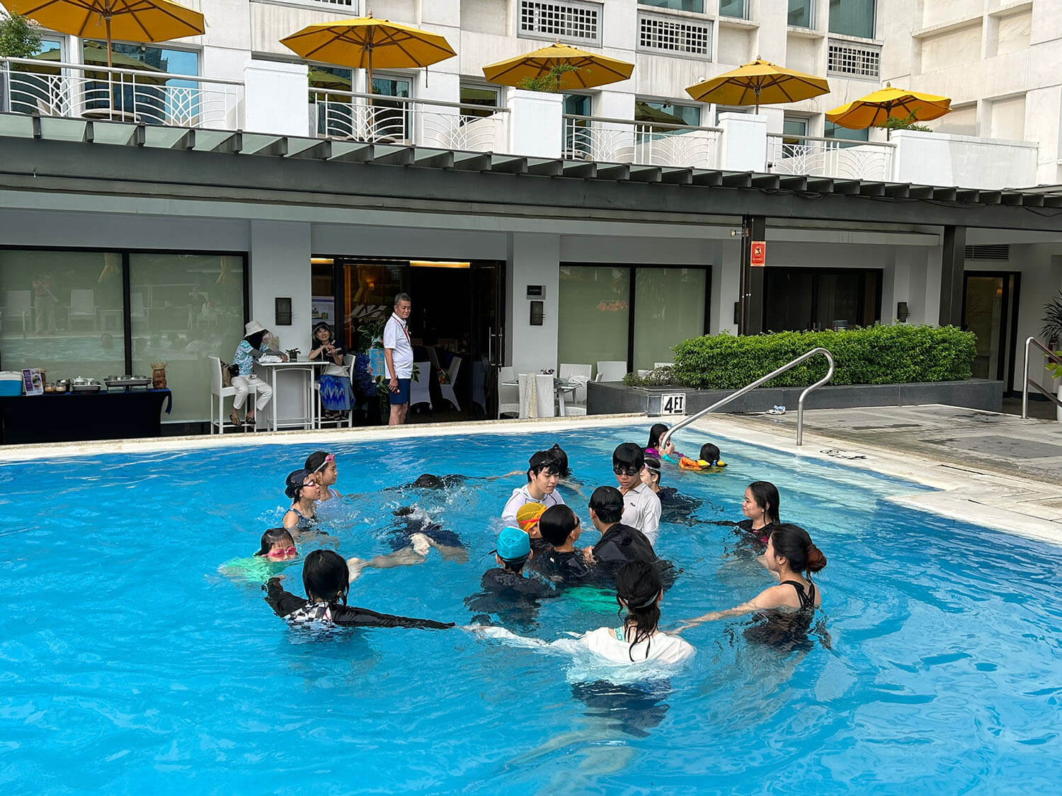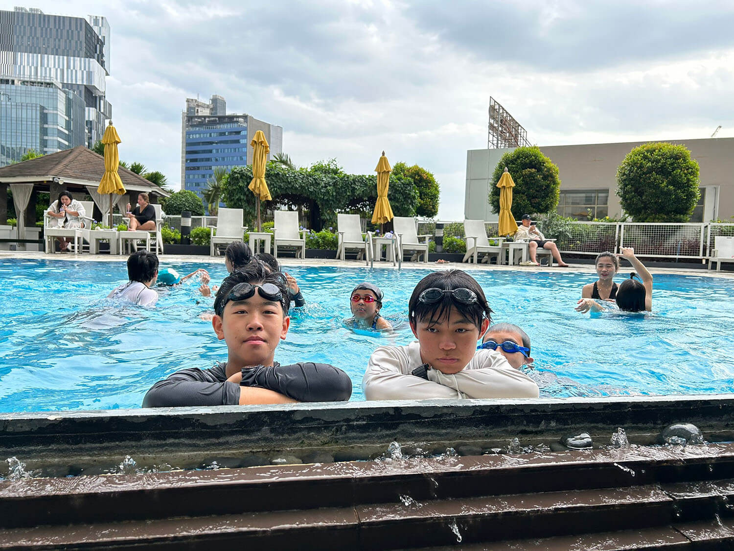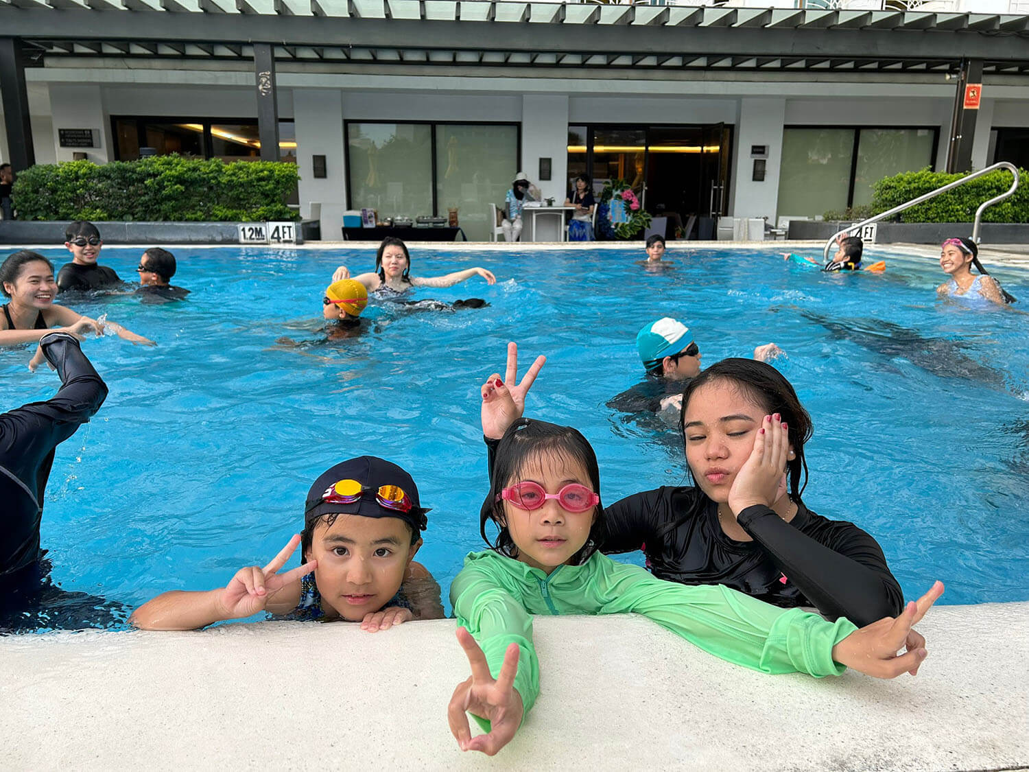 教室から眺められる広大なプールを目の前に、いつプールで遊べるの?と講師やスタッフに聞いて、この日を待ちわびていた子も!