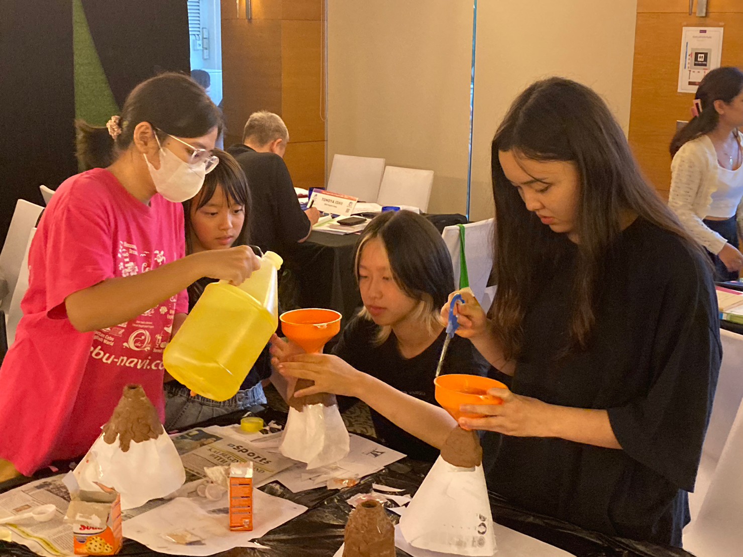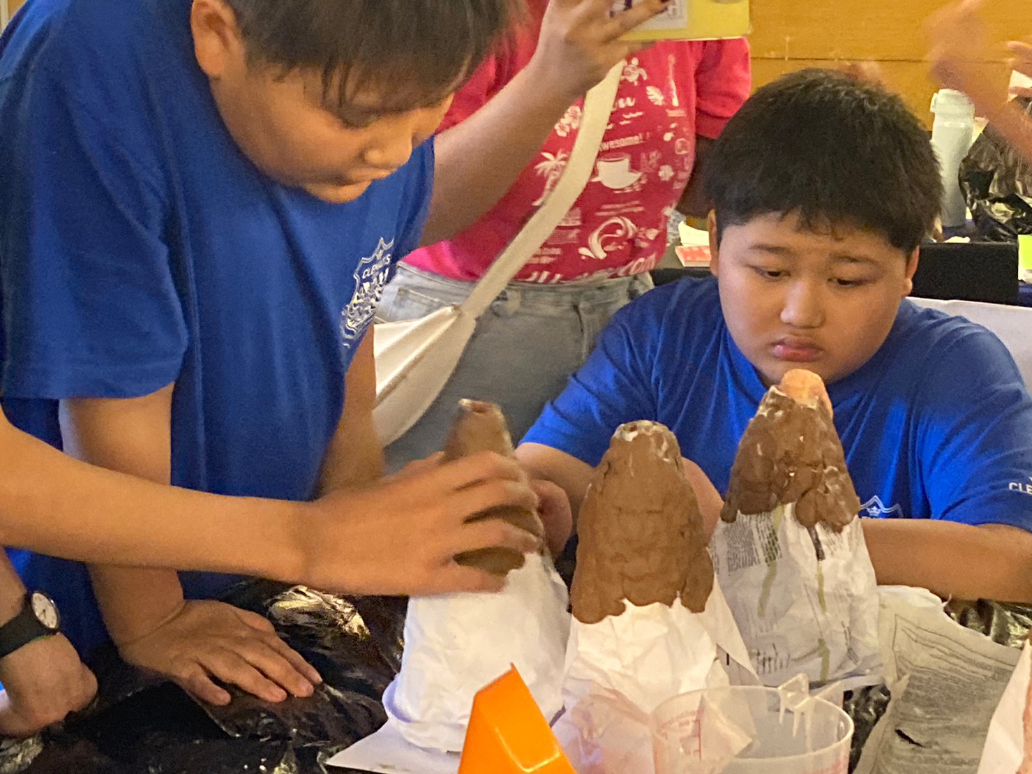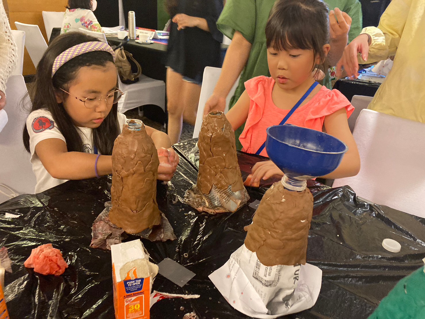 次に、ペットボトルを先ほど作った円錐の中に入れ、本物の火山のように粘土を使って仕上げていきます。