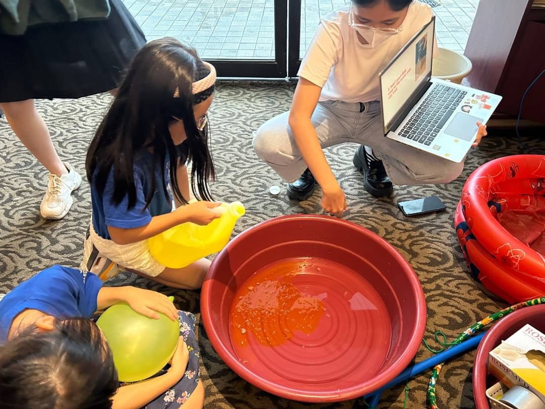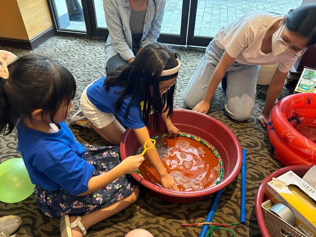 フラフープで大きな風船を作ってみたり、小さな風船をたくさん飛ばしてみたり。