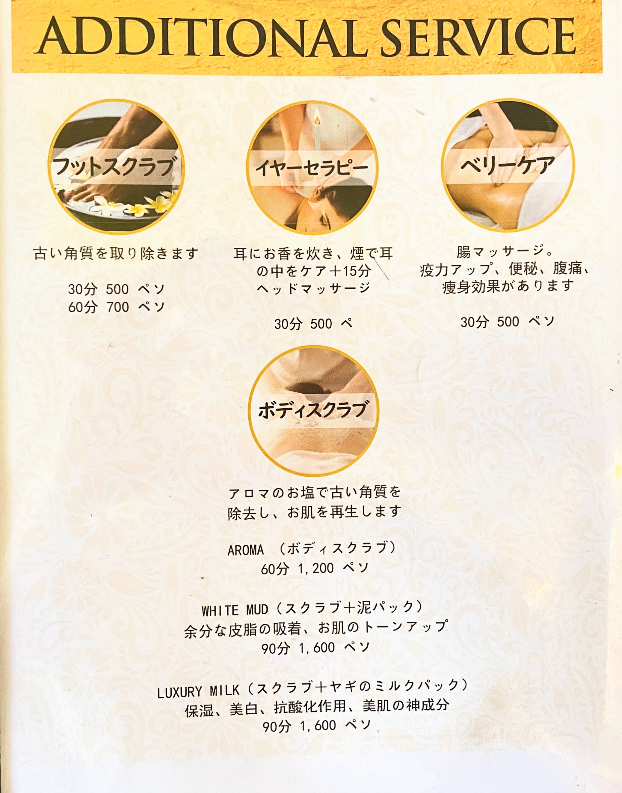 例えば、「Dream package 2,500php/1人」では、空港到着が遅い場合でも、空港までのお迎え+マッサージ、そして+300phpを払えば宿泊することもでき、ここでゆっくり休んで翌朝に送迎付きでホテルチェックイン・・・という事も可能です。