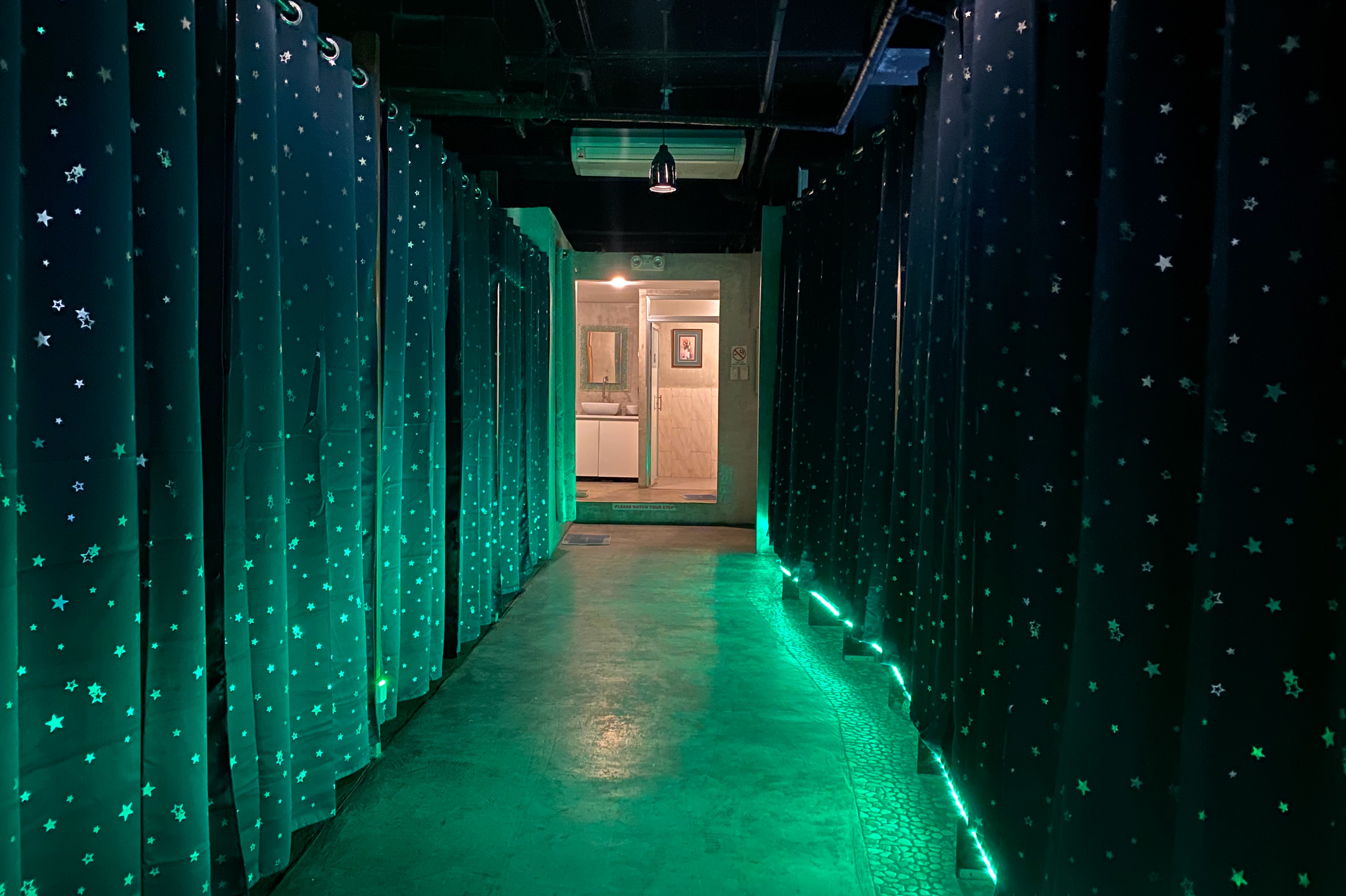 施術部屋はまるで満天の星空の中にいるような幻想的空間☆一部屋ずつカーテンで仕切られていますが、つなげることも可能で、お子様がいる方も安心して一緒にマッサージを体験できます。鍵付き貴重品BOXも一部屋ずつに備え付けてあるので防犯上も安心です。