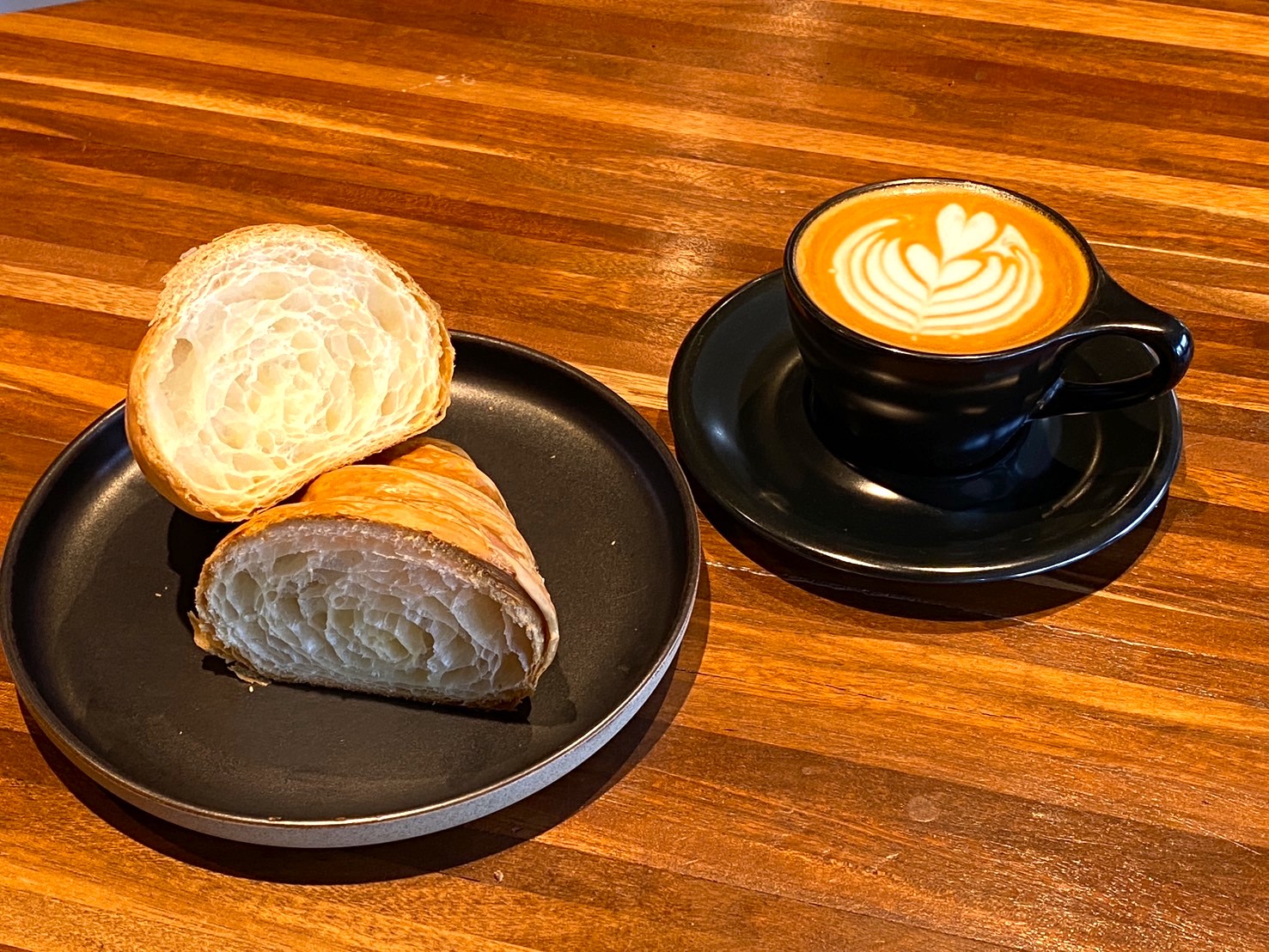 フィリピン産珈琲豆で丁寧に淹れる、香り豊かでふわふわな口当たりのラテ。クロワッサンとの相性が抜群でした!