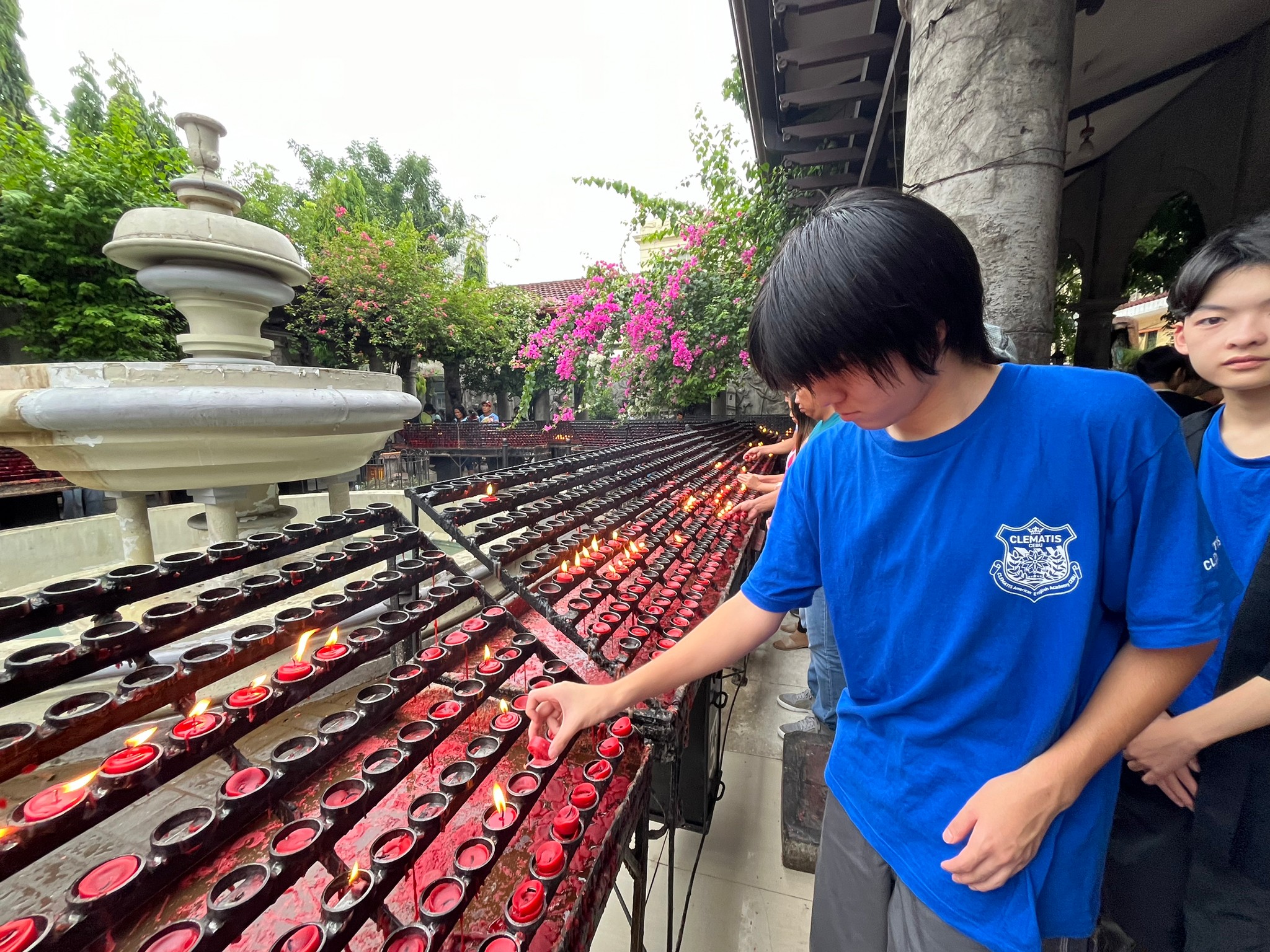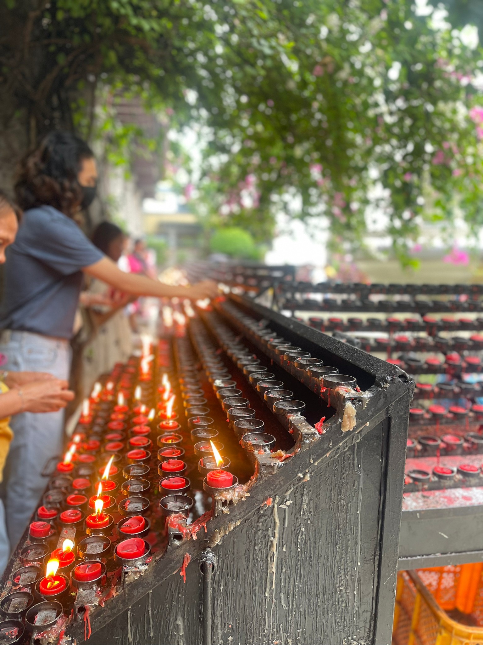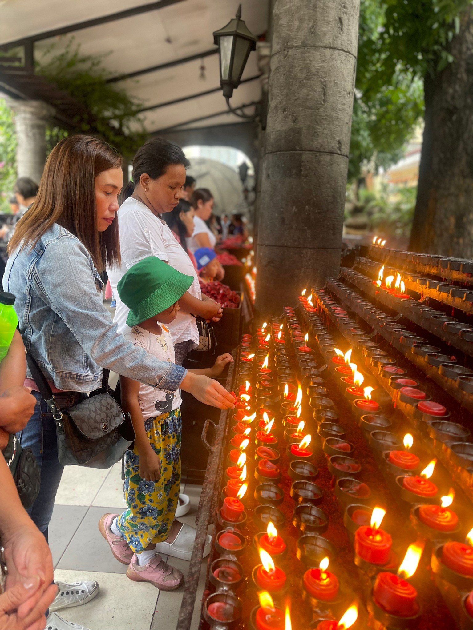 誕生日や大切なイベント、大きな願い事をする時に行う「キャンドルを灯した願い事体験」にもトライ。本来は祈りたい人の数だけキャンドルに火を灯すとか。料金箱があるので、自分の気持ち分だけお金を入れる、日本でいうお賽銭のような感じです(目安は1本1php ※30円)。