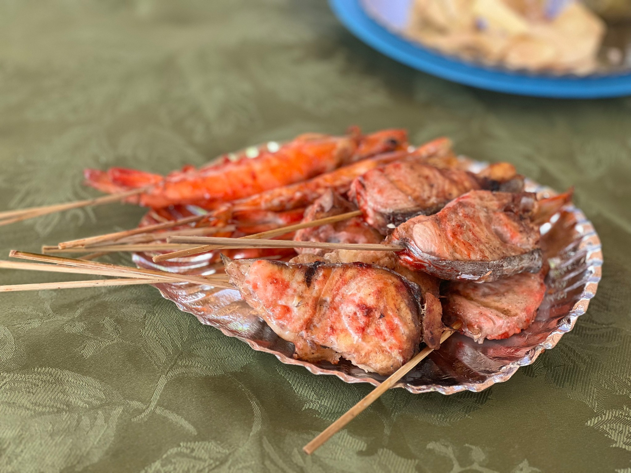 シーフード、豚肉、鶏肉などの串とバナナの葉で包まれたご飯がメイン。焼き台で焼いた串は、しょうゆベースのたれや甘くて濃厚な旨味のあるバナナケチャップにつけていただきます(*^-^*)