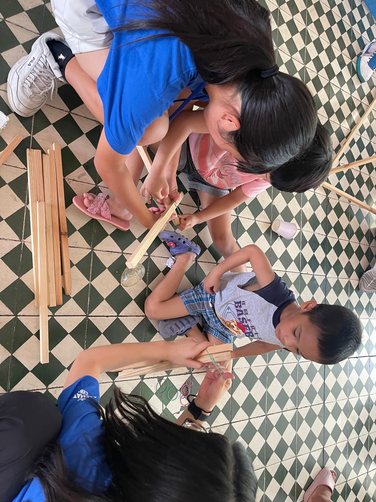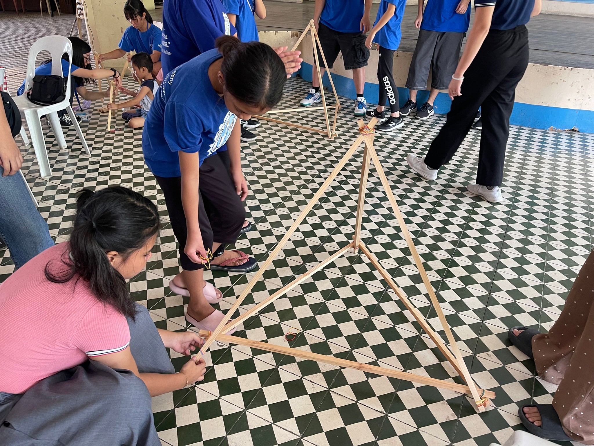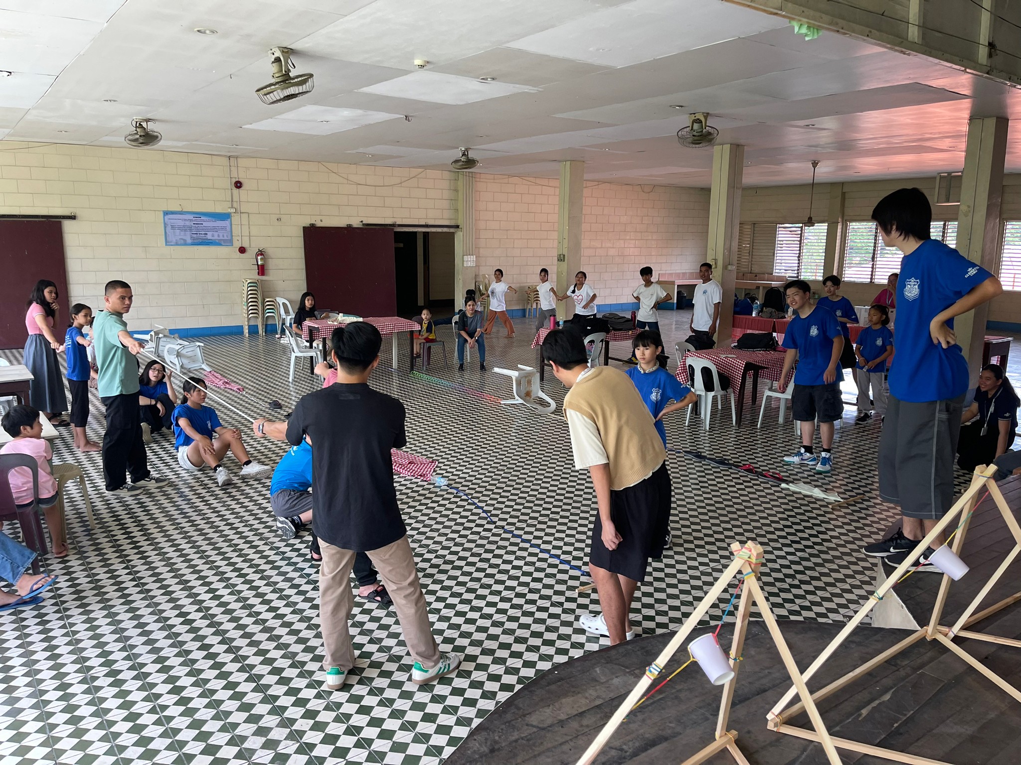 みんなでカタパルトを作っていきます。施設の子供達の作業をサポートすべく、ジュニアキャンプ参加生が英語でレクチャー。