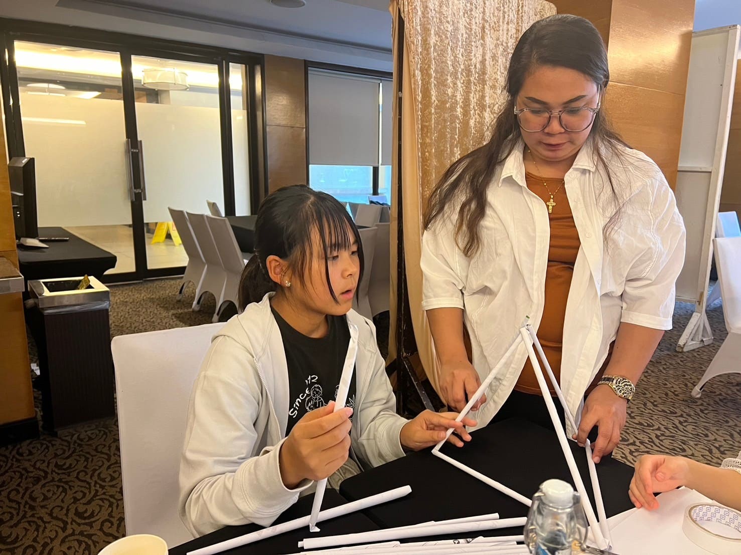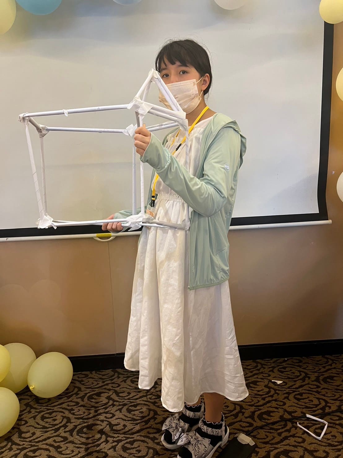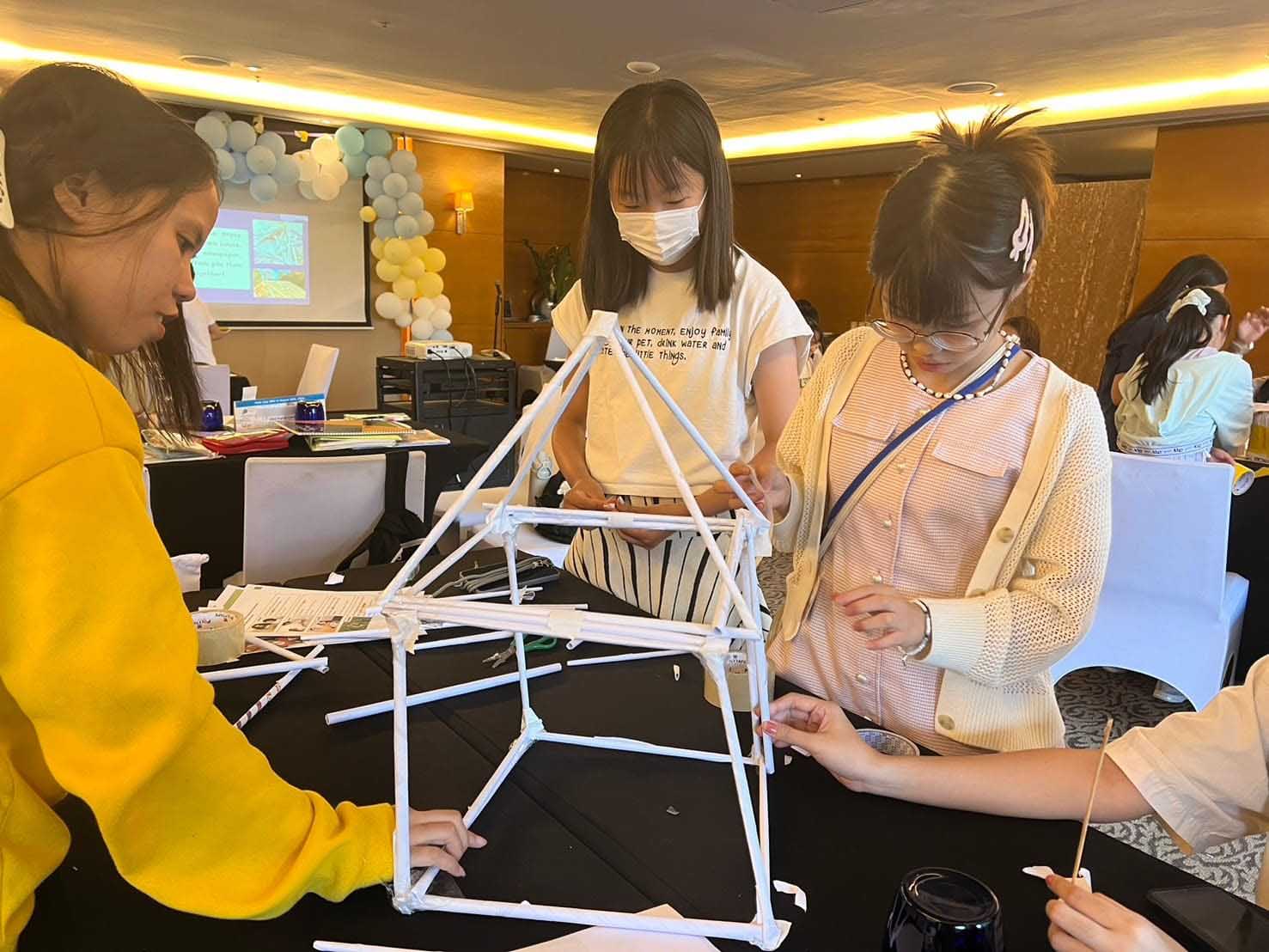 新聞紙を細く丸めて強化し、3本で面にします。組み合わせて立体的な空間を作っていきます。