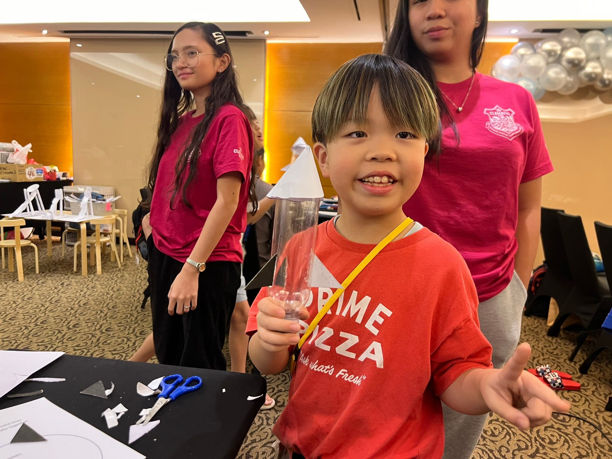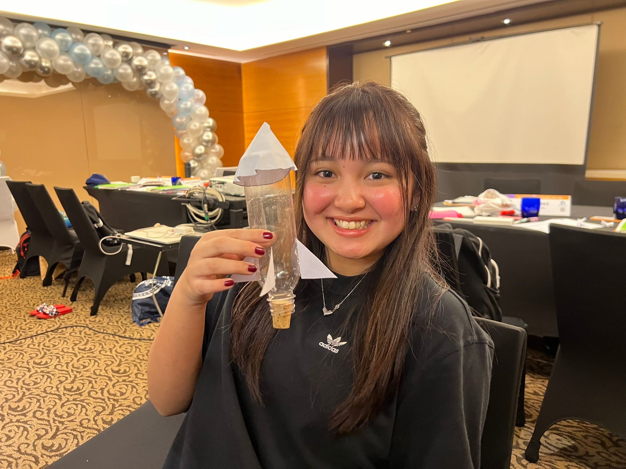自分達で作ったペットボトルロケットに水を入れて、さらに空気をギュウギュウに詰めて入れます。そうすると、溜まった空気が水を勢いよく押し出し、外に飛び出す力でペットボトルロケットが空高く飛んでいきます。この科学実験では、水圧と空気圧の原理を楽しく学べます。本物のロケットも同じ原理で飛んでいることに、一同感動した様子(*^-^*)