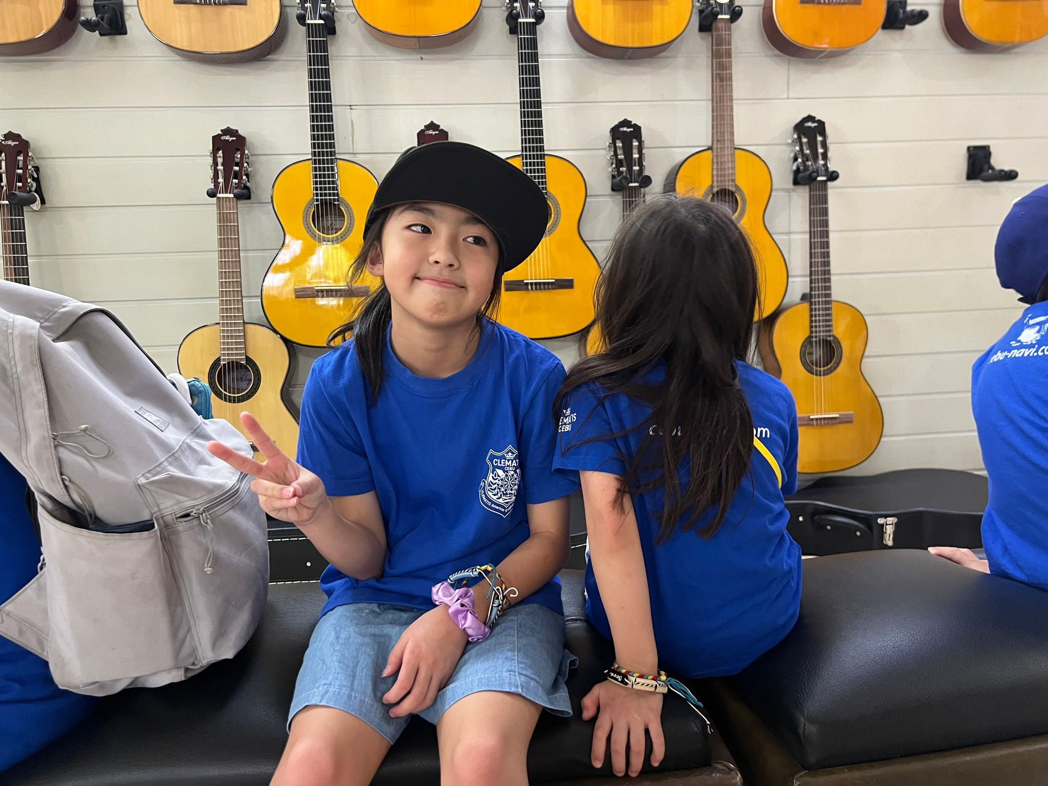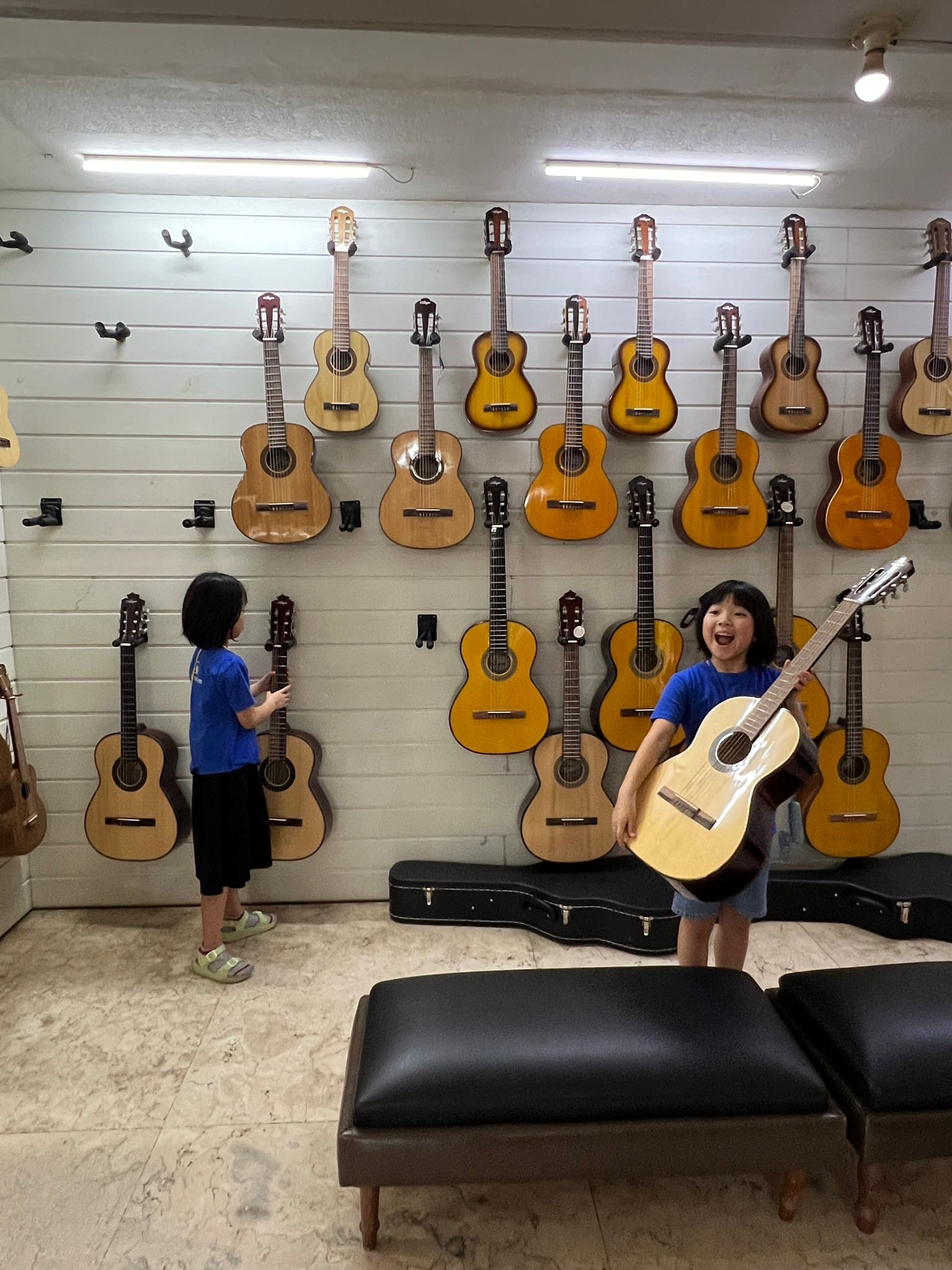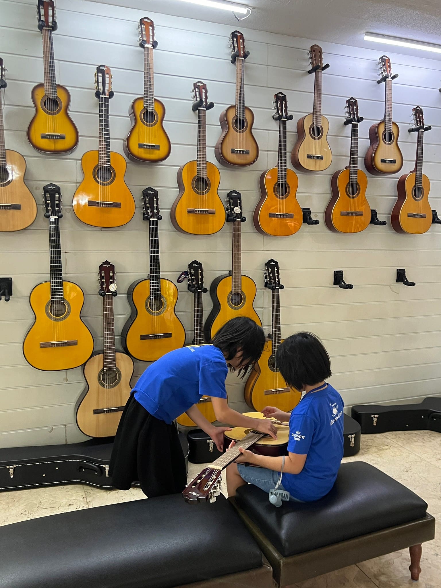 皆さん、初めて見る光景に興味深々の様子!それぞれ気に入ったギターを手に取って、カッコよくポージング♪