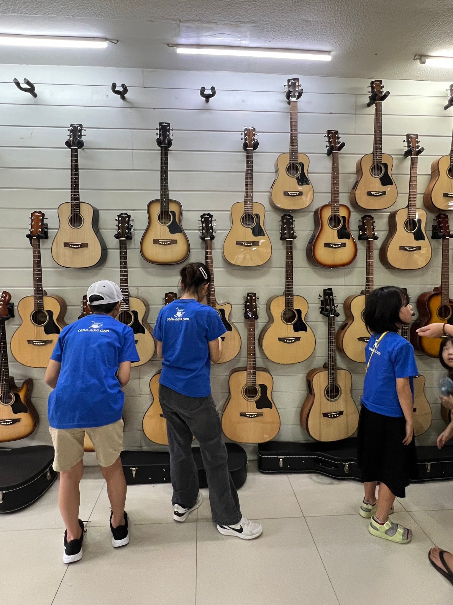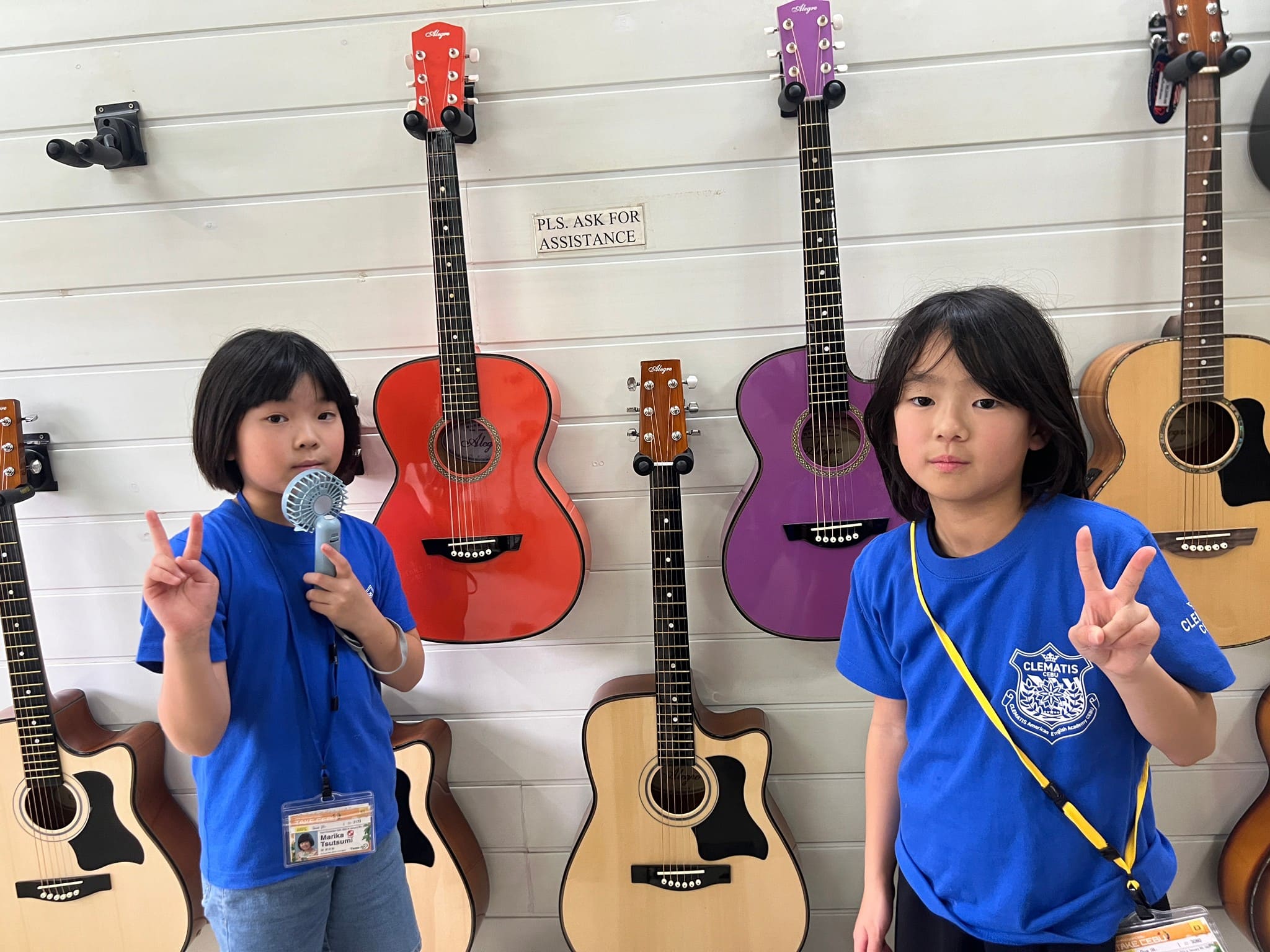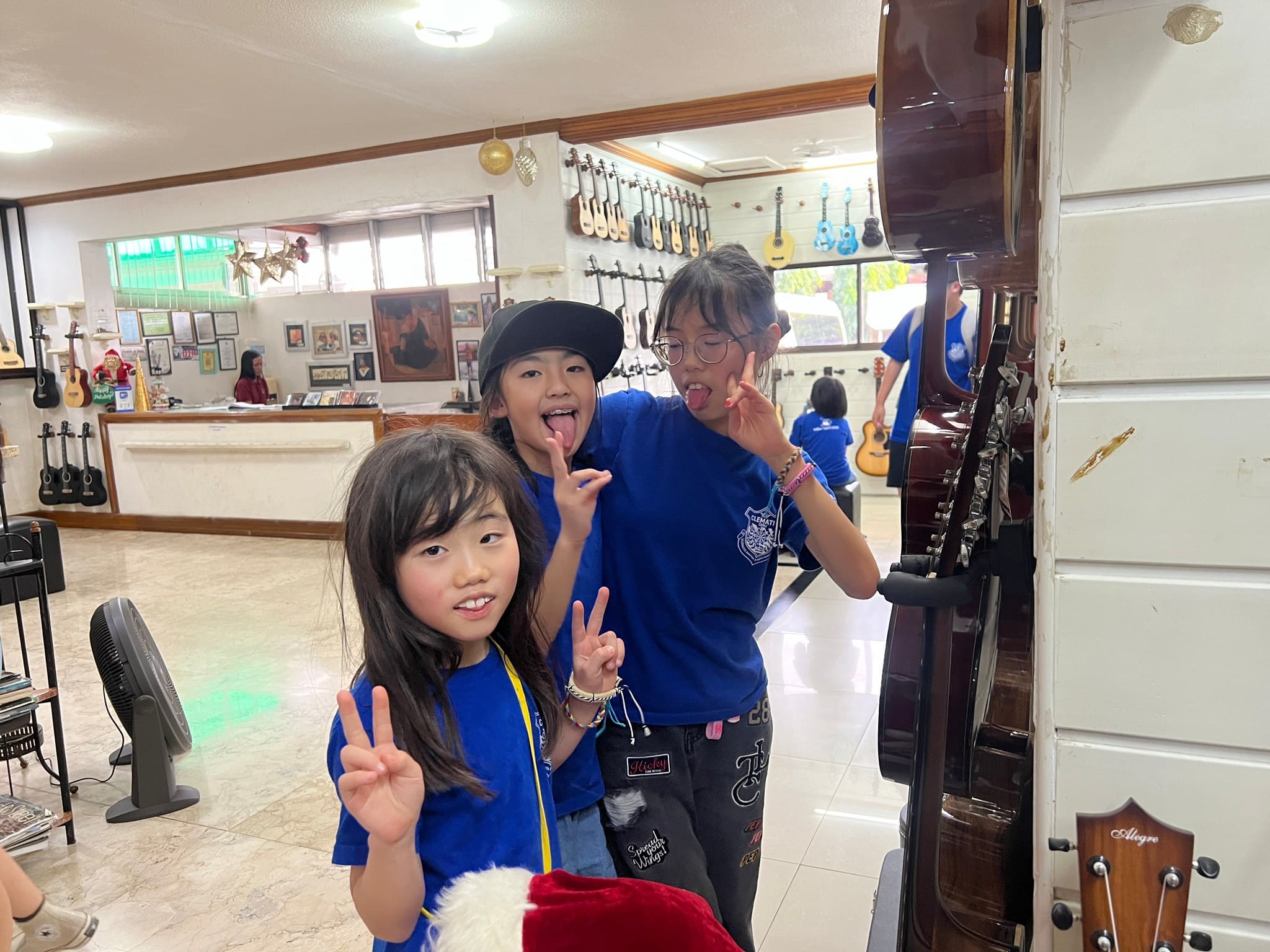 皆さん、初めて見る光景に興味深々の様子!それぞれ気に入ったギターを手に取って、カッコよくポージング♪