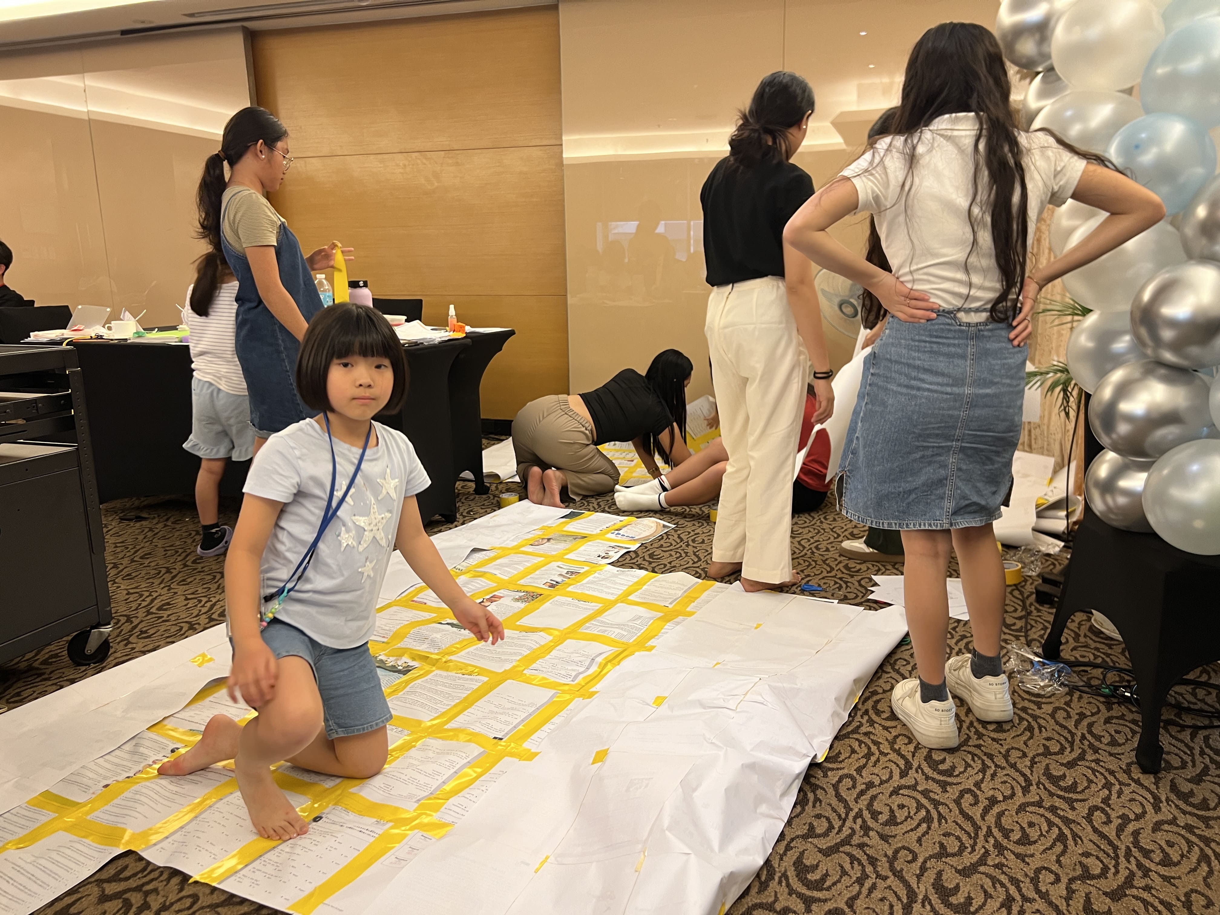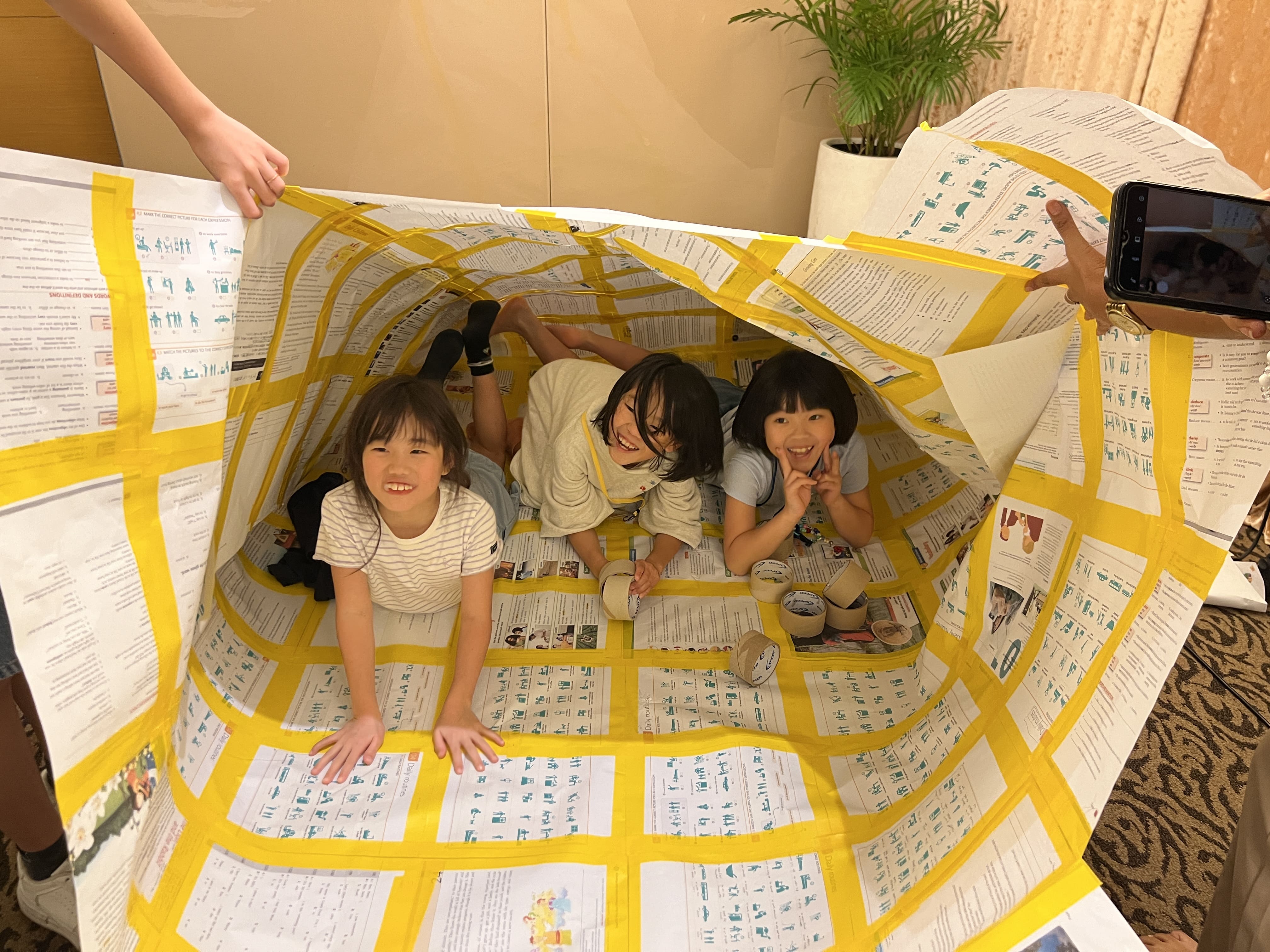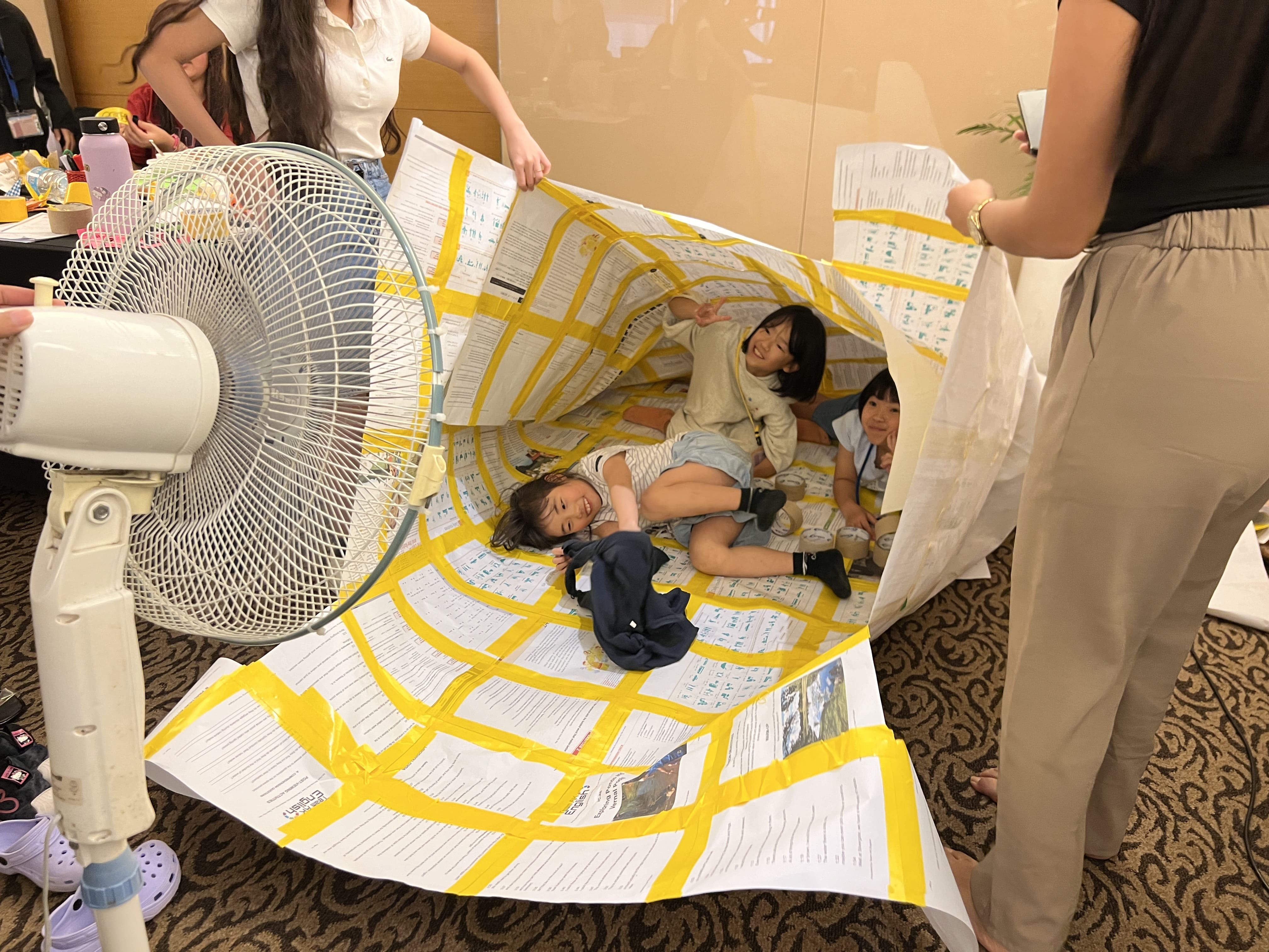 仲間と協力しながら、ガムテープで紙をパーツごとに次々と貼り合わせていきます。出来上がったら扇風機で送風すると、みるみるドームが膨らみ始めました。