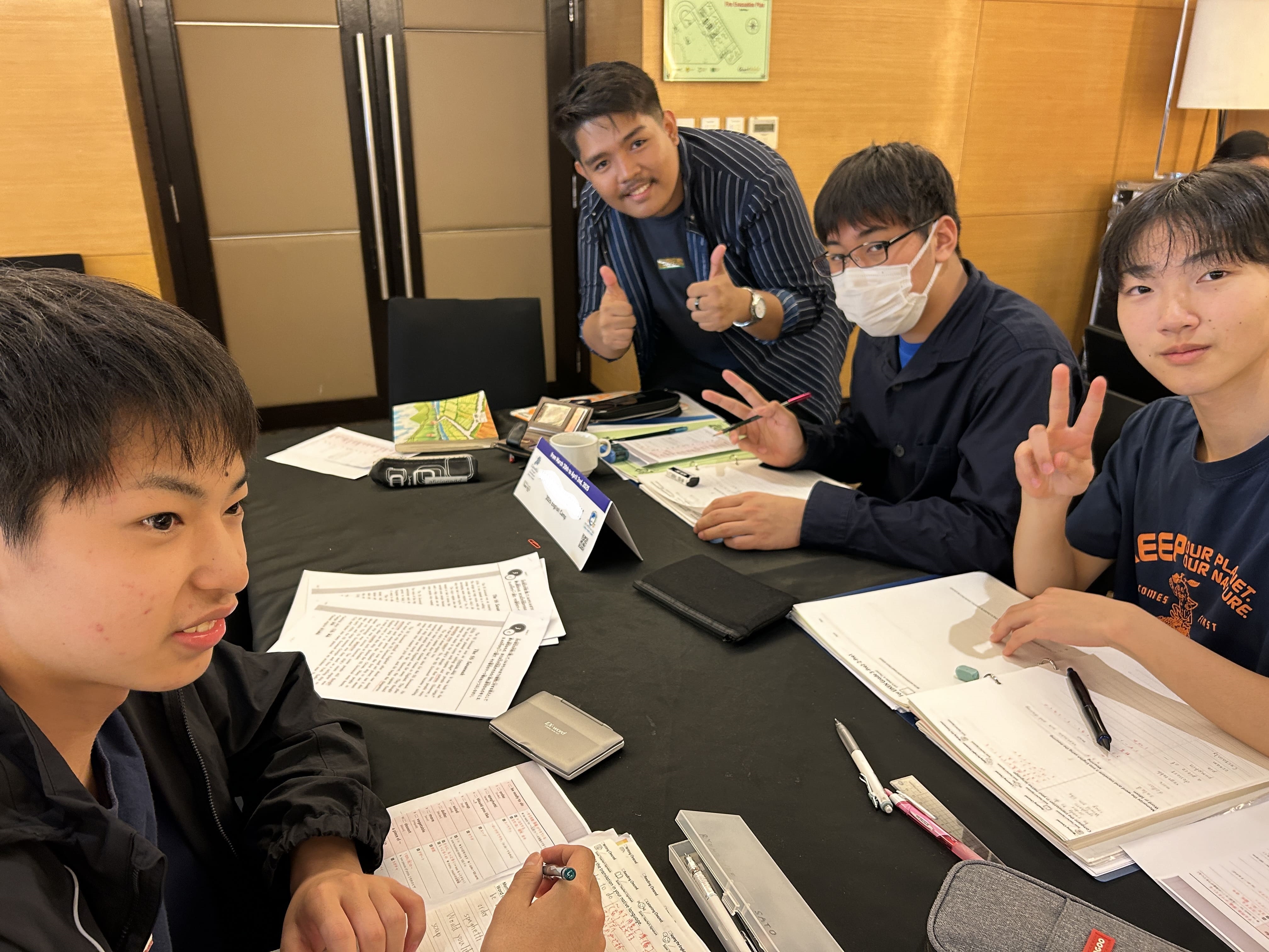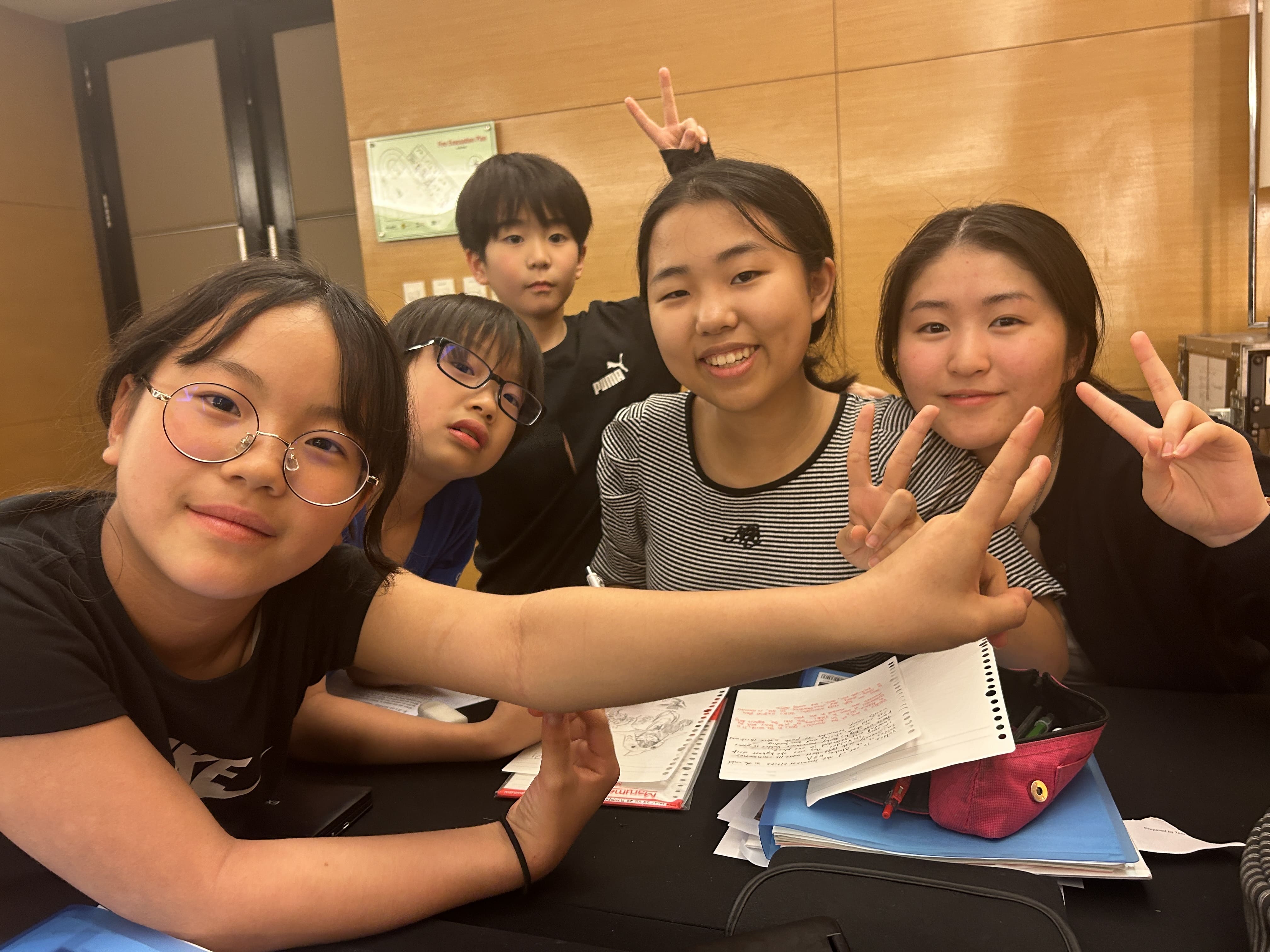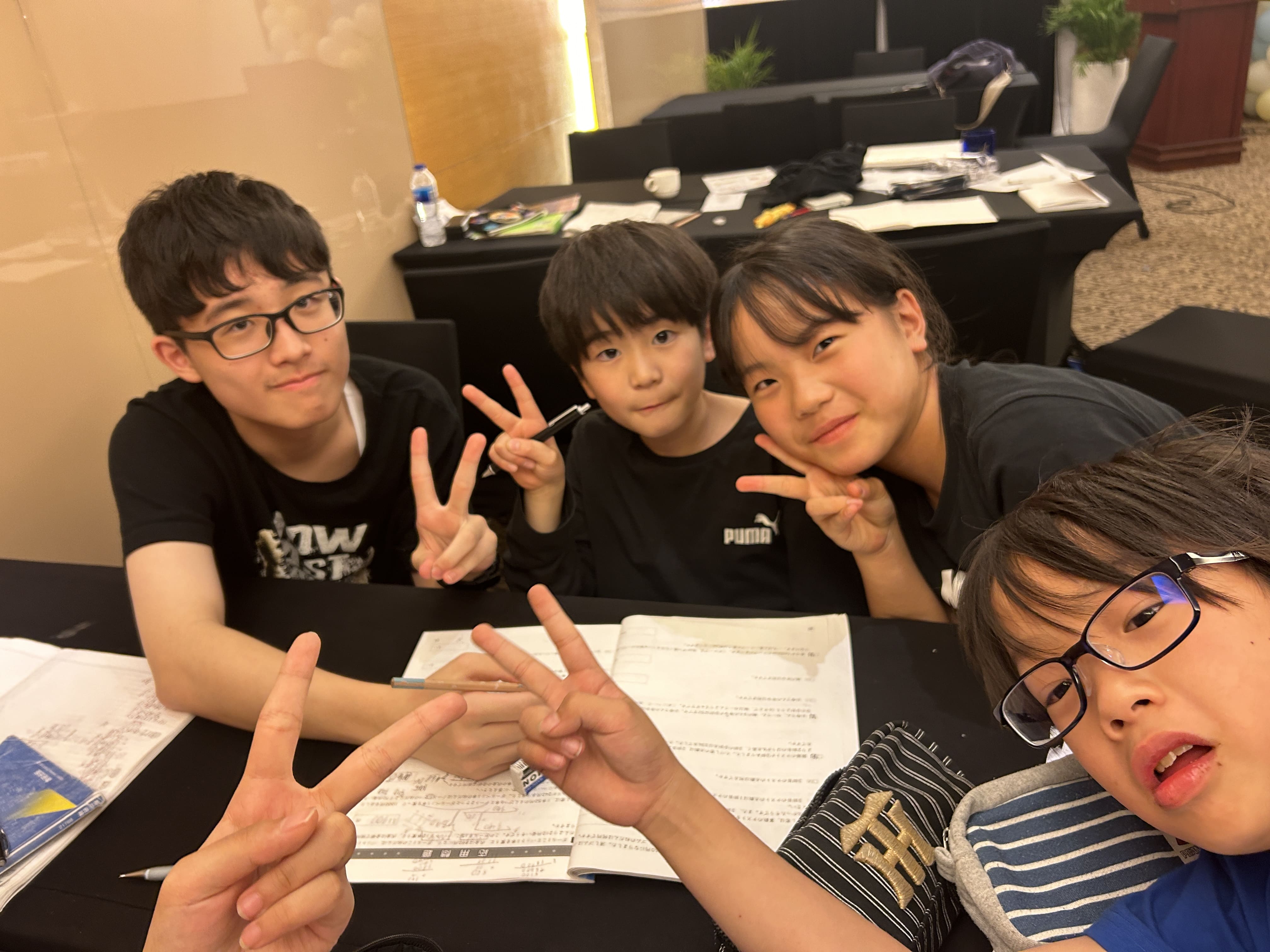 ジュニアキャンプの自習時間は、小学4年生以上から高校生まで参加できます。皆さん、学ぶ環境や周囲の仲間との関わり合いの中で、自然と勉強へのモチベーションも高まるようです。終了後は、素敵な笑顔で記念撮影♪