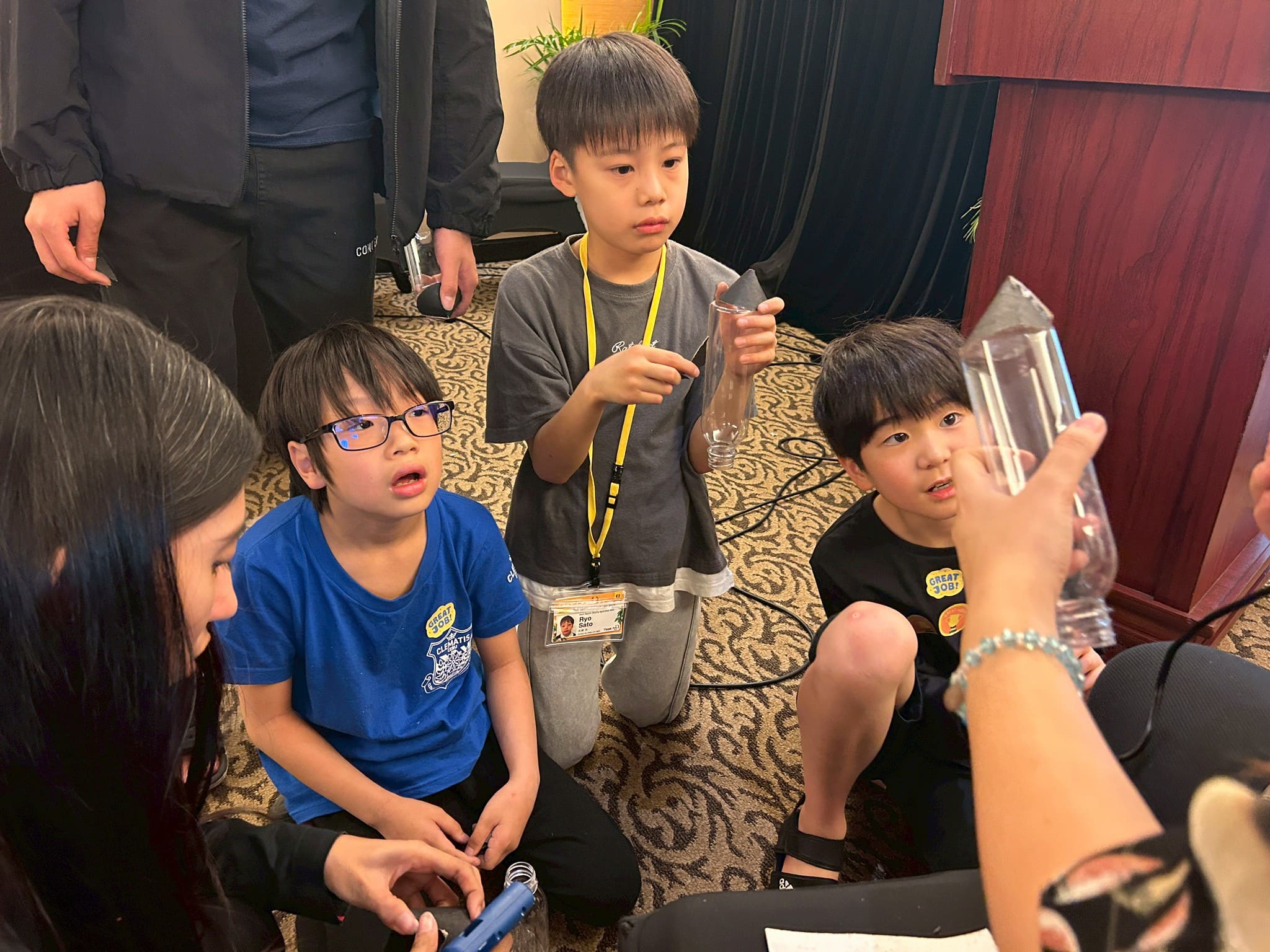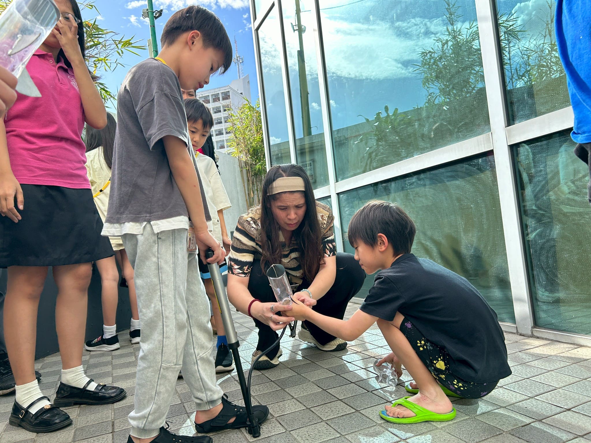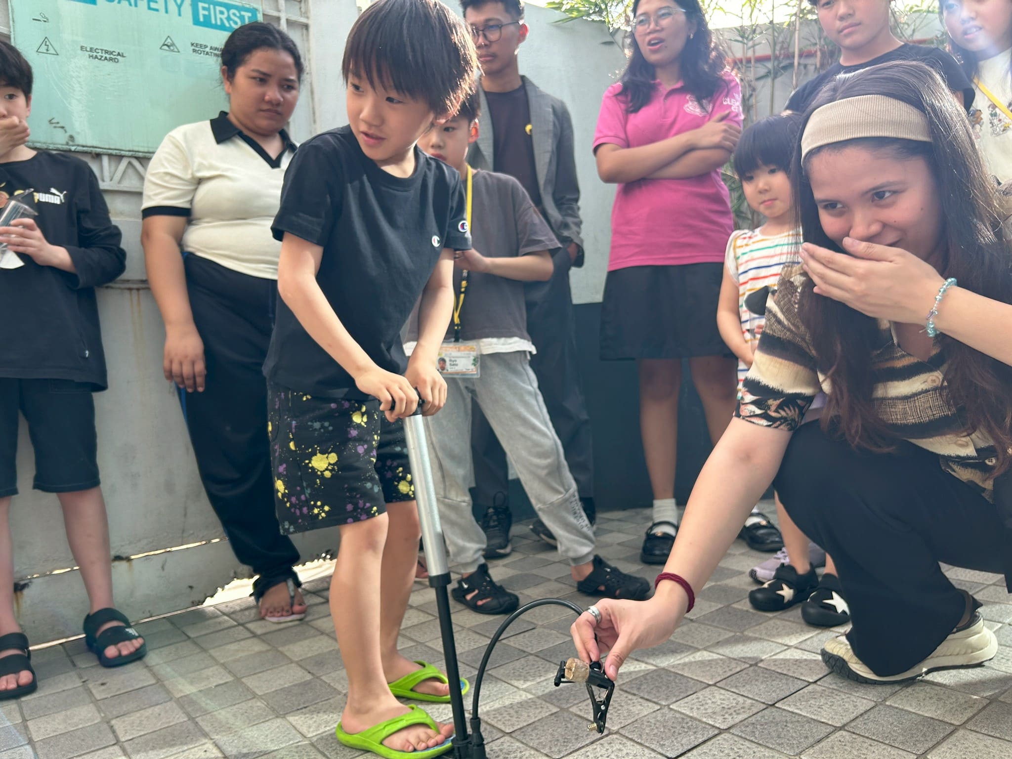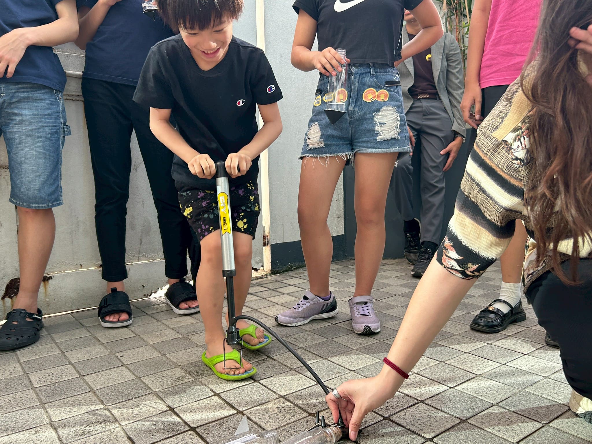 皆さん、○と▲を切ったあとは、先生がグルーガンでくっつける様子を興味深そうにじっくり観察していました。より遠くに飛ばせるようにと、空気入れを素早く押す手に思わず力が入ります。ボトルロケットで飛んだ距離を競い合いながら、クラス全員で大盛り上がり!(^^)!