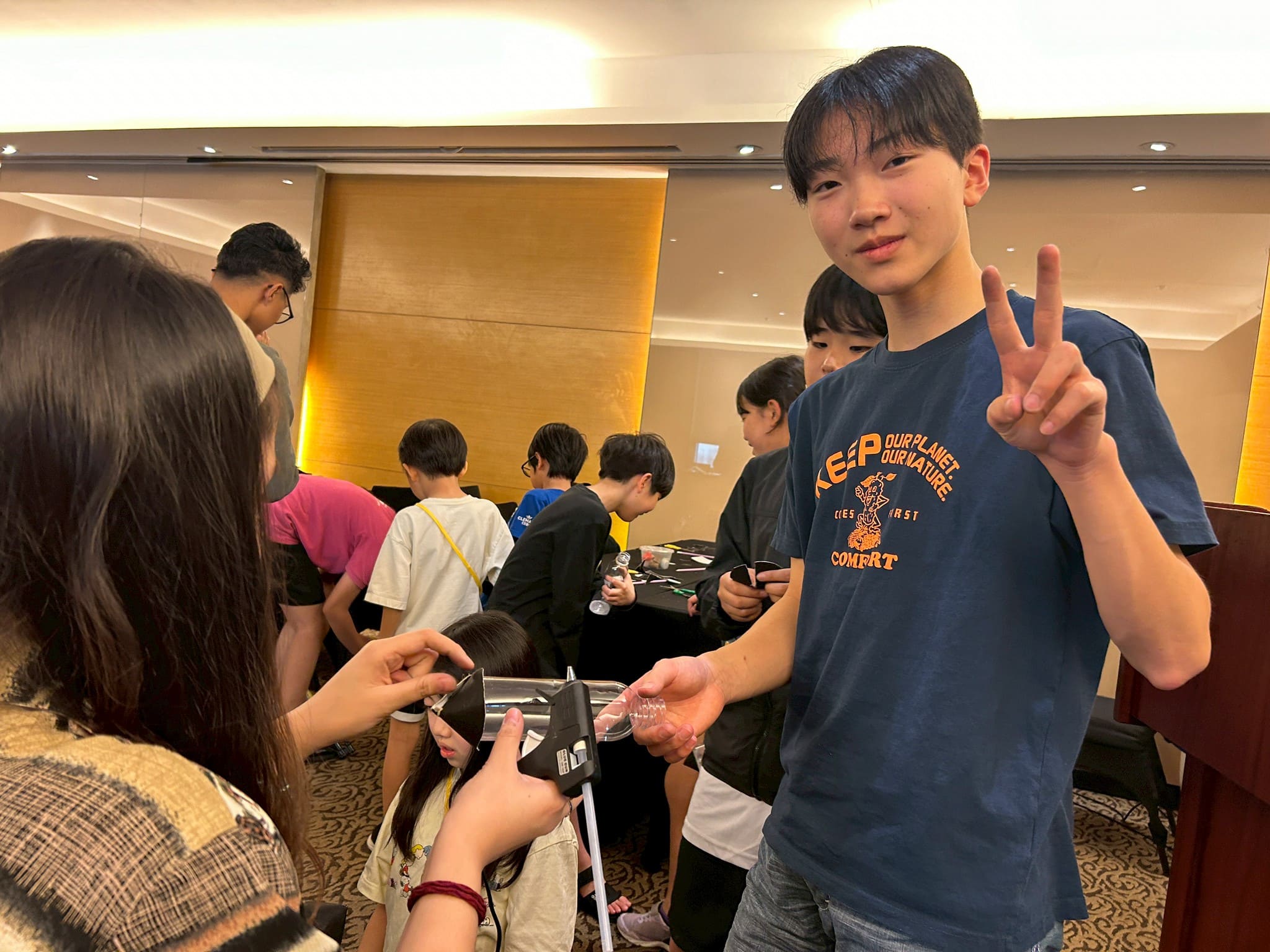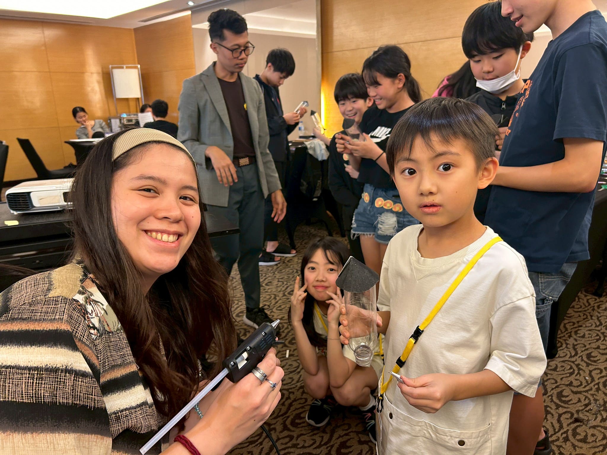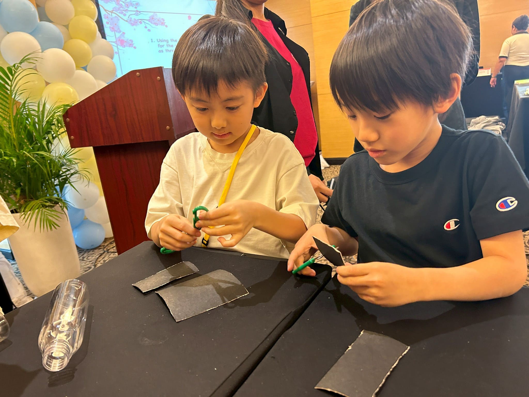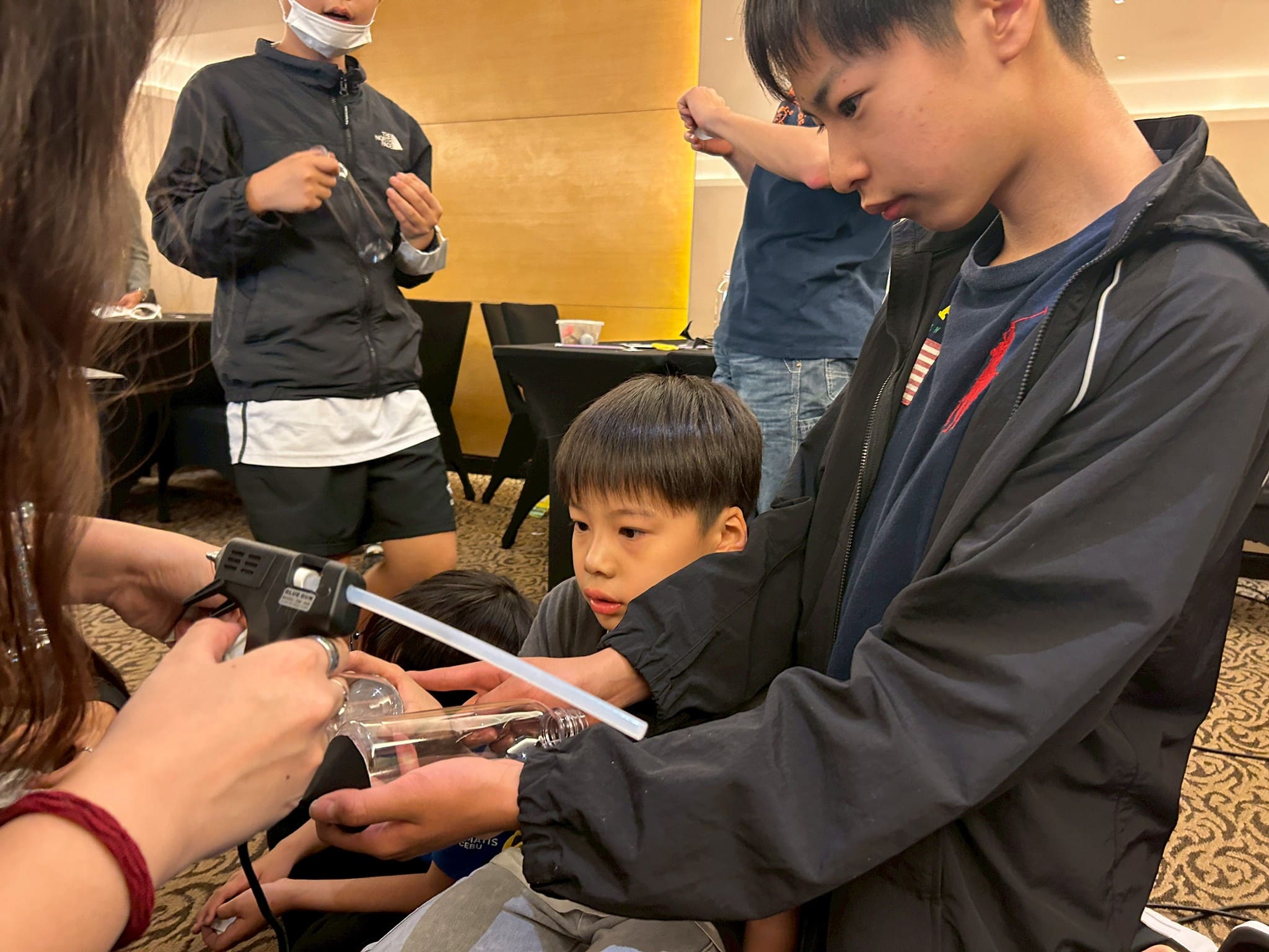 皆さん、○と▲を切ったあとは、先生がグルーガンでくっつける様子を興味深そうにじっくり観察していました。より遠くに飛ばせるようにと、空気入れを素早く押す手に思わず力が入ります。ボトルロケットで飛んだ距離を競い合いながら、クラス全員で大盛り上がり!(^^)!