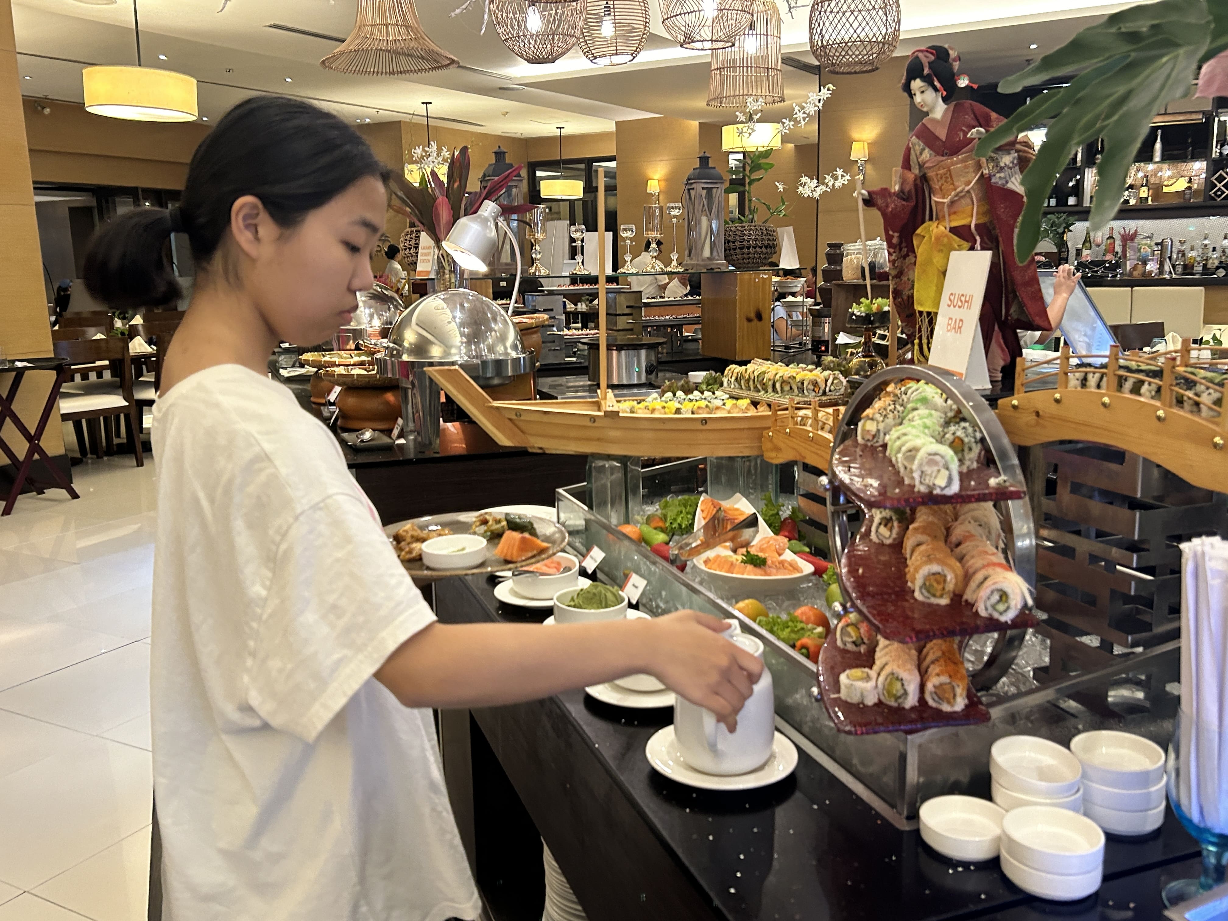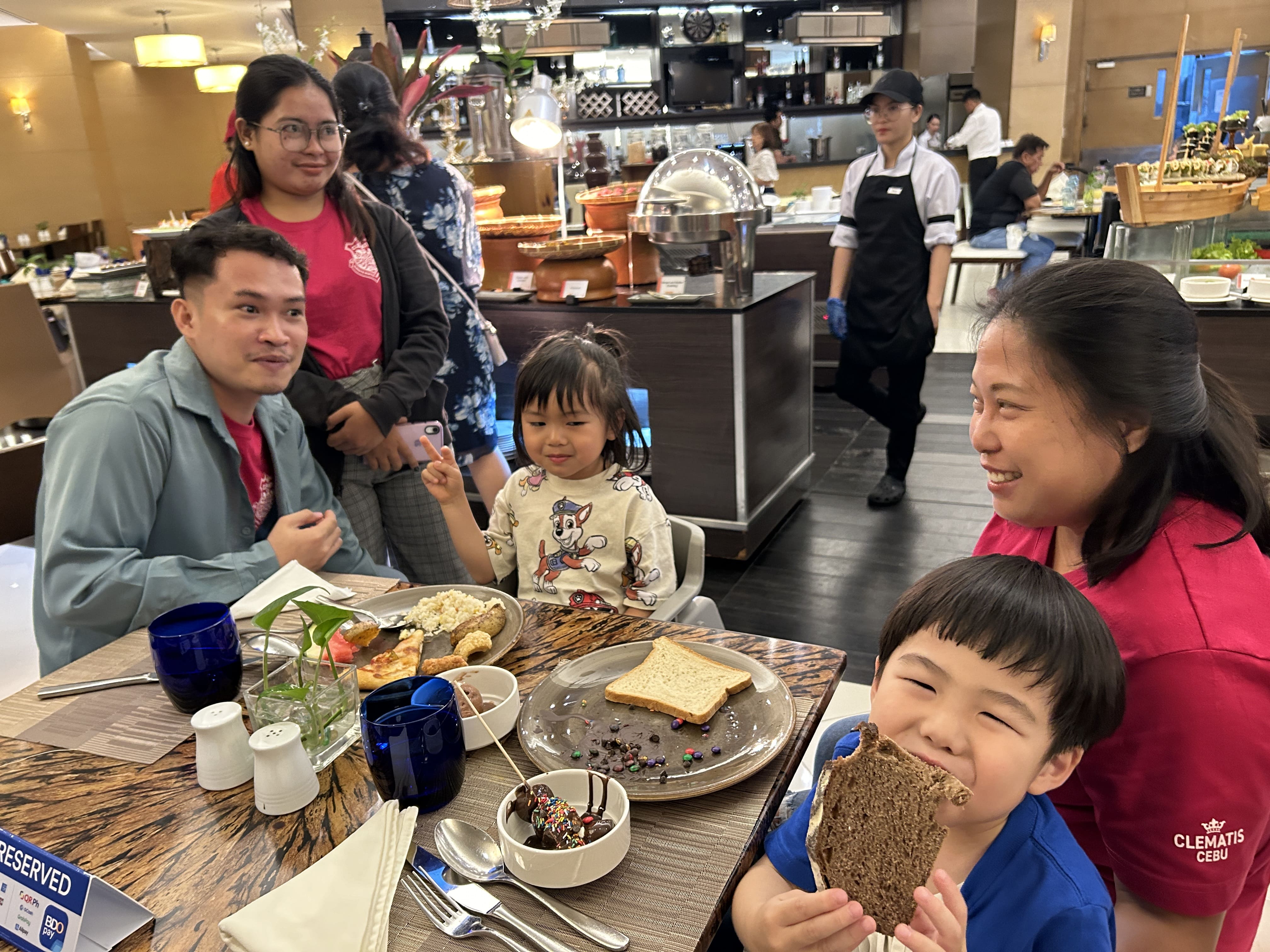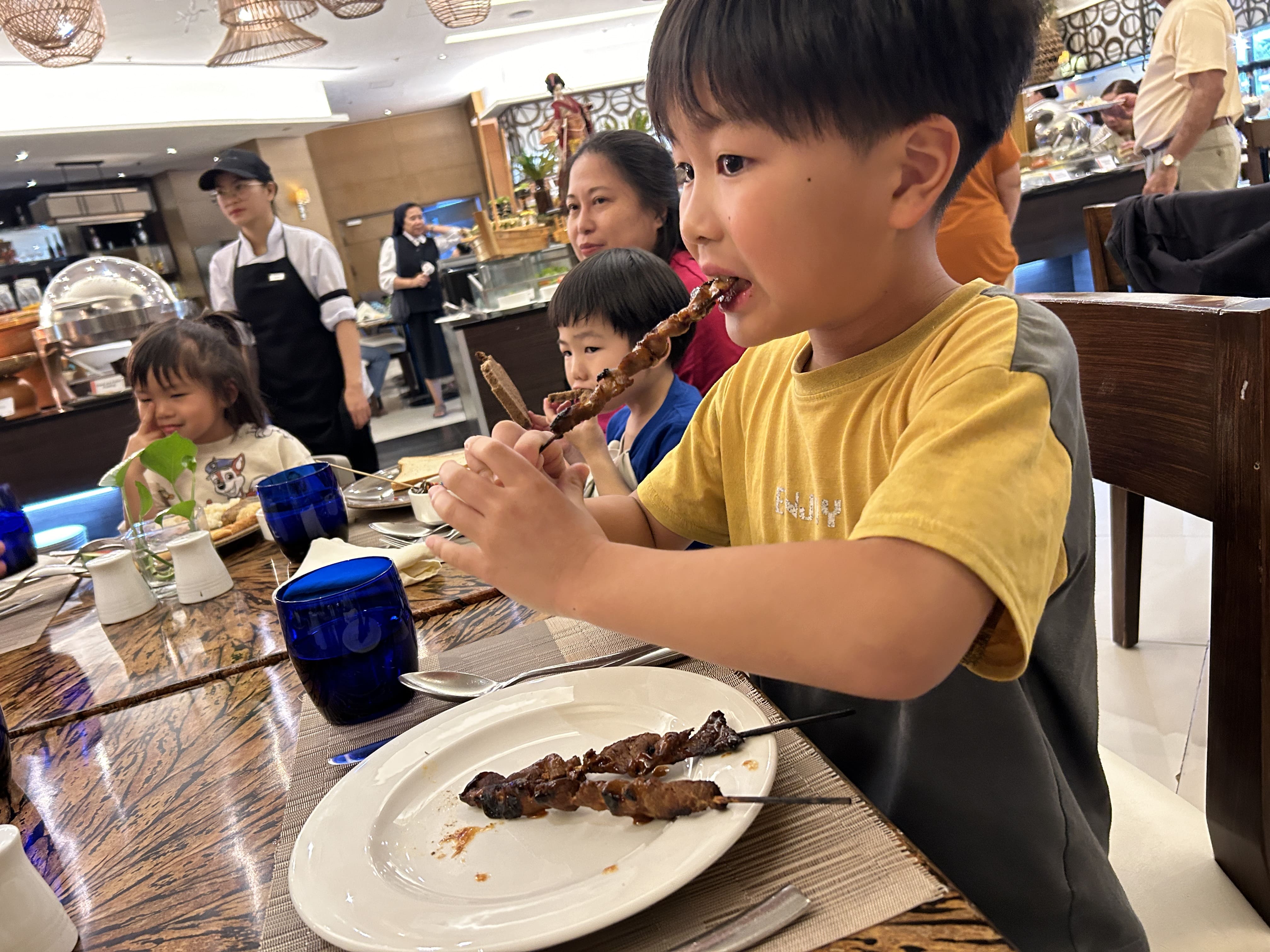開催ホテル校1Fにあるレストランの豪華ホテルブッフェは、パン、ライス、パスタも種類豊富です。また、小さなお子様が召し上がって頂ける料理の品々も、沢山の中から選べられるので、みんな自分の好きな料理を美味しそうに頬張っています。