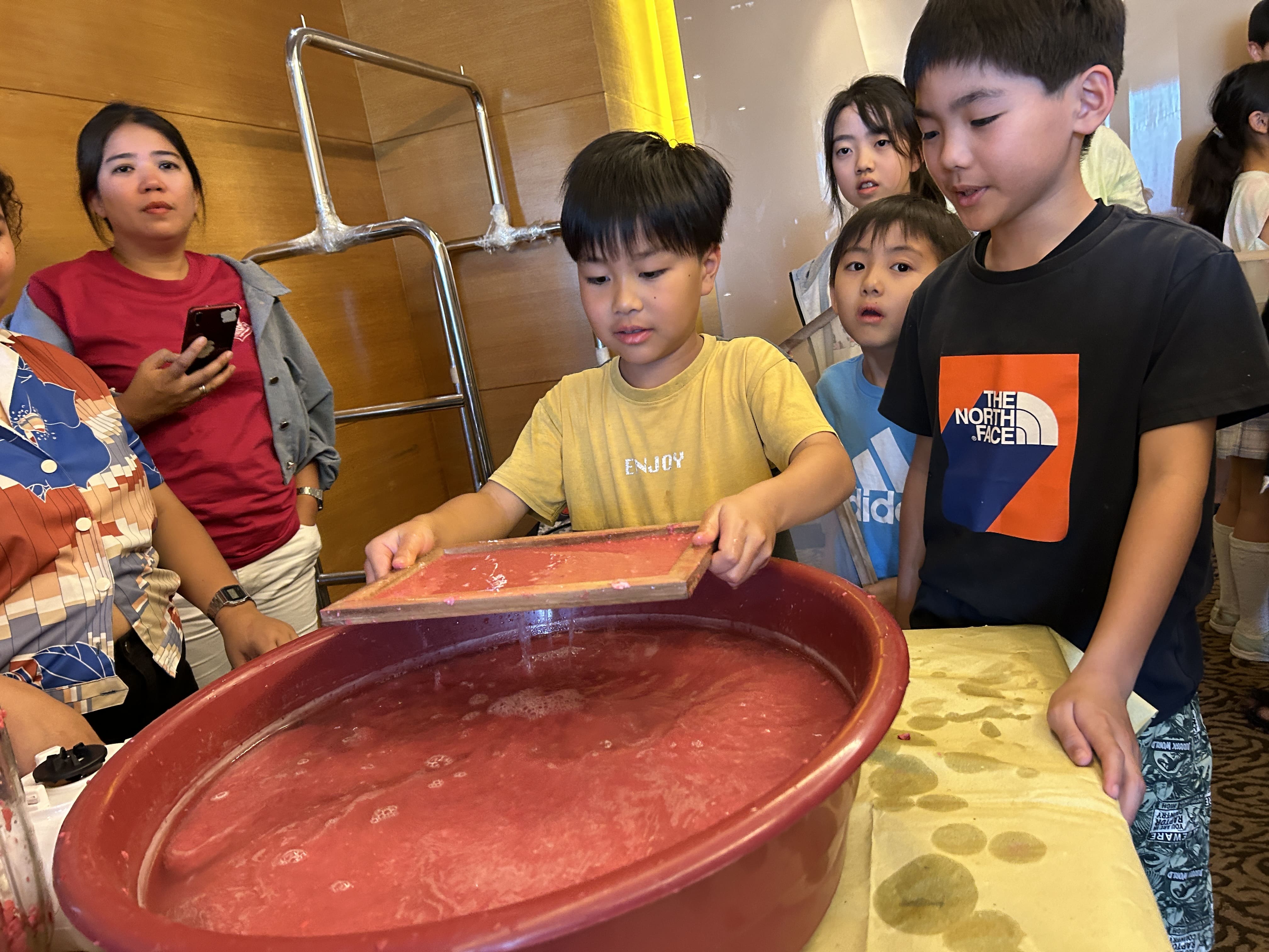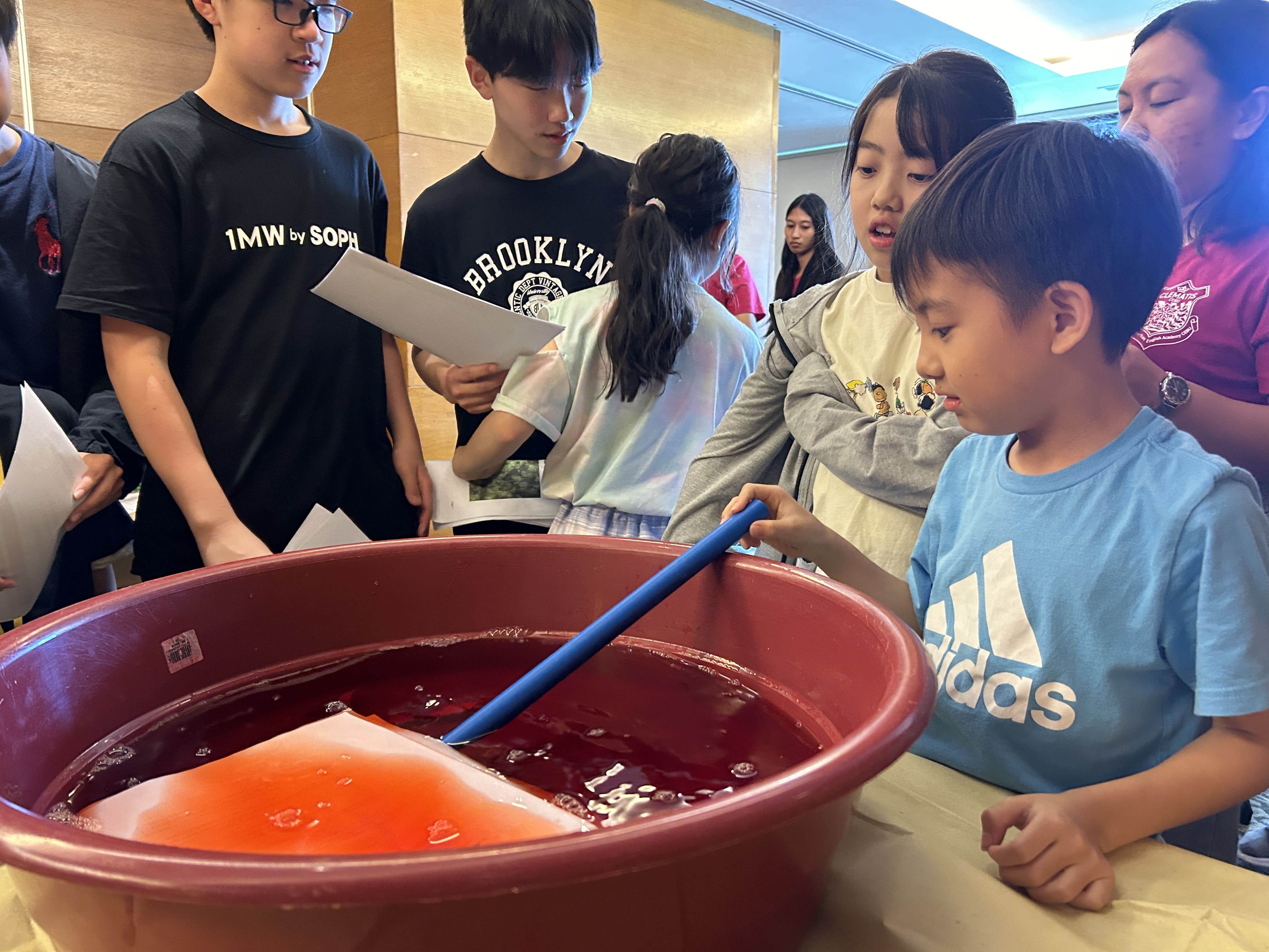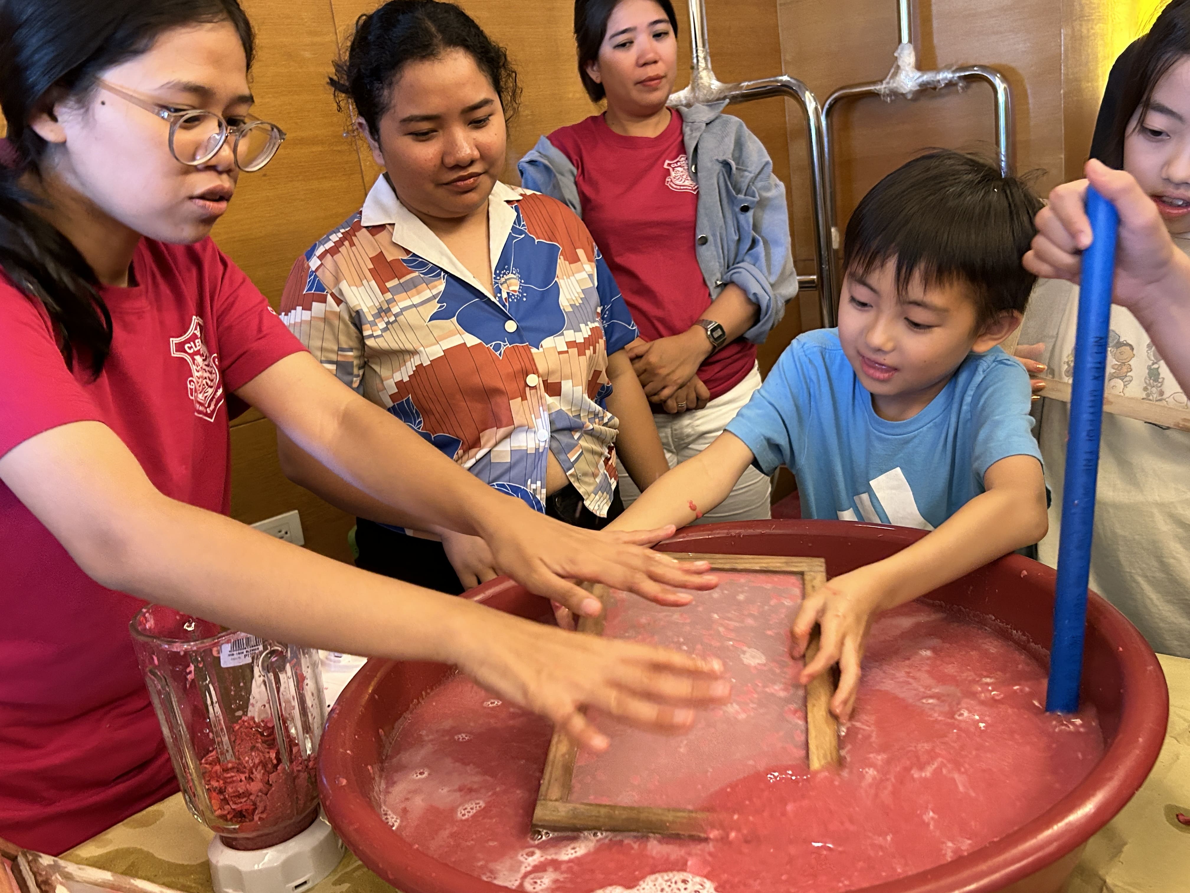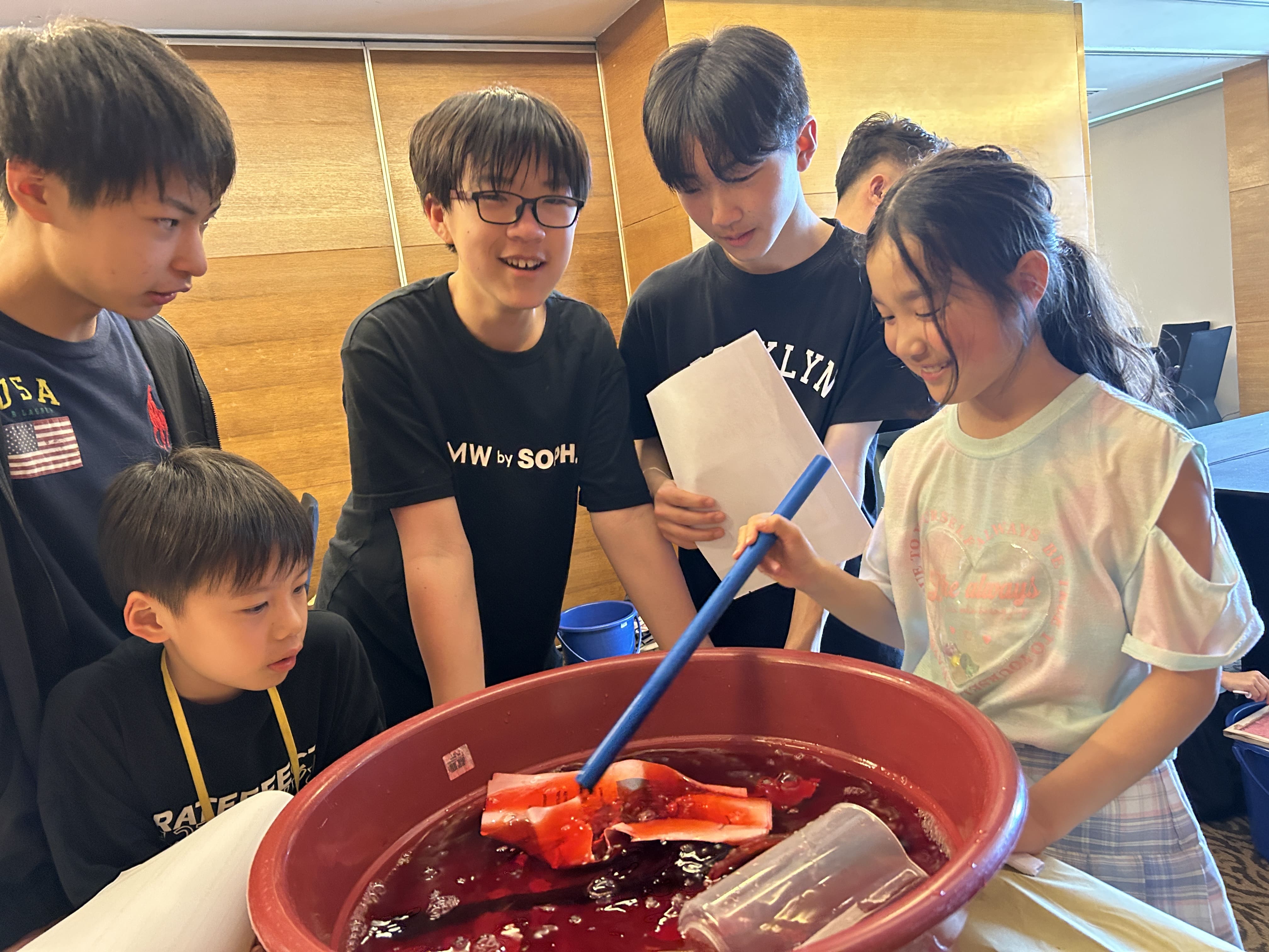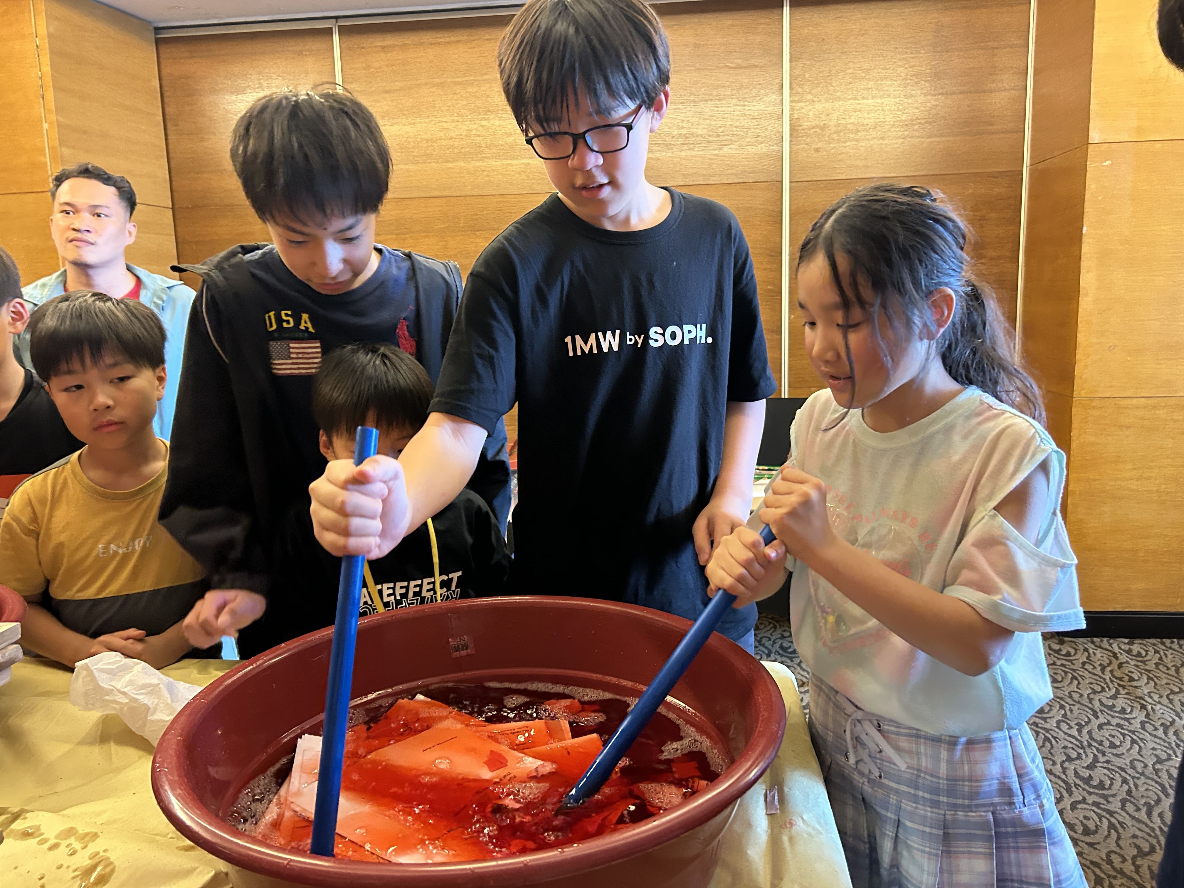 まずは雑紙を赤く染色した水の中に入れて、浸し、柔らかくします。紙が十分に柔らかくなるように、みんな一生懸命にかき混ぜていきます。
