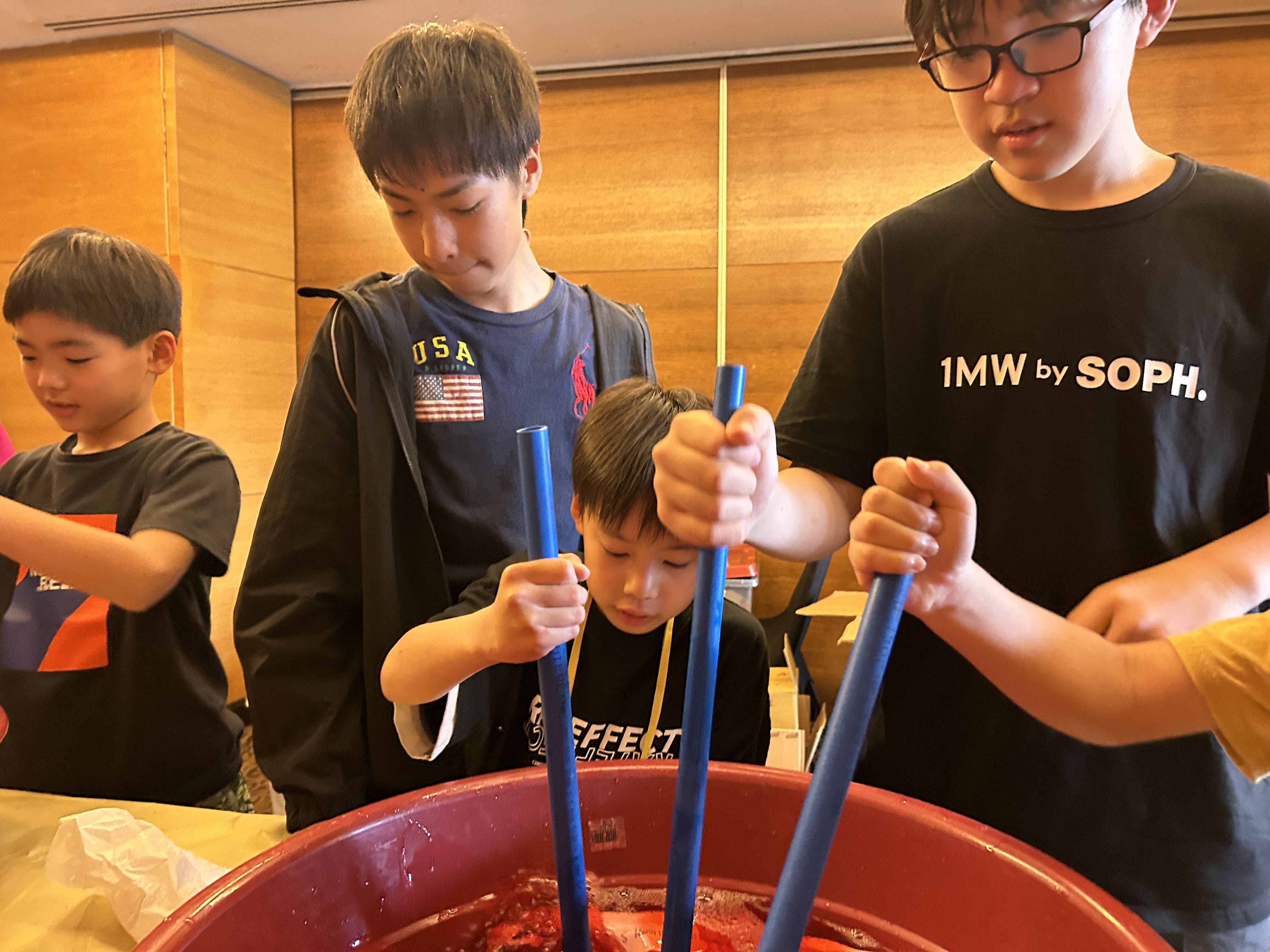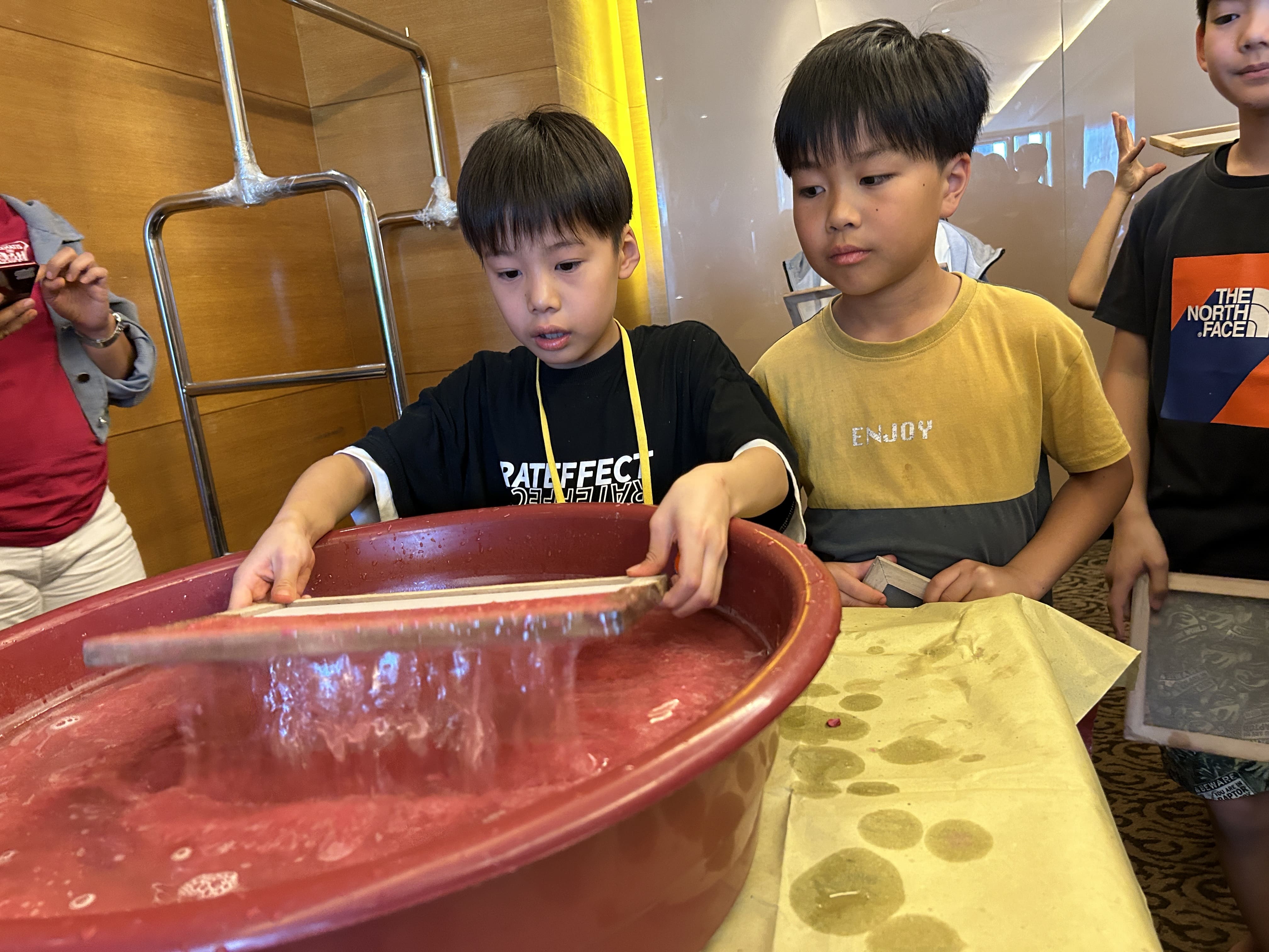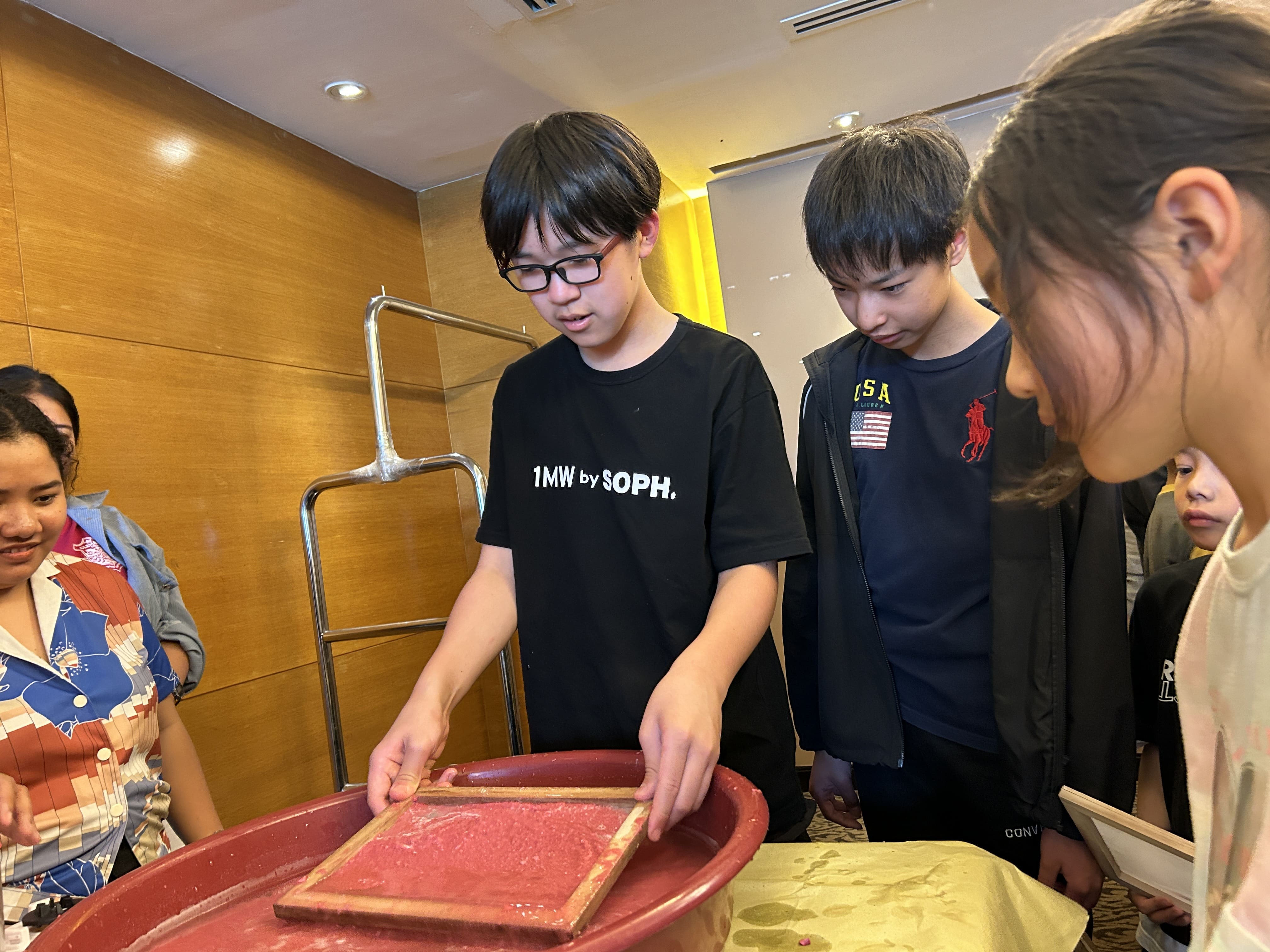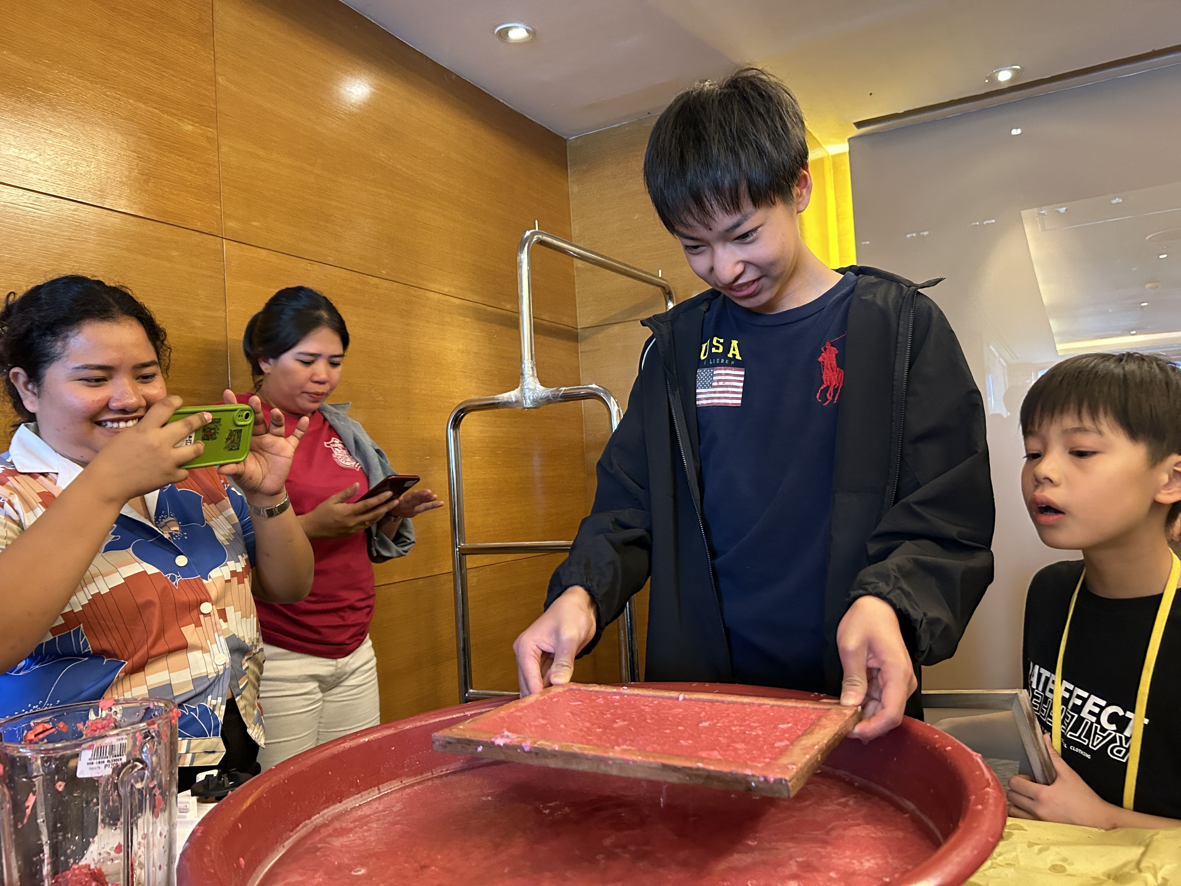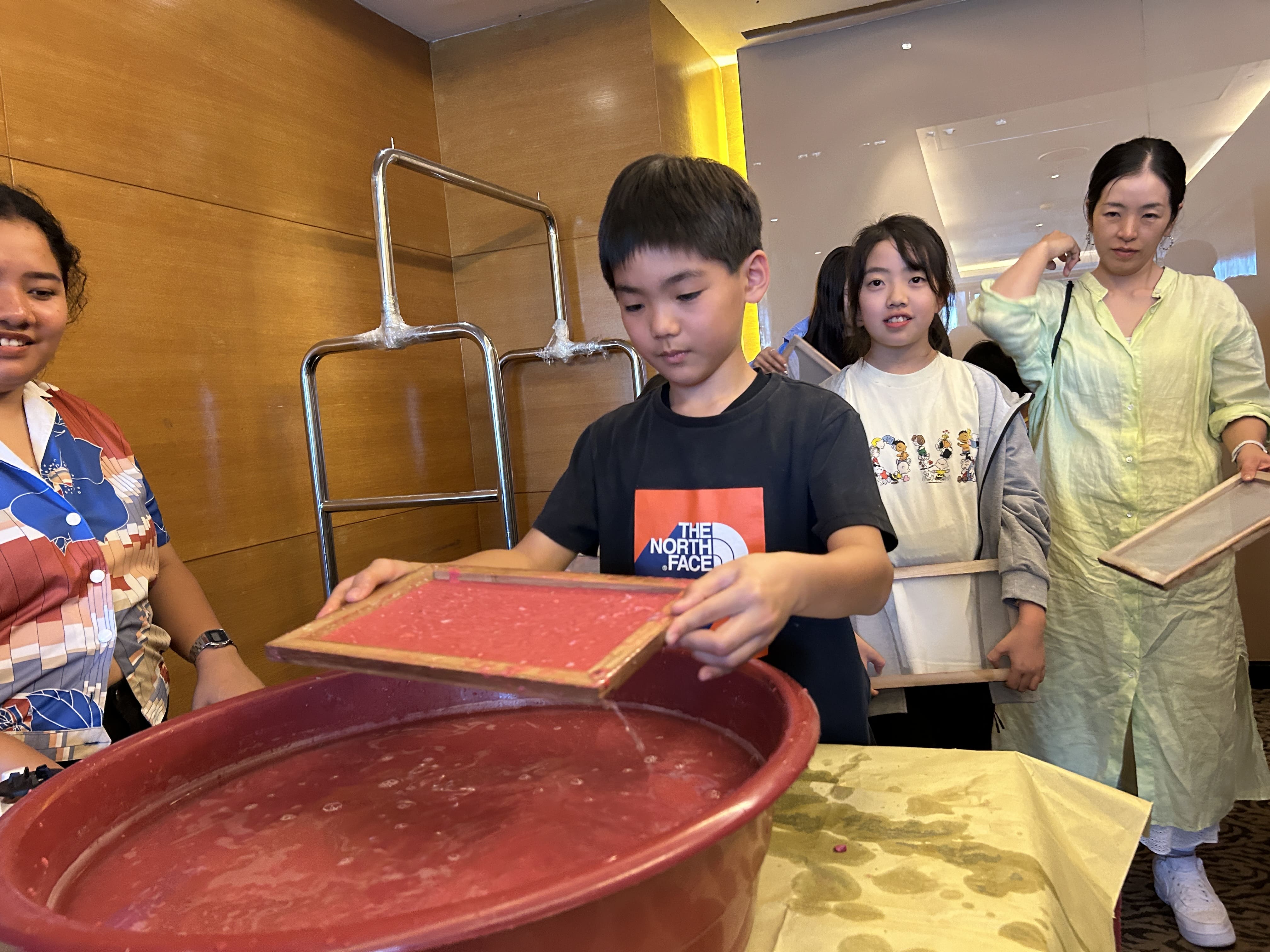 まずは雑紙を赤く染色した水の中に入れて、浸し、柔らかくします。紙が十分に柔らかくなるように、みんな一生懸命にかき混ぜていきます。
