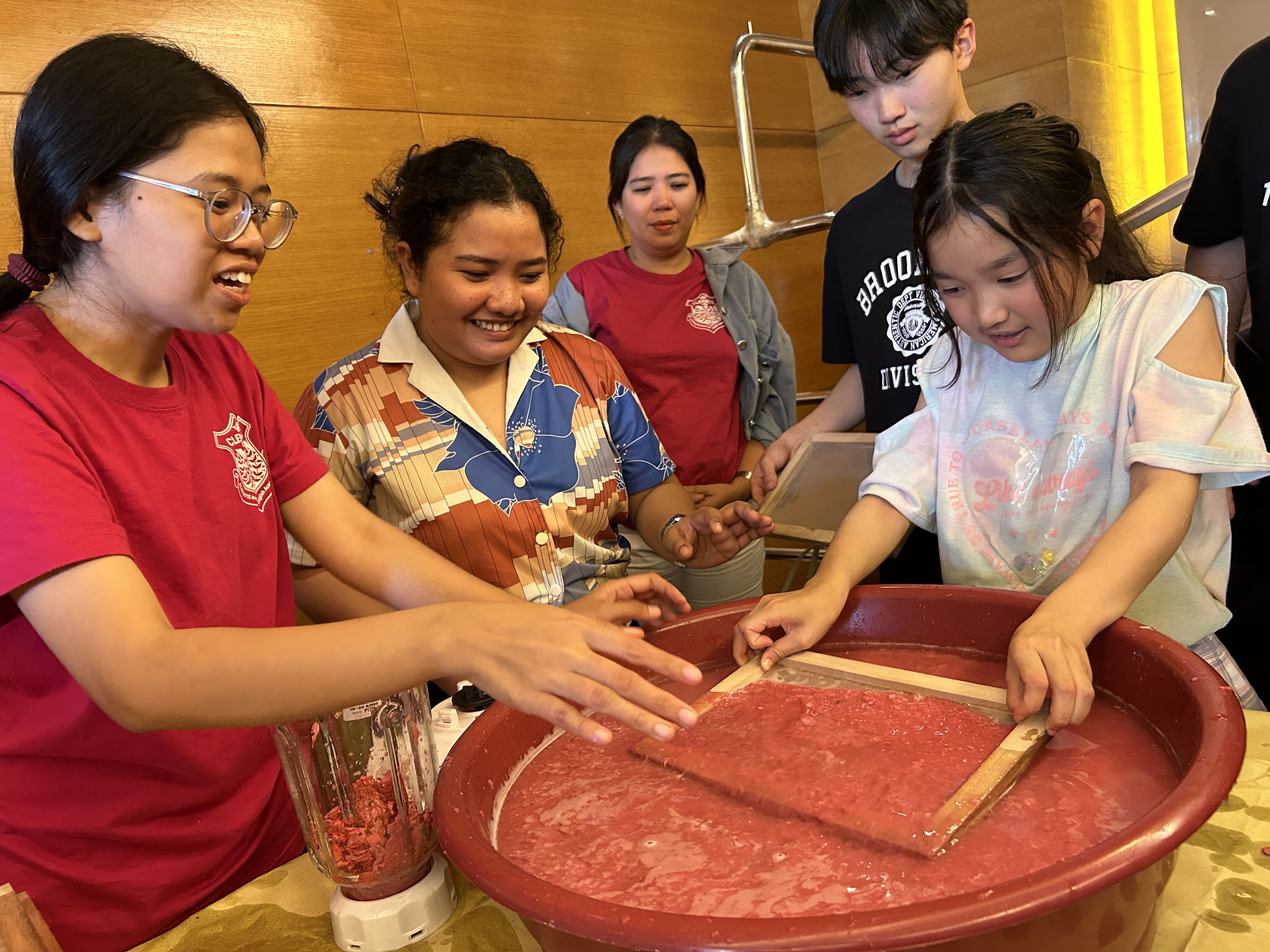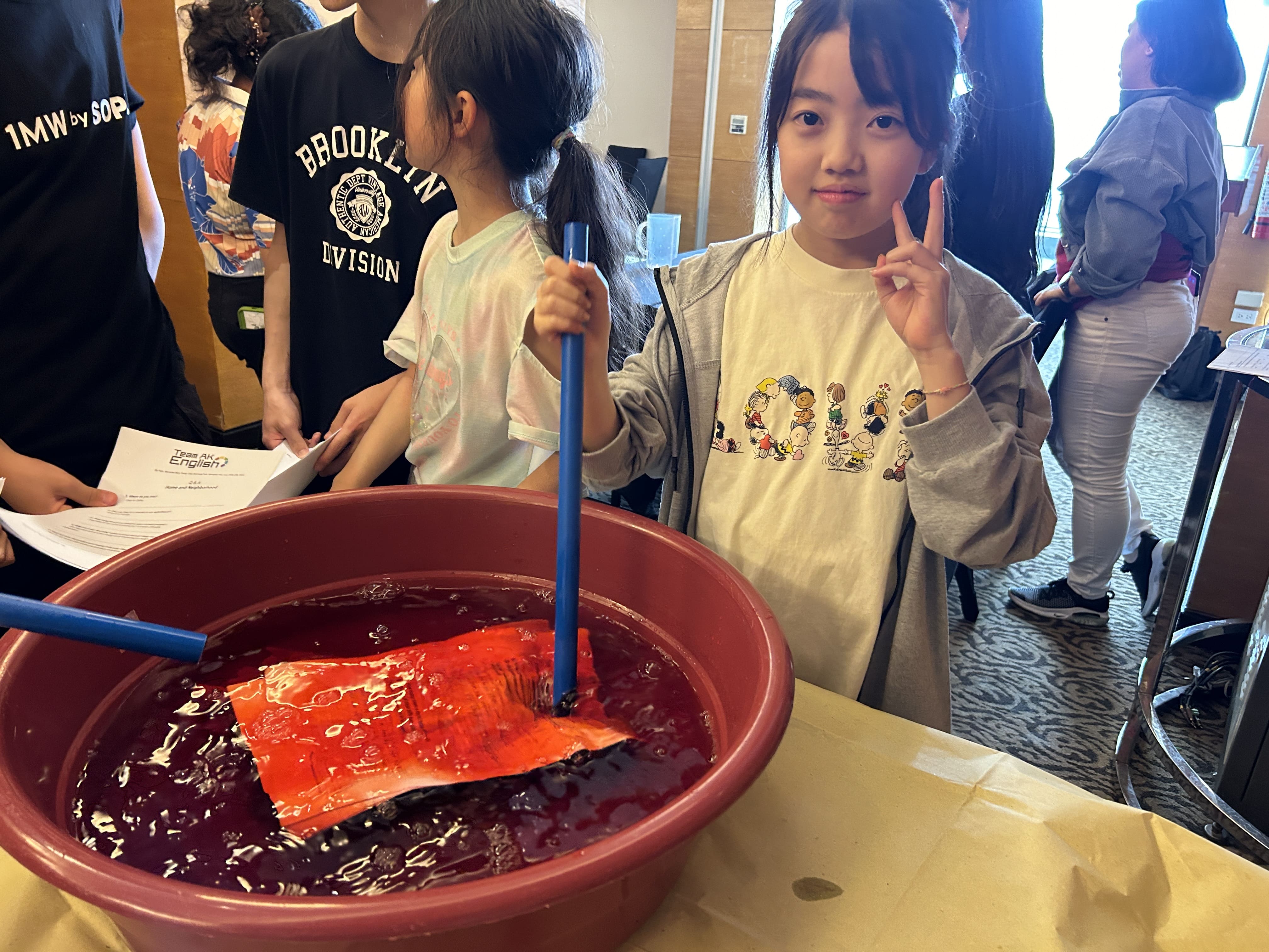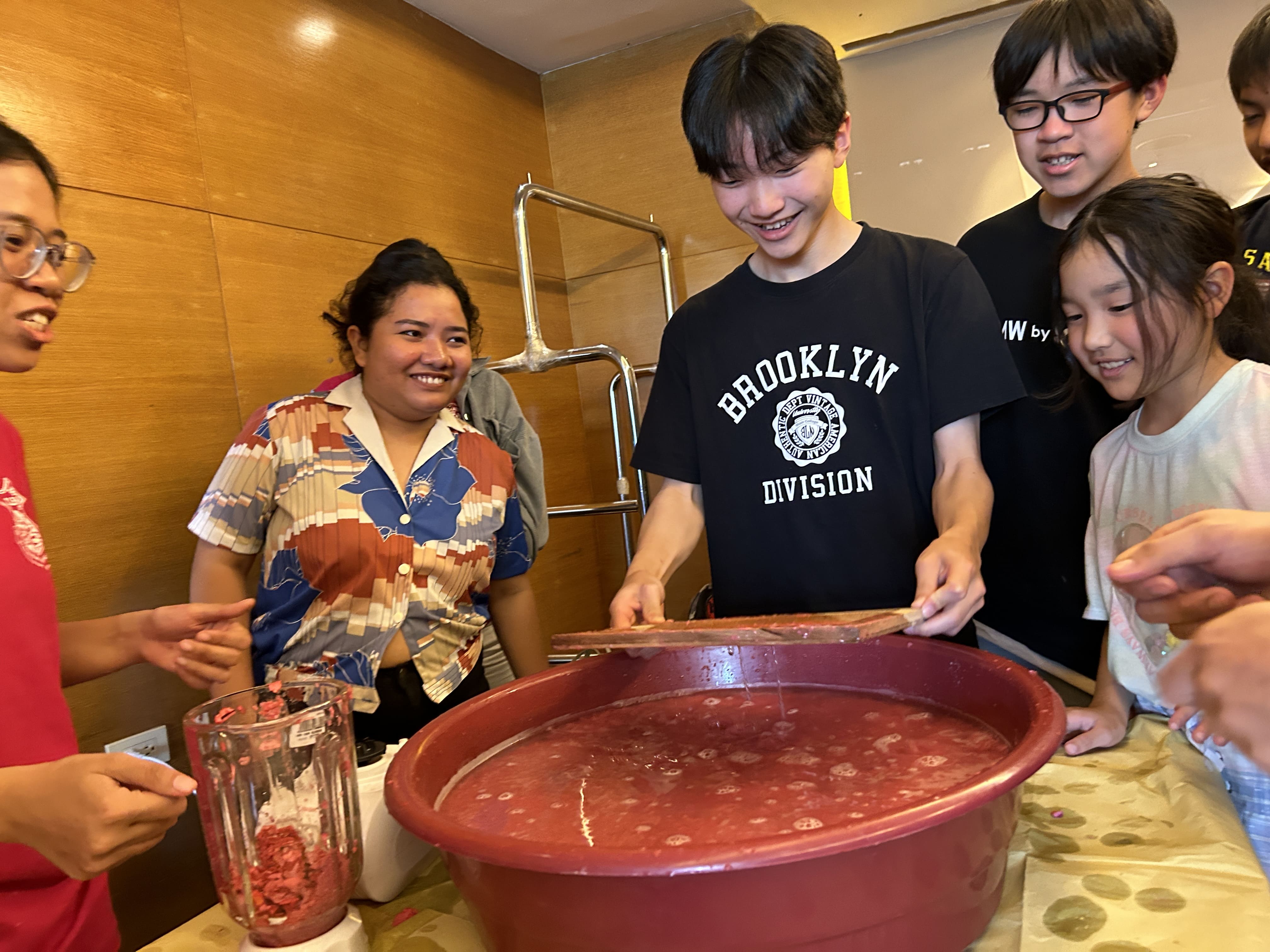 その後、赤く染まった紙をミキサーにいれて粉々にします。見た目が「strawberry shakeみたい!」と歓声が上がっていました。