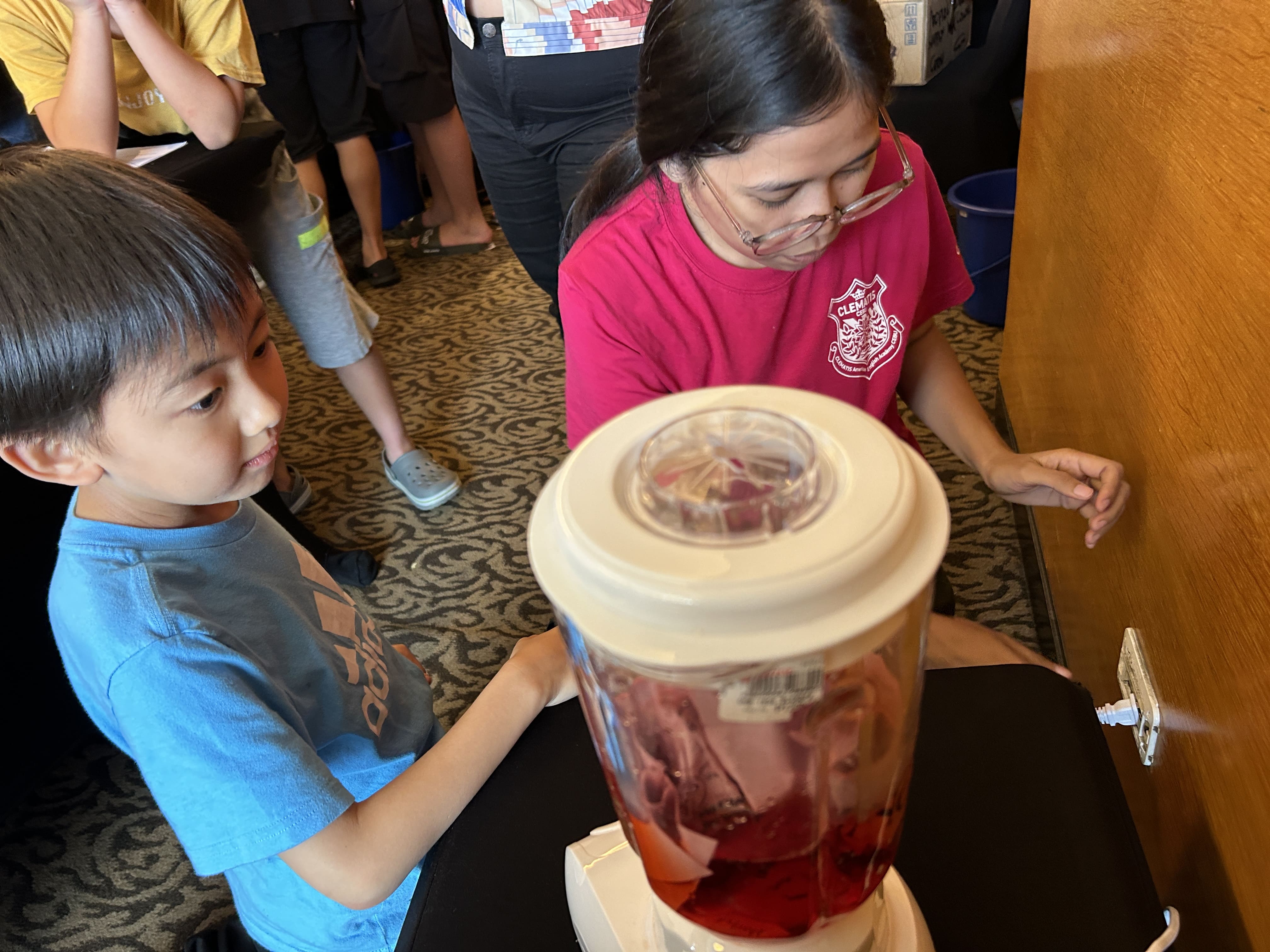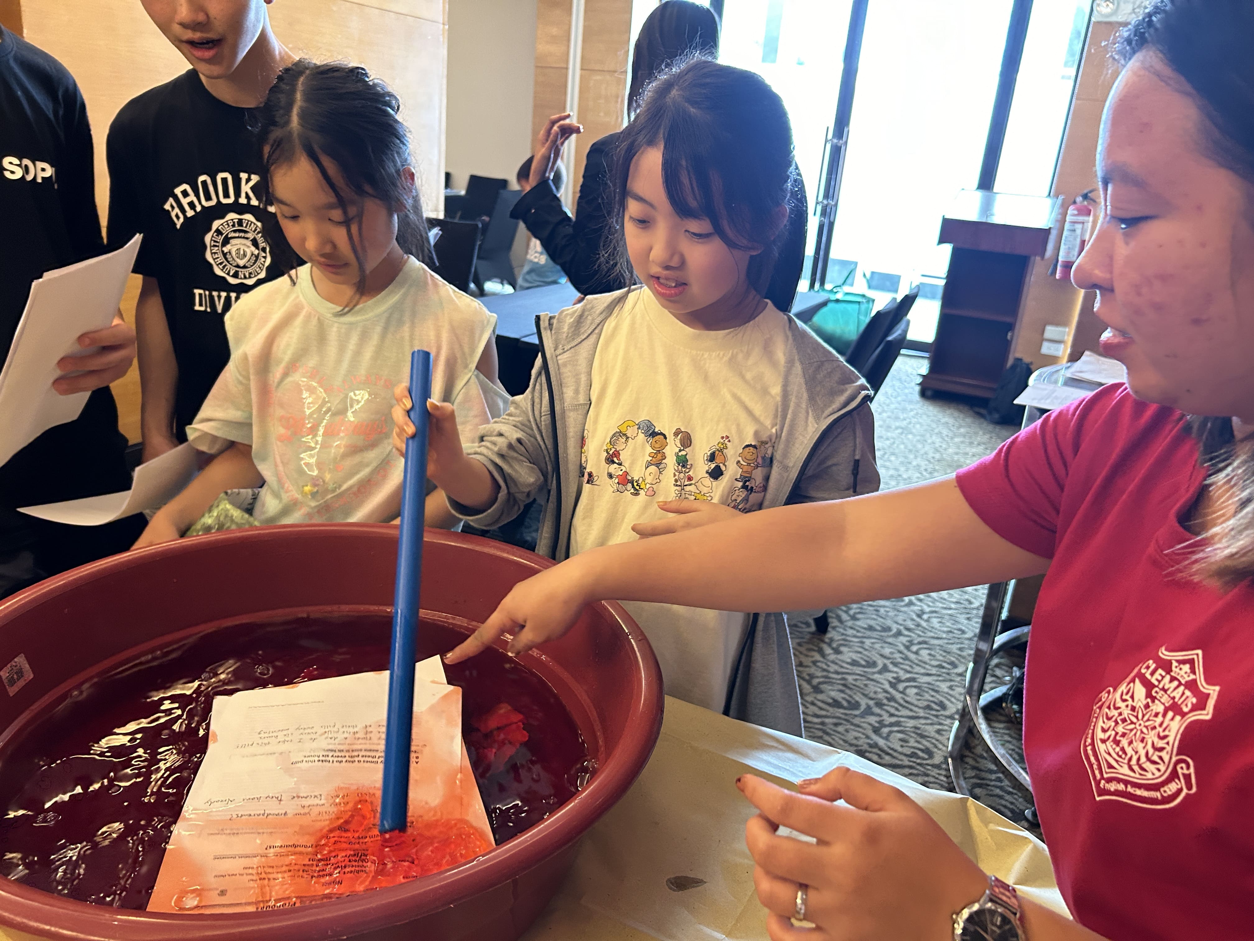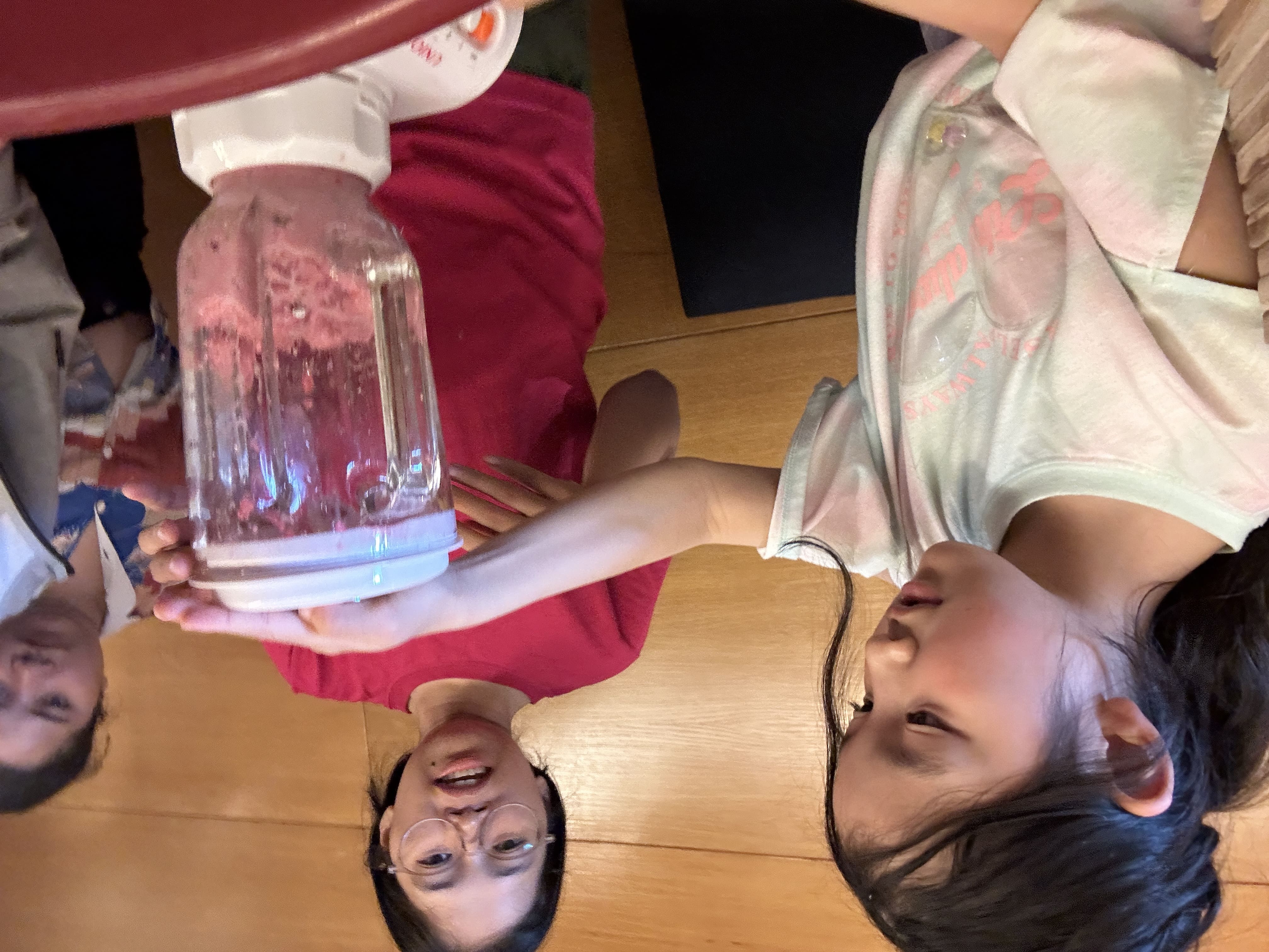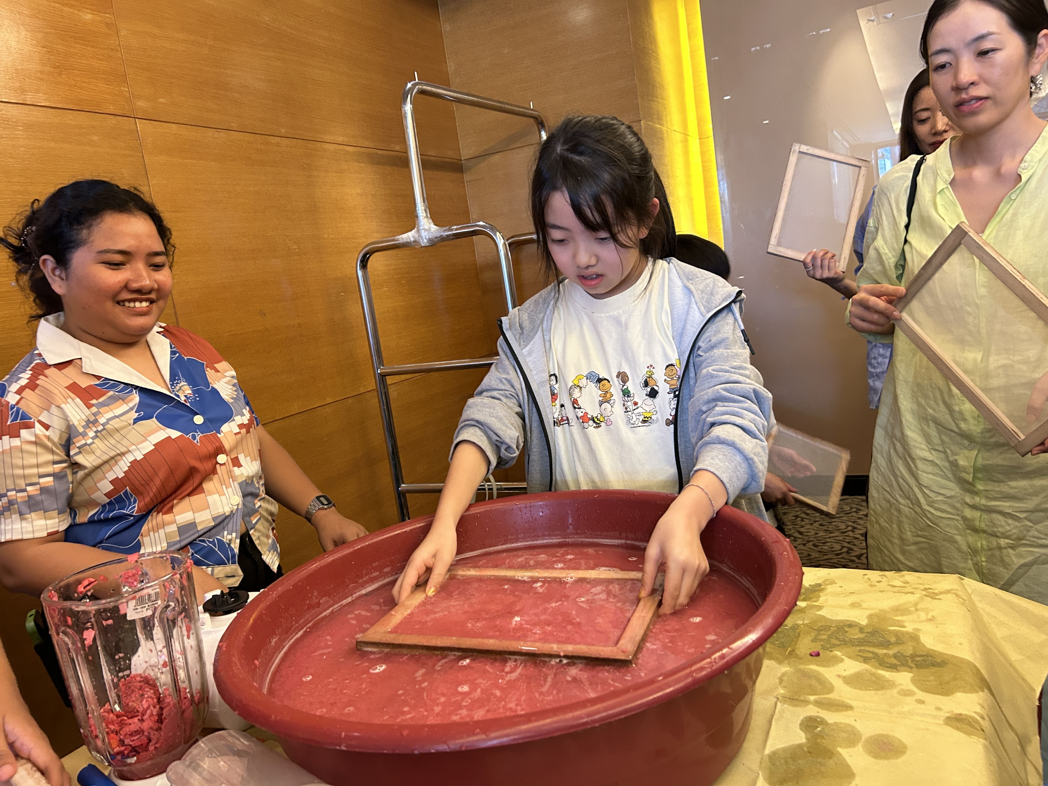 その後、赤く染まった紙をミキサーにいれて粉々にします。見た目が「strawberry shakeみたい!」と歓声が上がっていました。