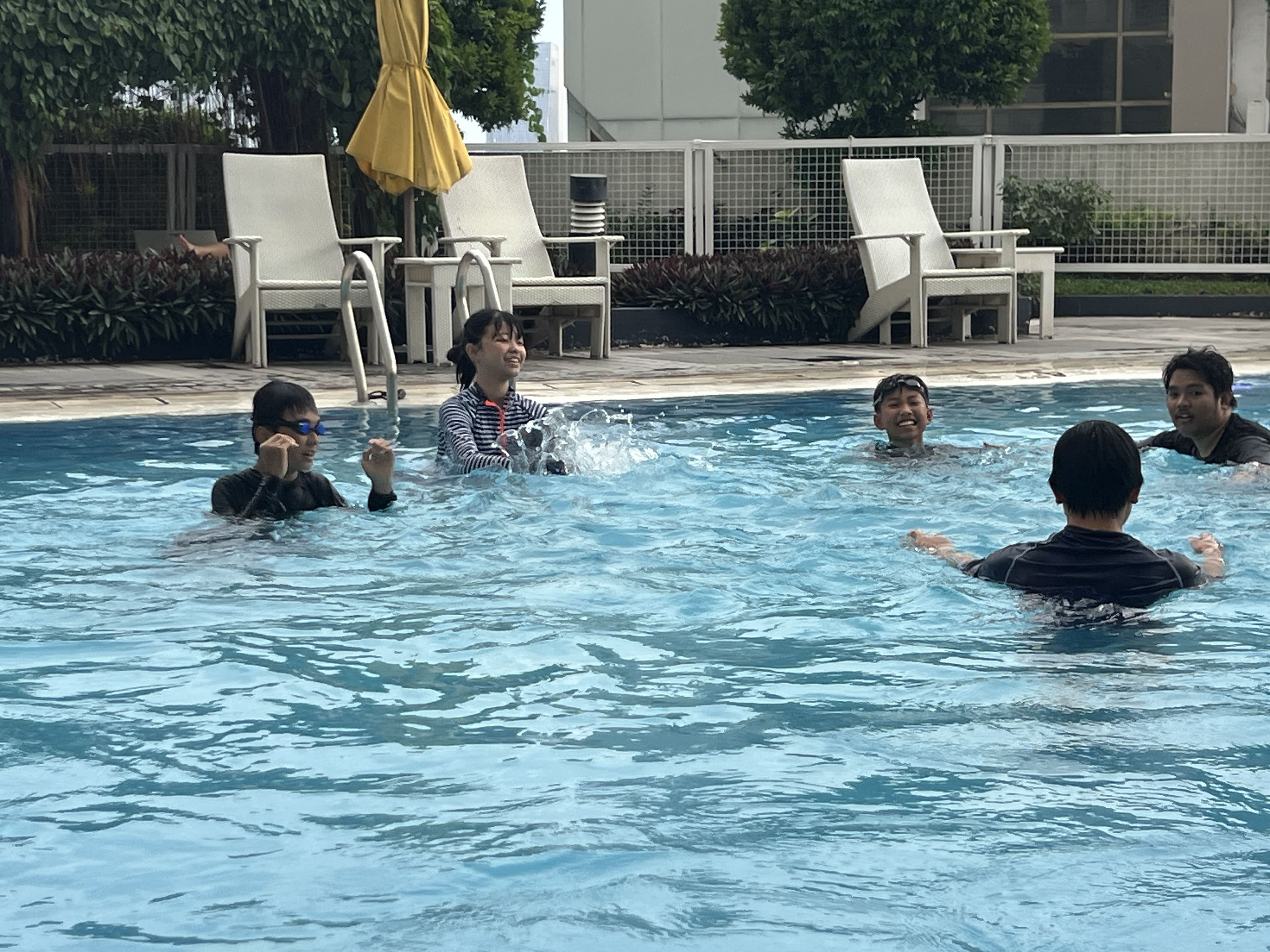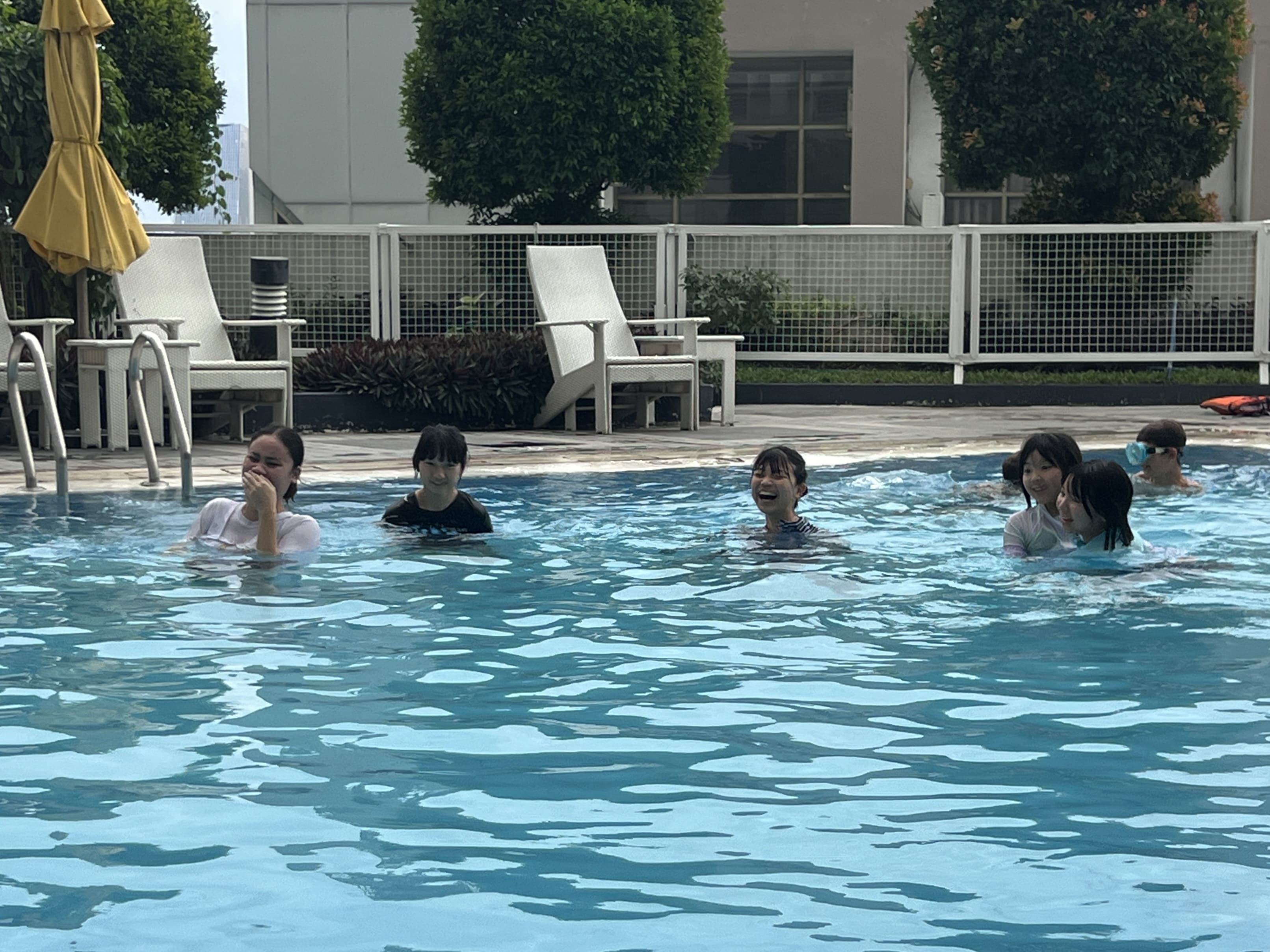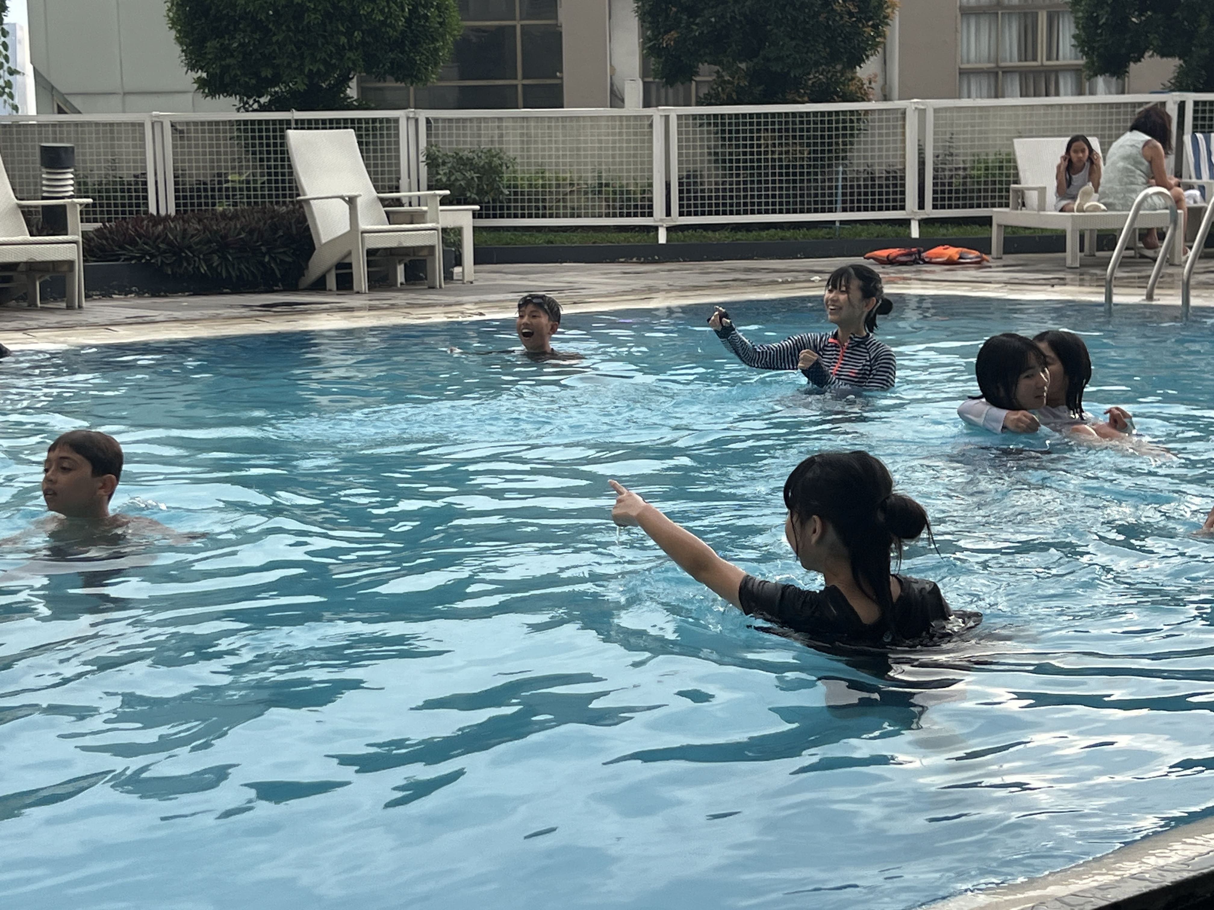 英語講師とキャンプ参加生が一緒になって水遊びを楽しみますが、プールタイムもしっかり英語漬けなんです(*^-^*)
