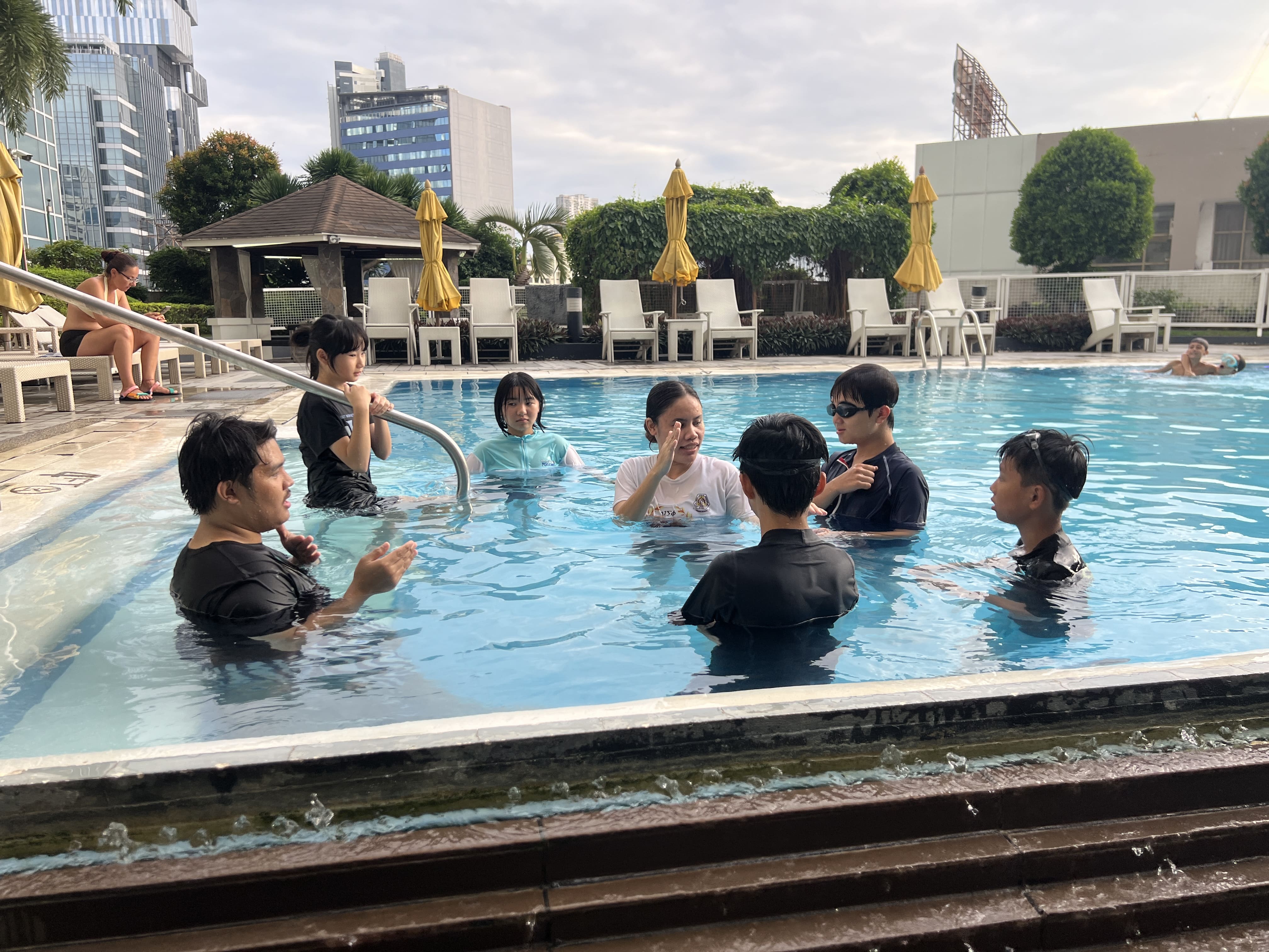 プールアクティビティで使用する単語(潜る、進む、水中、トンネル、くぐる、水に顔をつける、水から顔を上げる、手びれ、足びれなど)を使って、どのように英語で表現するのか、英語講師が丁寧にレクチャーしていきます。遊びを通して英語力アップへ!