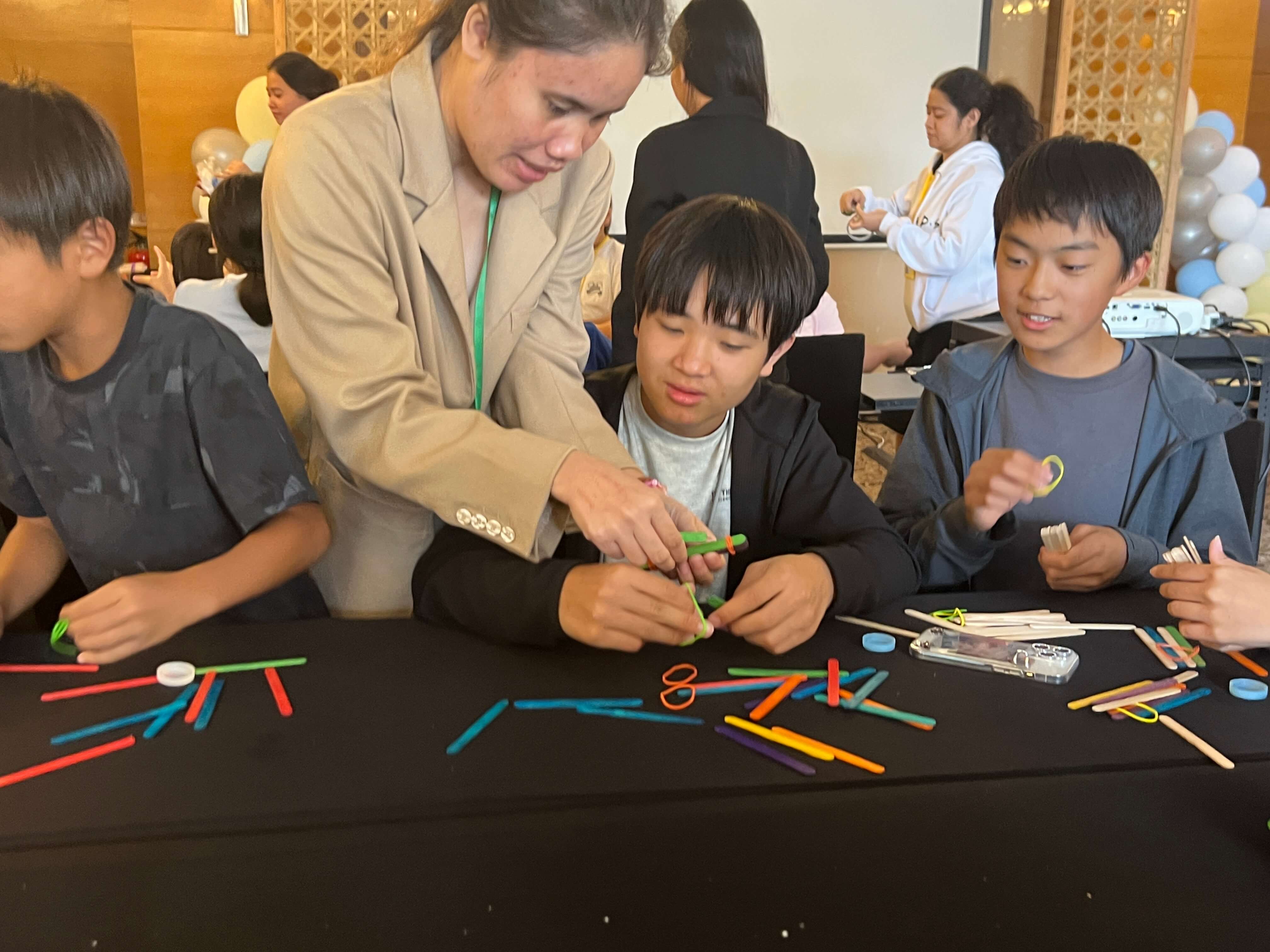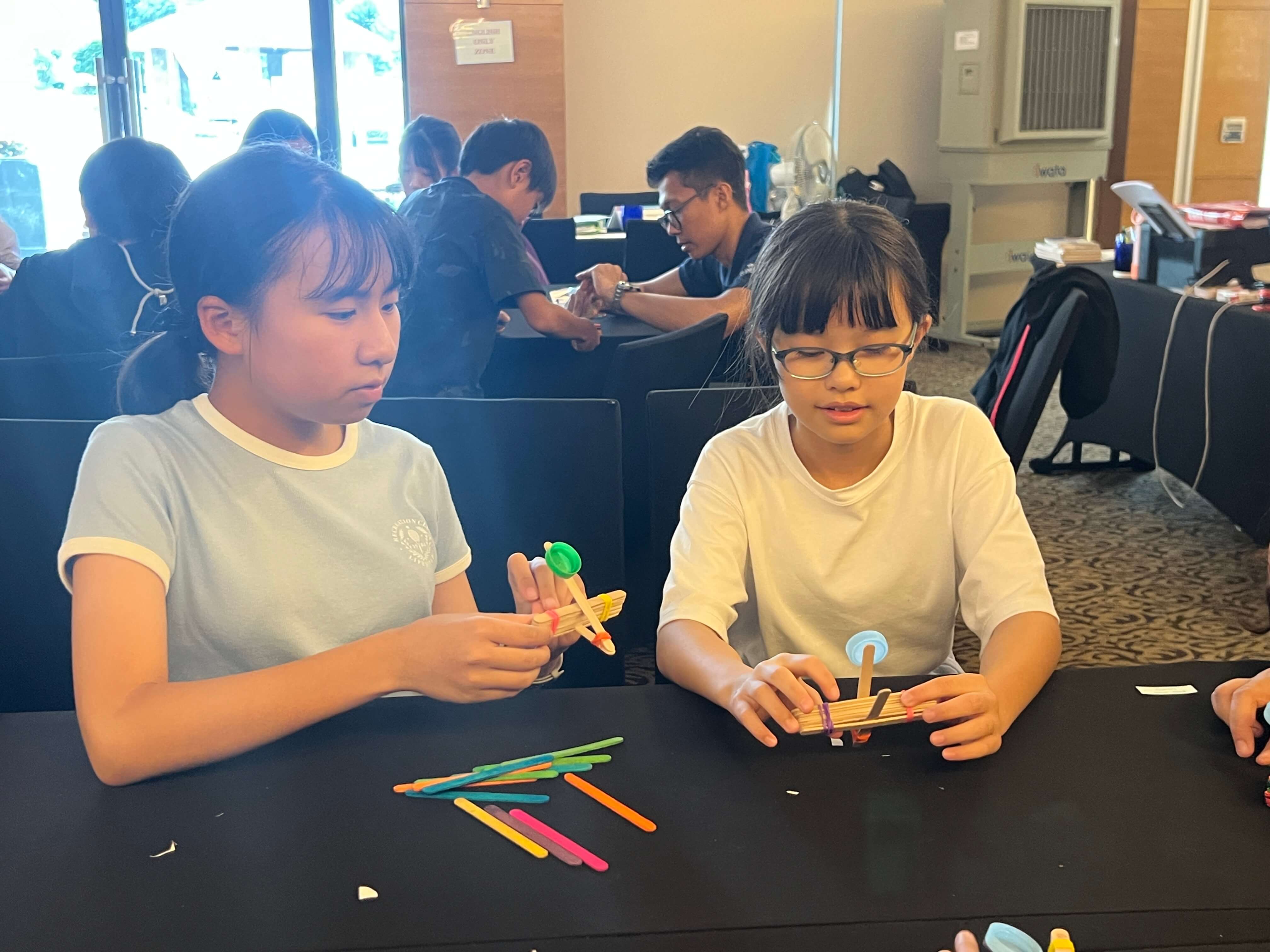 「どの構造が一番遠くに飛ぶの?」「ゴムの張力が強いほど飛ぶ距離が長くなるのかな?」など、グループで目的や仮説を立てました。