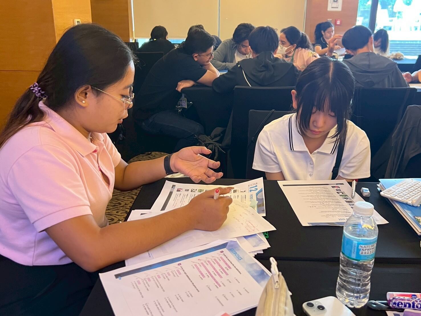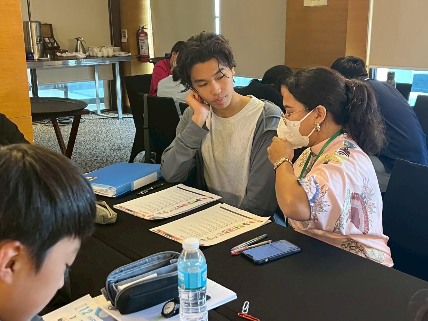 他の生徒とディスカッション。教室の空気は緊張の中にも仲間意識が芽生え、互いに励まし合う声が飛び交います。