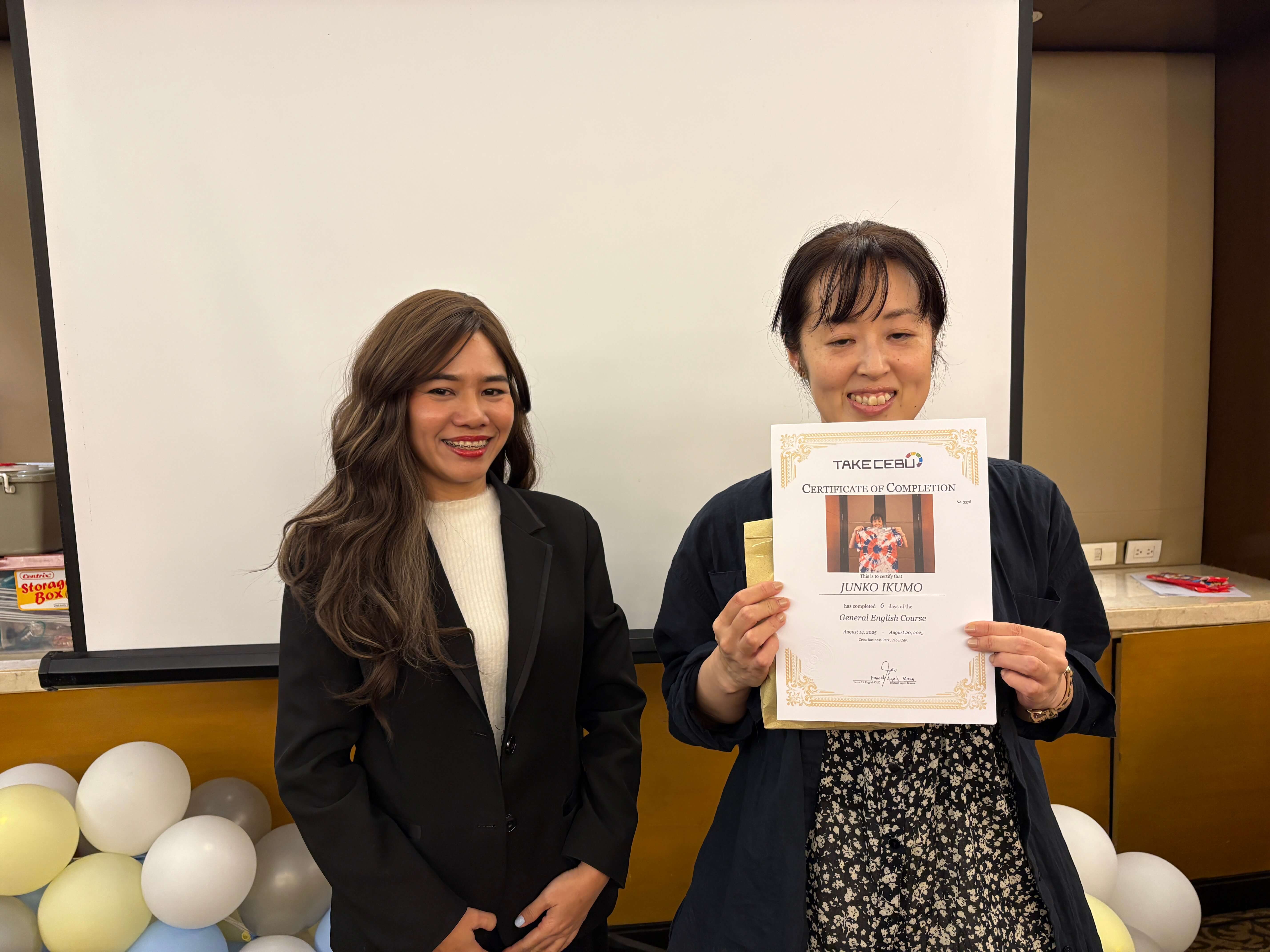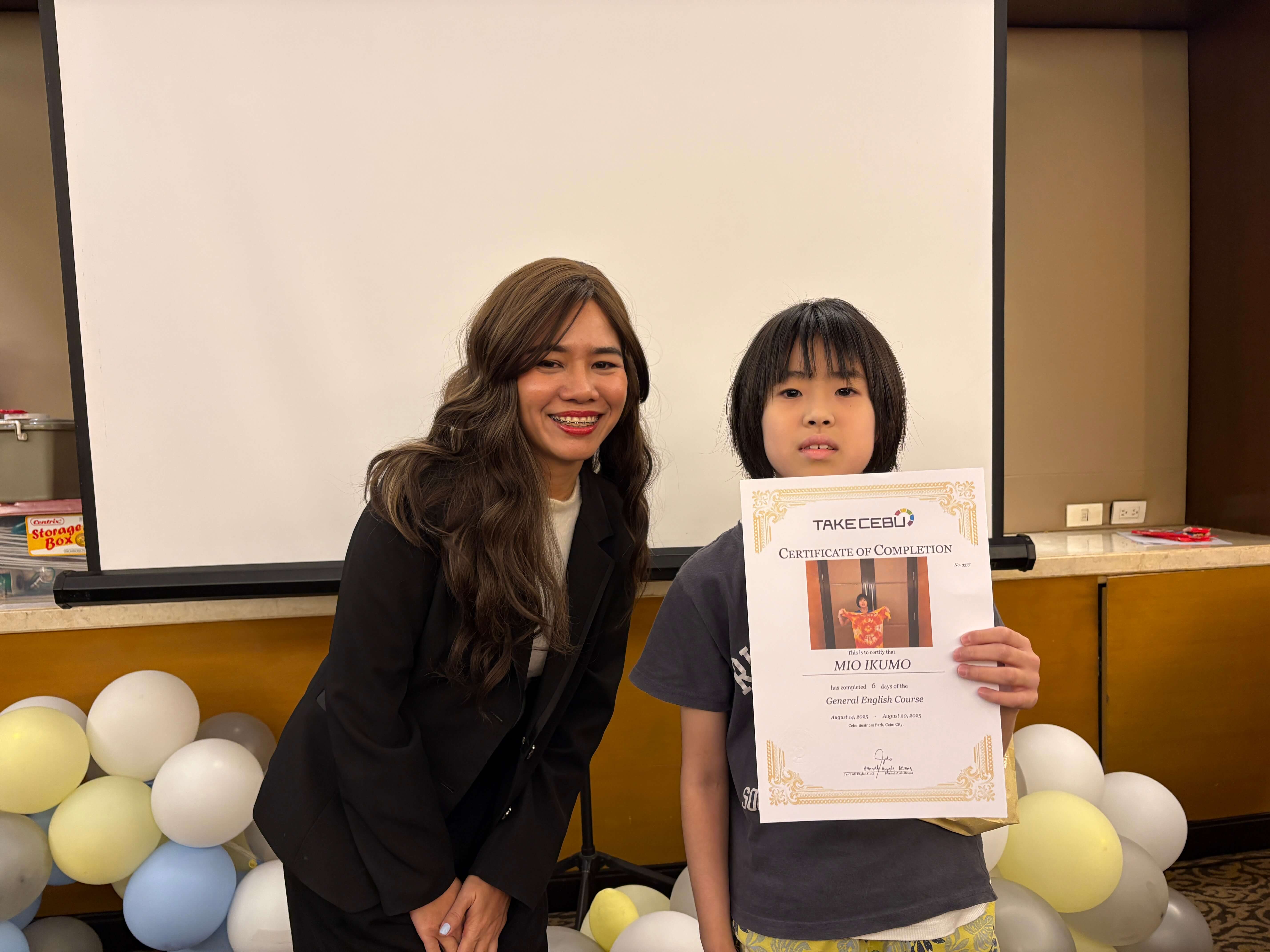 セブナビ×TAKE CEBU 夏休み英語漬けジュニアキャンプ・親子キャンププログラムの卒業式では、毎回、担当講師から卒業生に向けて心温まるメッセージが贈られます。1対1のレッスンで築き上げた信頼関係が心に響く、温かい場面となりました。