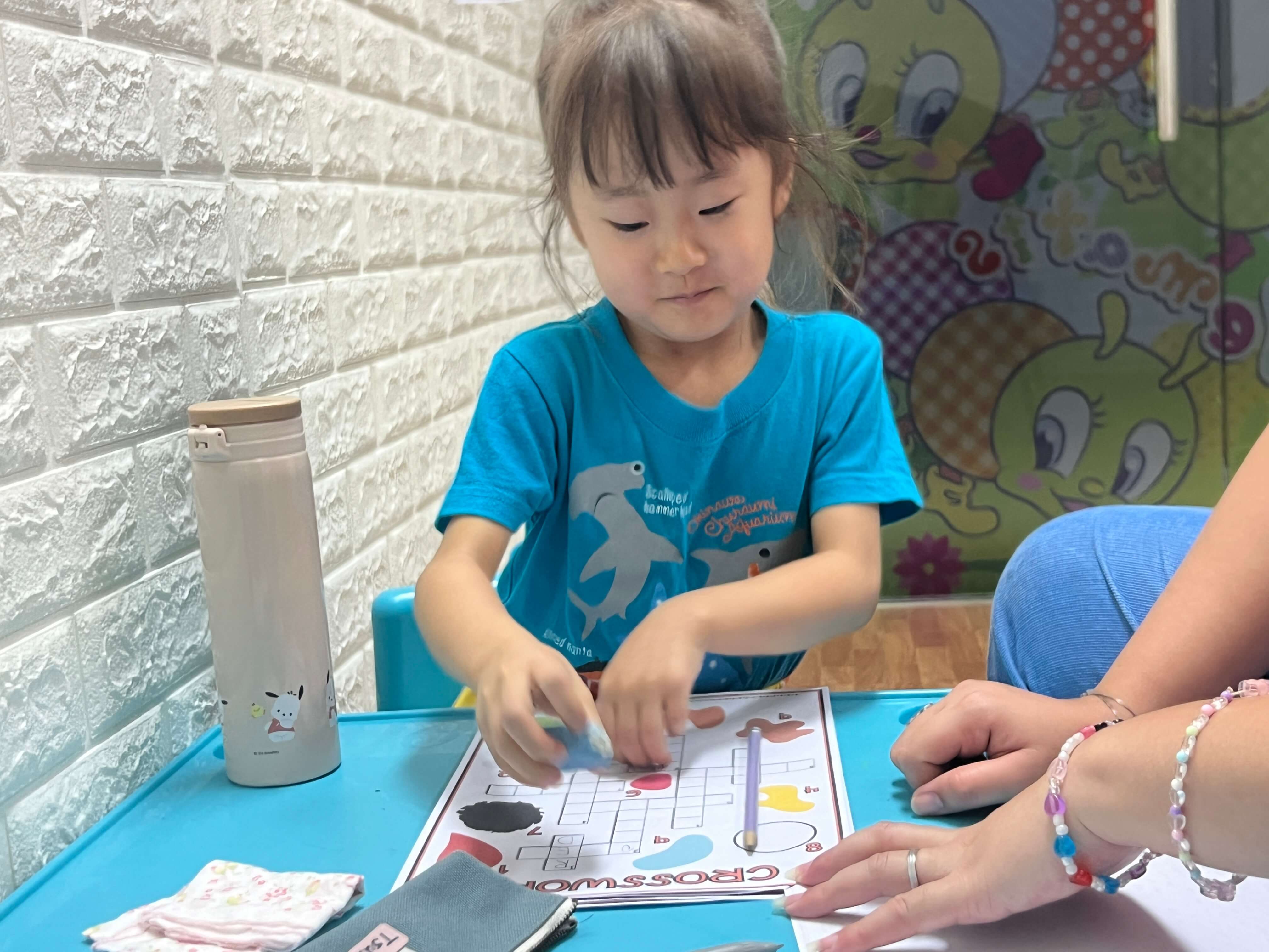キンダー英語クラスは、朝の歌やダンスから1日が楽しく始まります。出席のダイアリーを書いたあとは、デイリーフレーズを使ったゲームや絵本の読み聞かせ、フォニックスにチャレンジ!天候がいい日は、プールや公園で思いきり体を動かすリフレッシュタイムも!