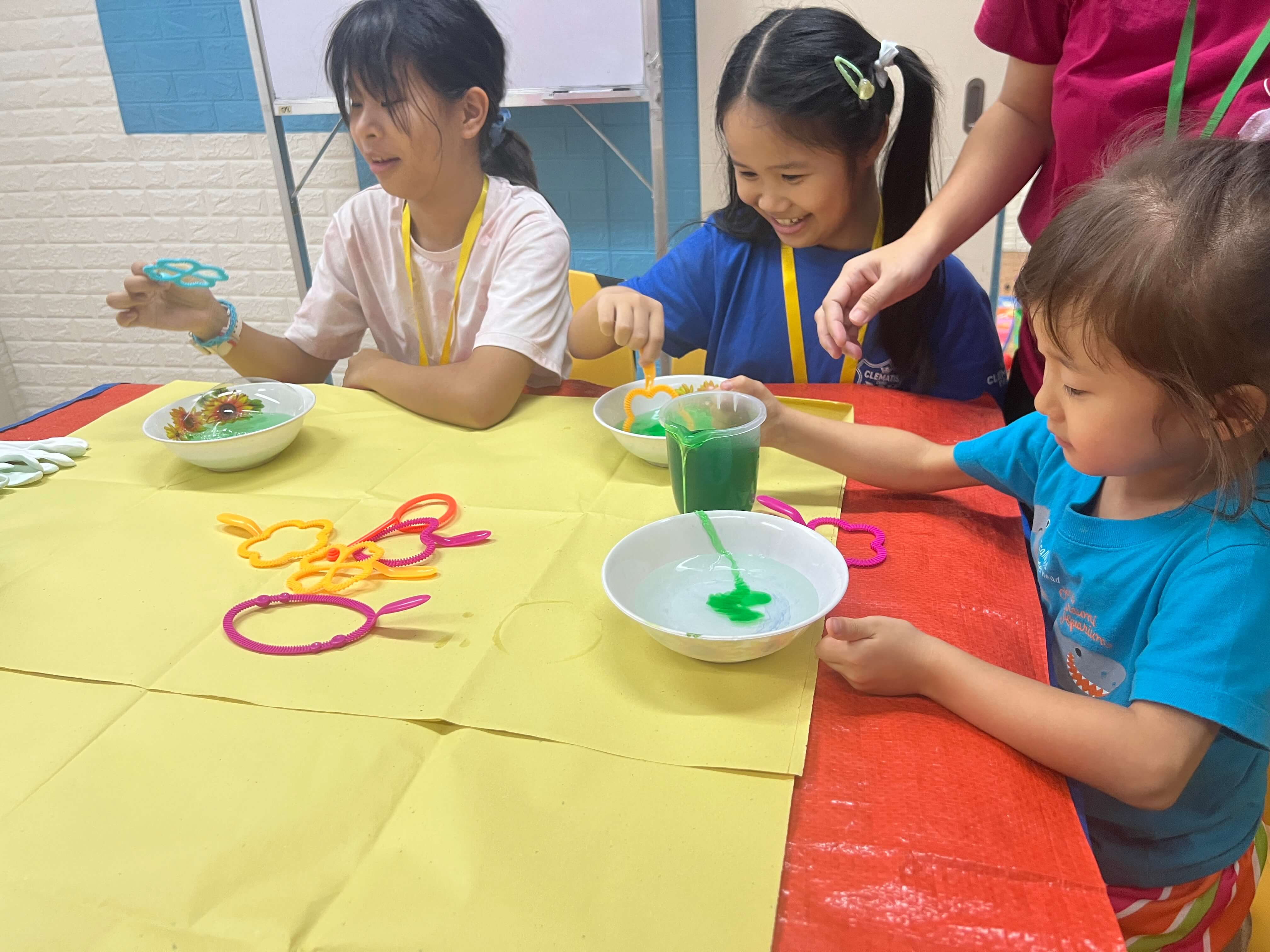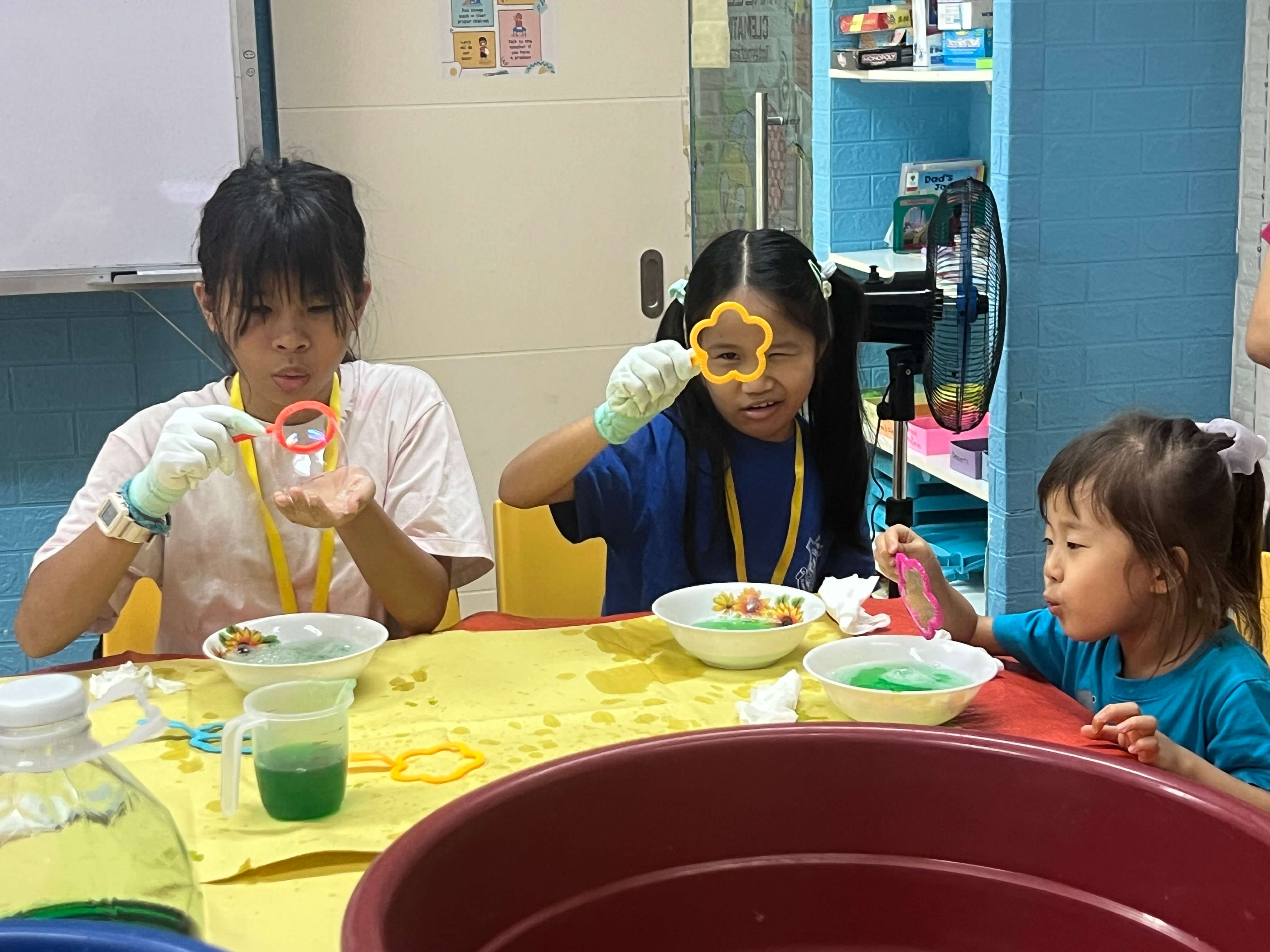 といった体験を通して、シャボン玉の大きさや割れにくさの違いを観察します。