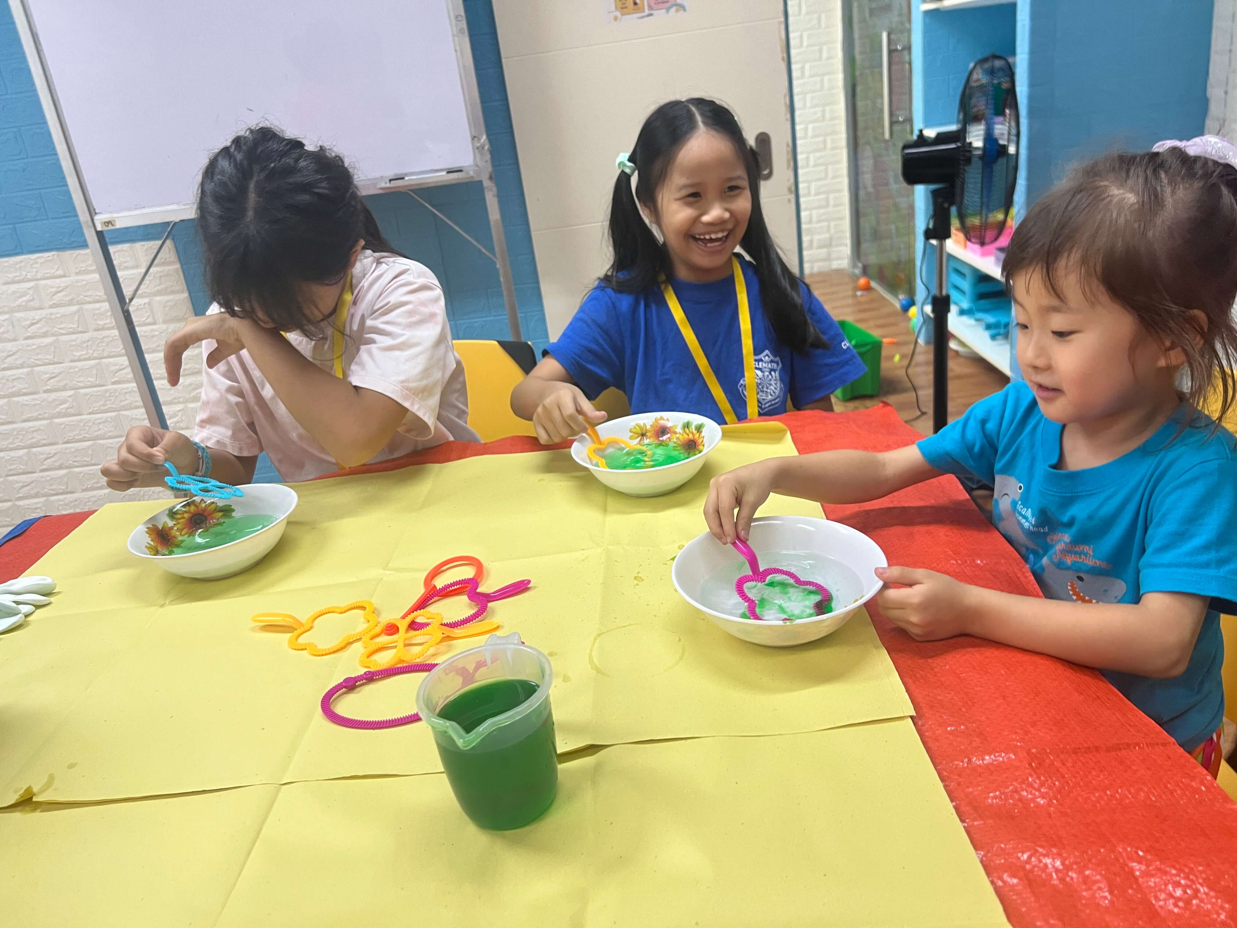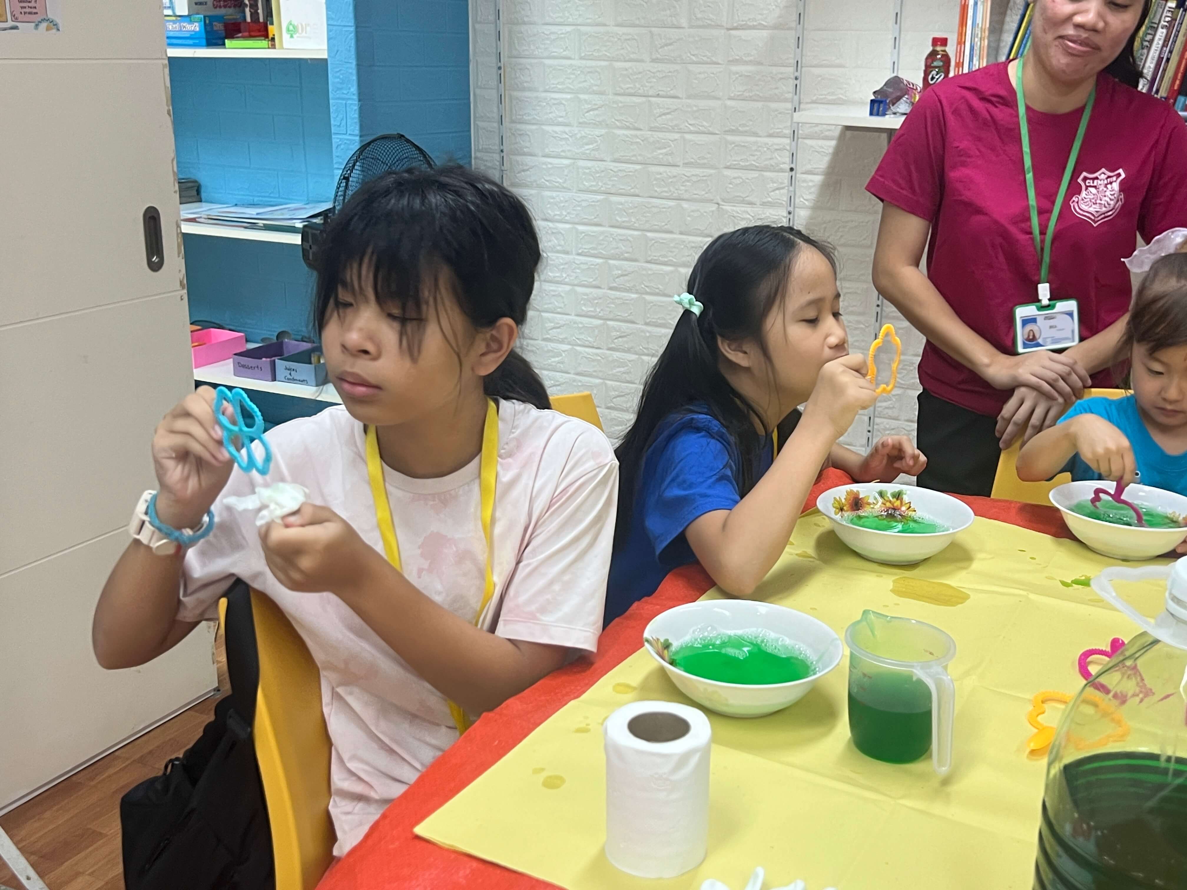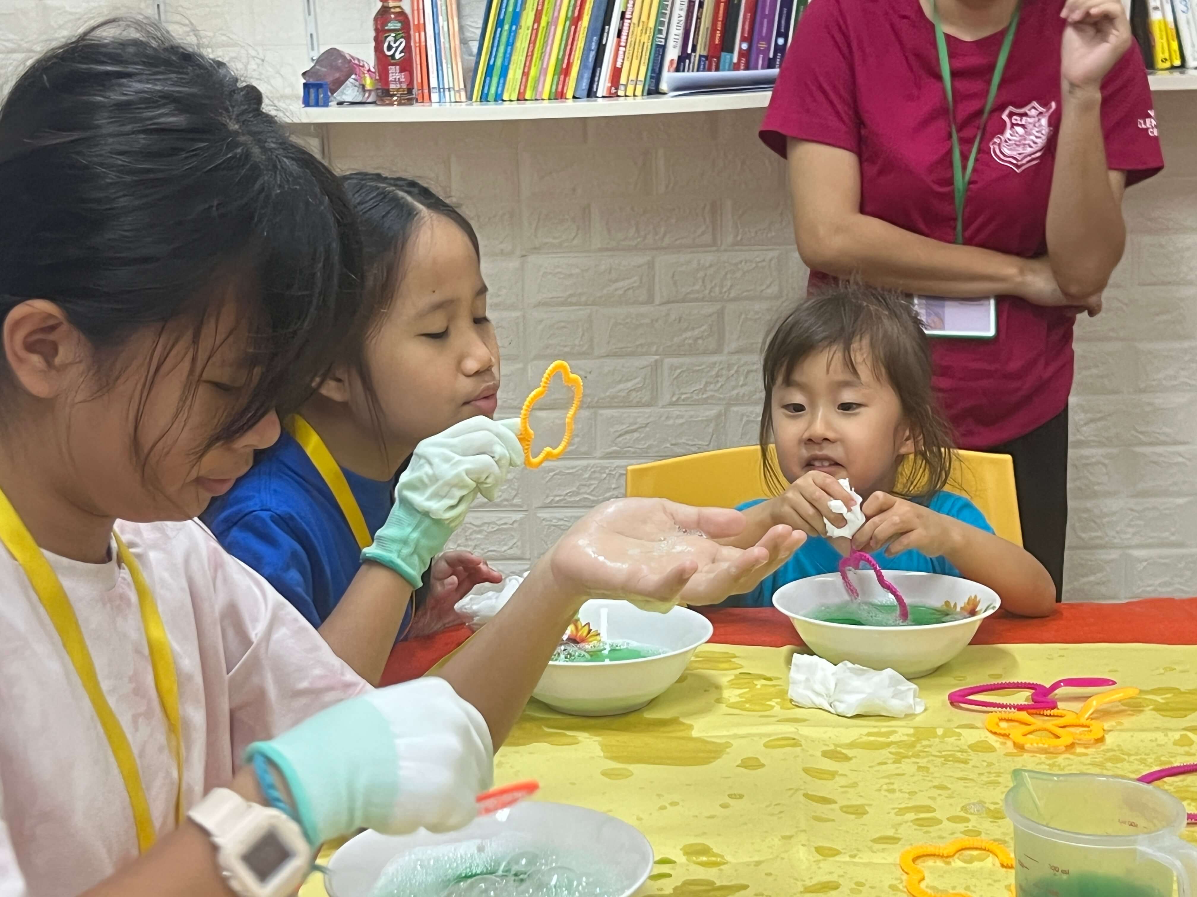子どもたちはまず、シャボン玉を作りながら「どうして丸くなるの?」「大きくするには?」と、自然に疑問を持つところからスタート!(^^)!