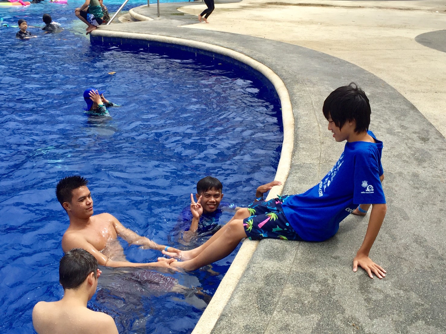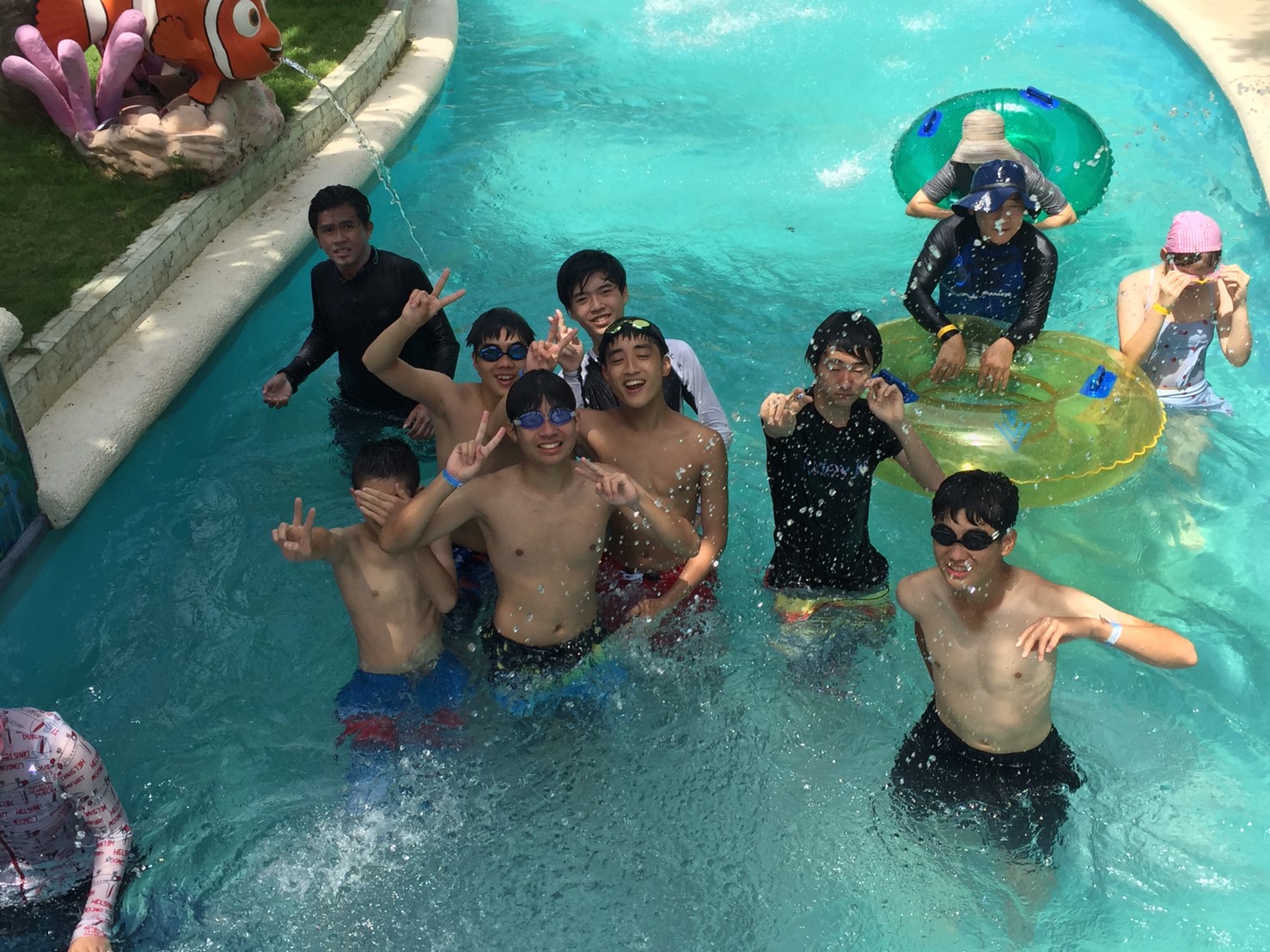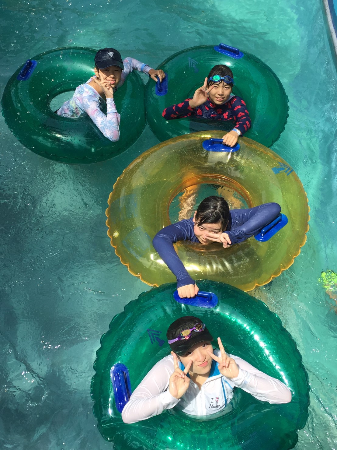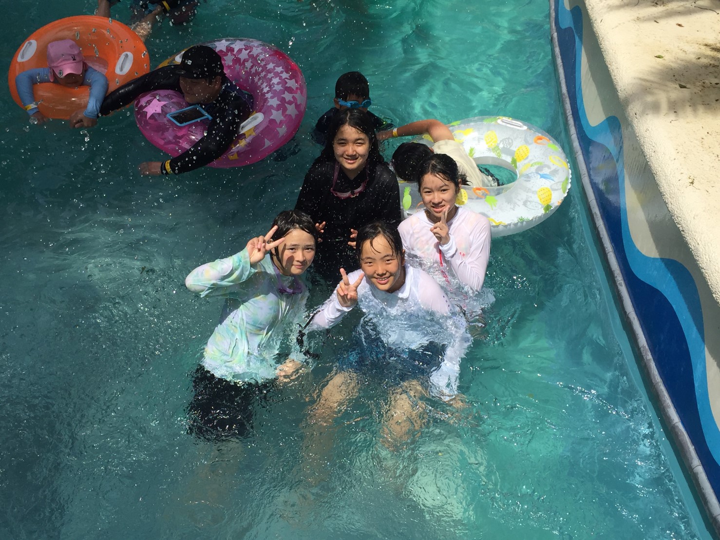 到着してすぐ水着に着替えて、同じグループのお友達やガーディアン講師と一緒にウォーターパークのプールで遊びました。午前中はずっとプールに入って楽しい時間を過ごしました。)