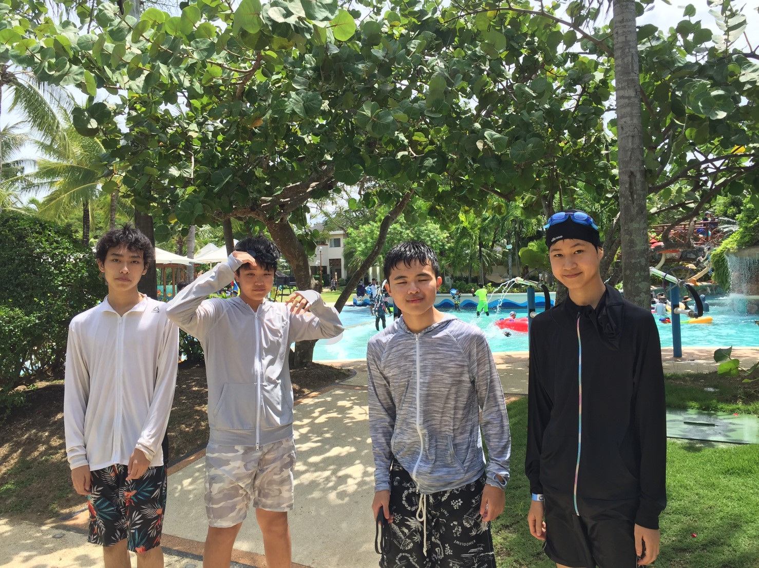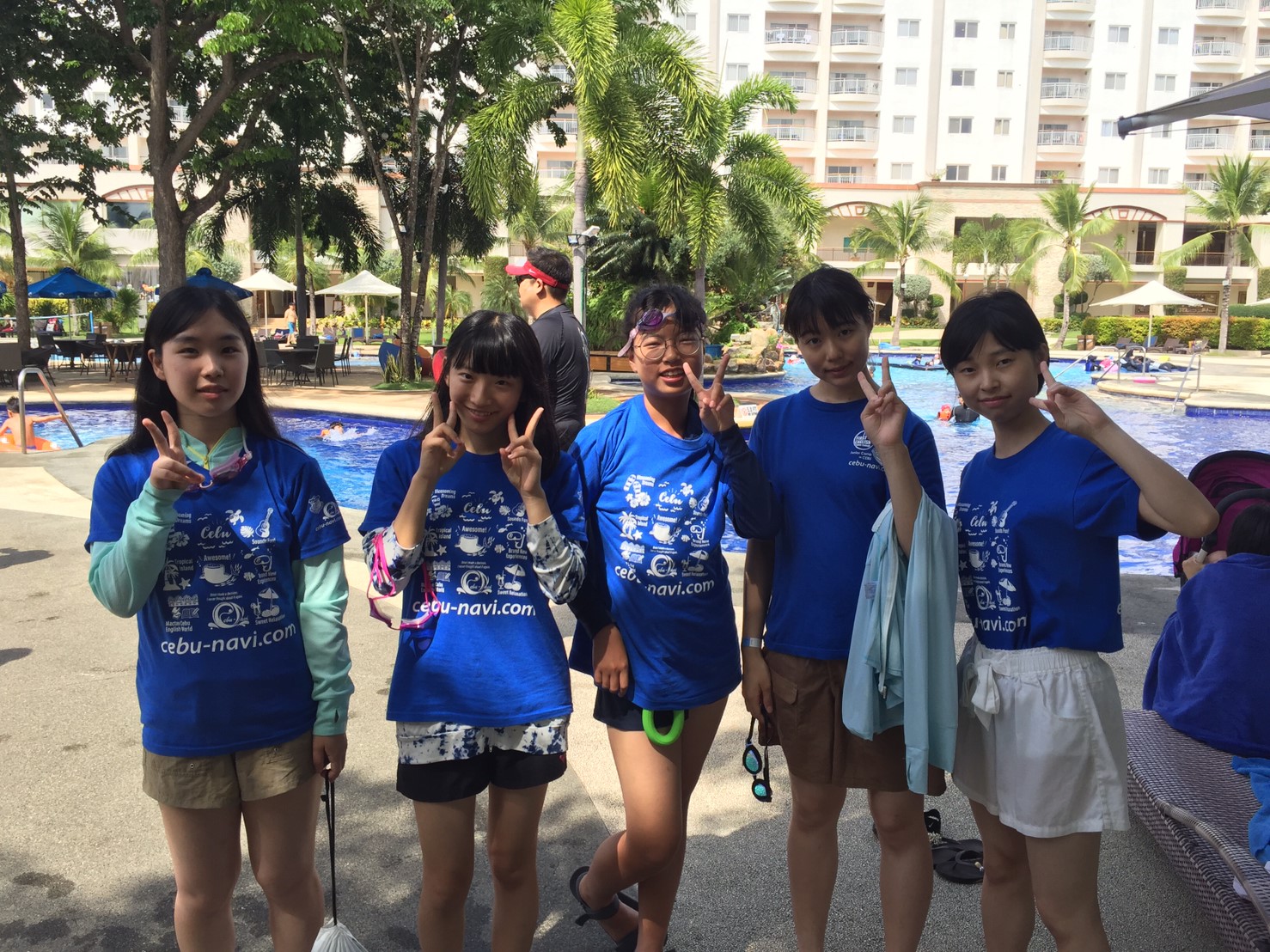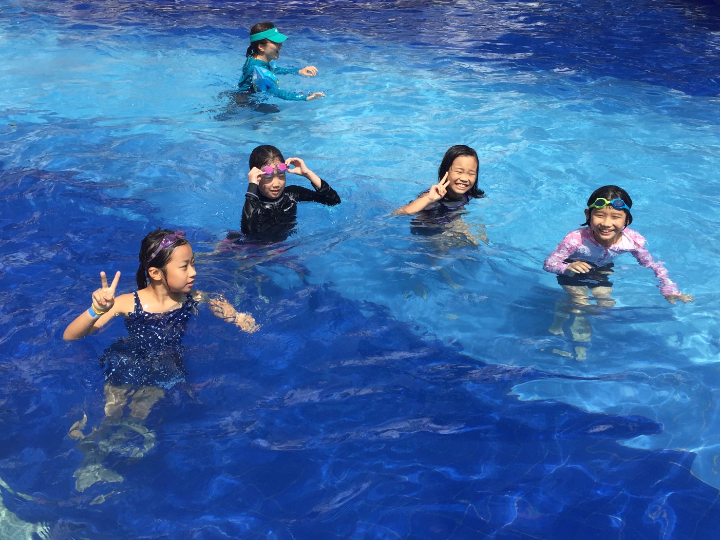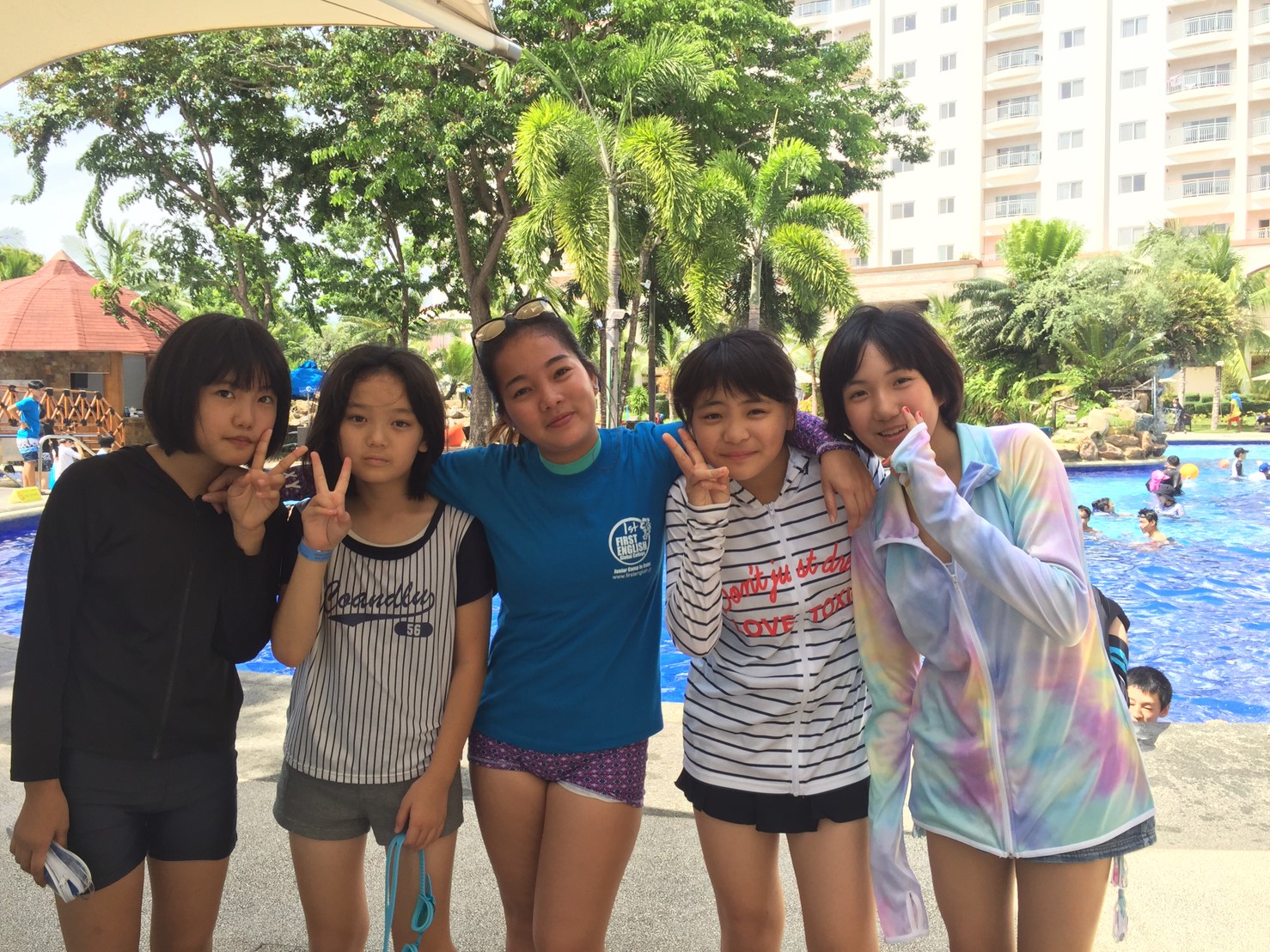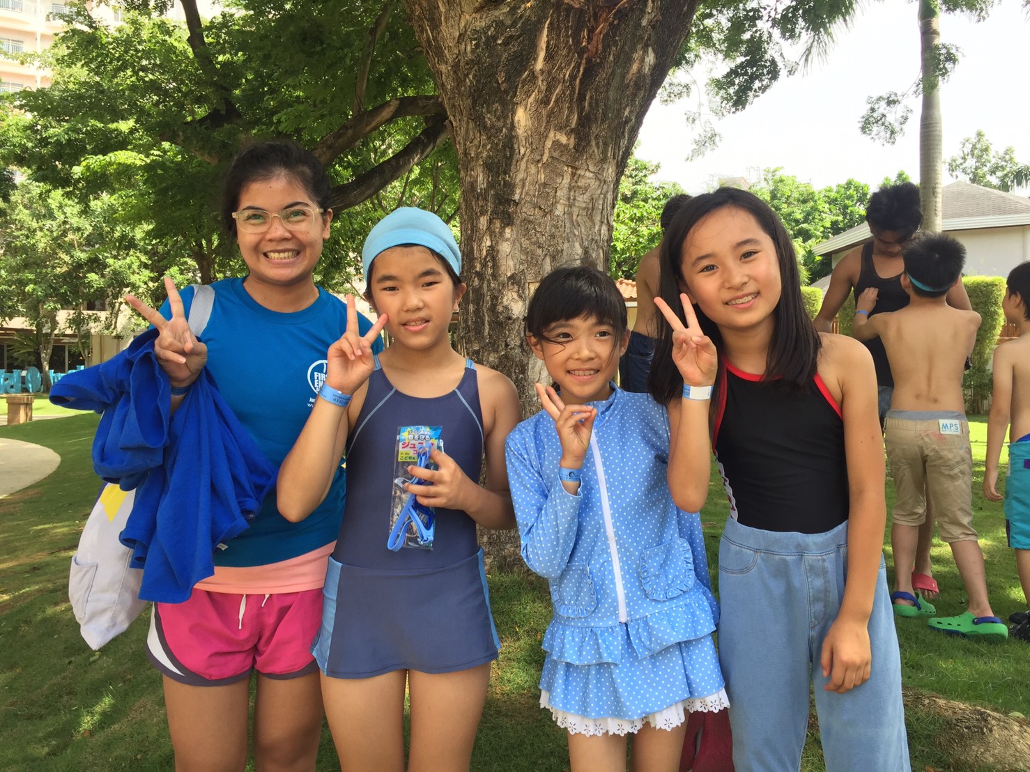 到着してすぐ水着に着替えて、同じグループのお友達やガーディアン講師と一緒にウォーターパークのプールで遊びました。午前中はずっとプールに入って楽しい時間を過ごしました。)