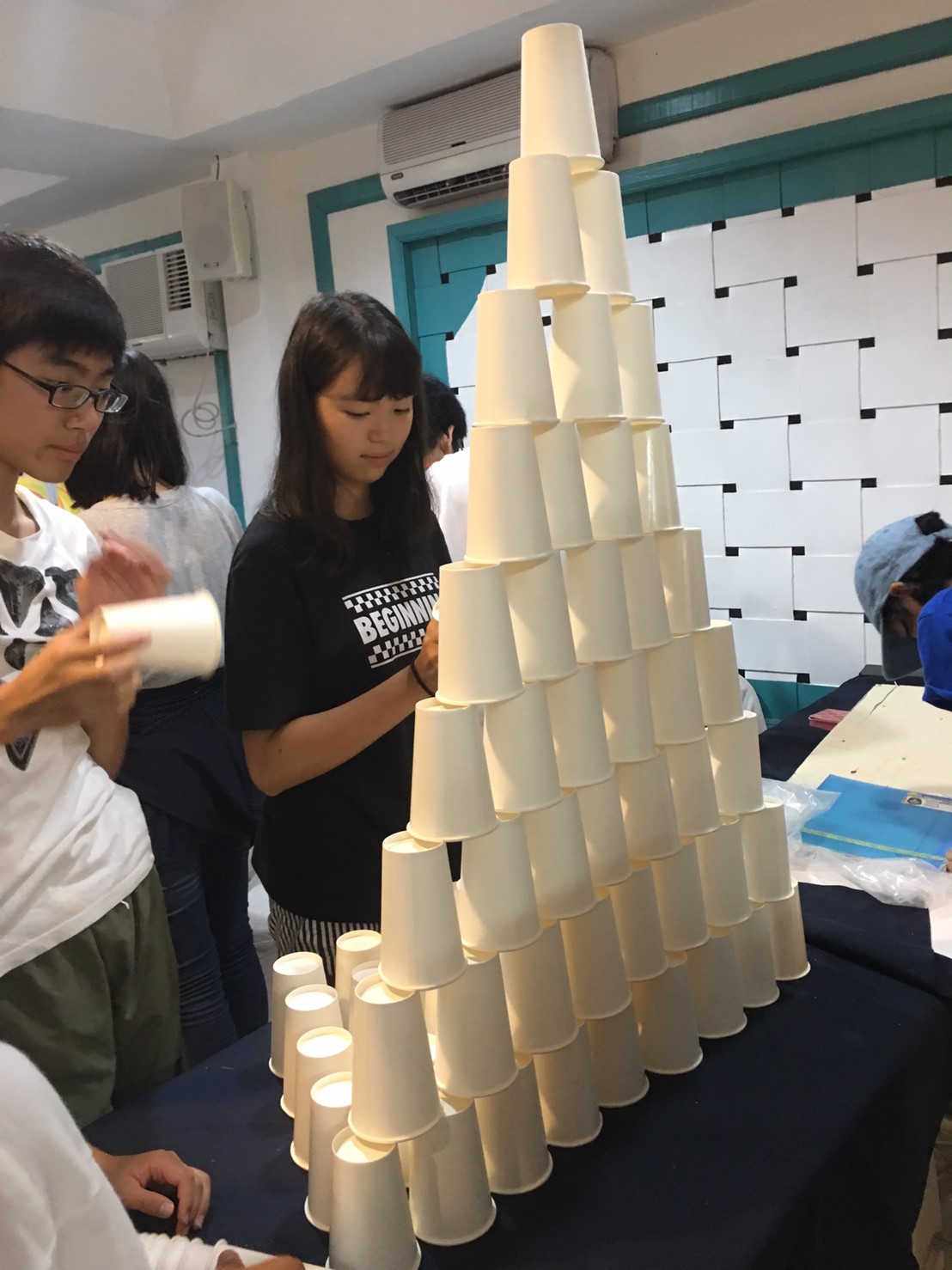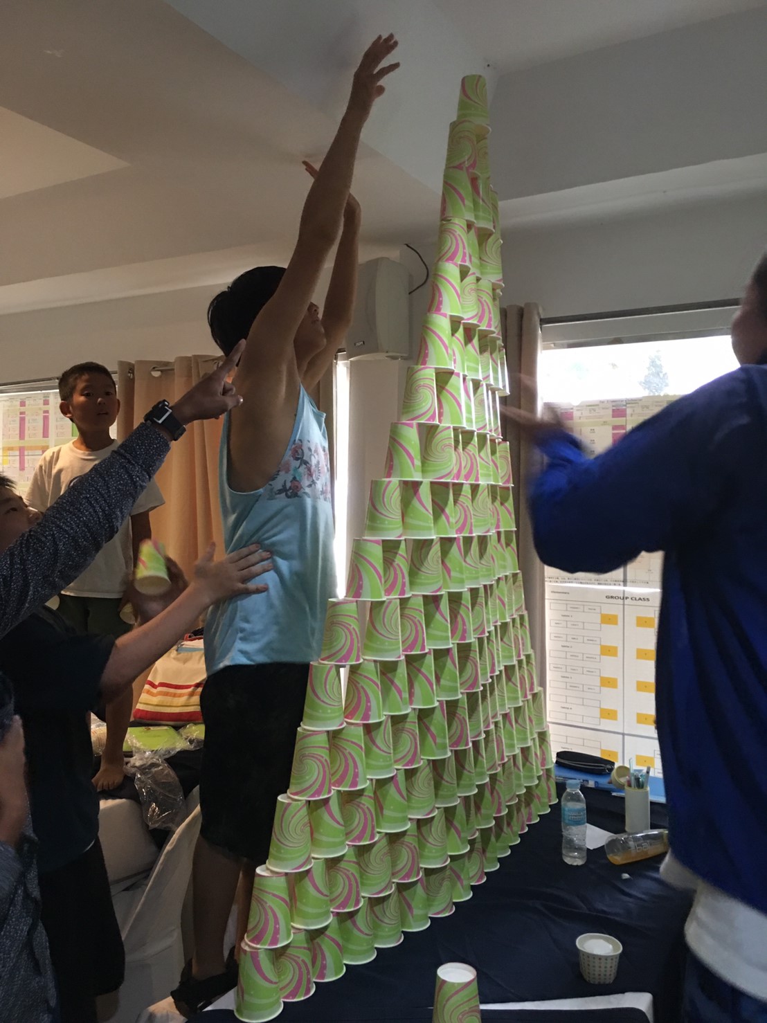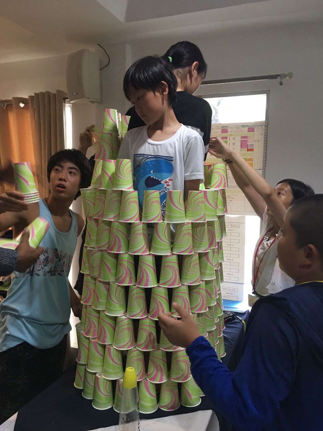 同じ大きさの紙コップを使って、どこまで高いタワーができるか、